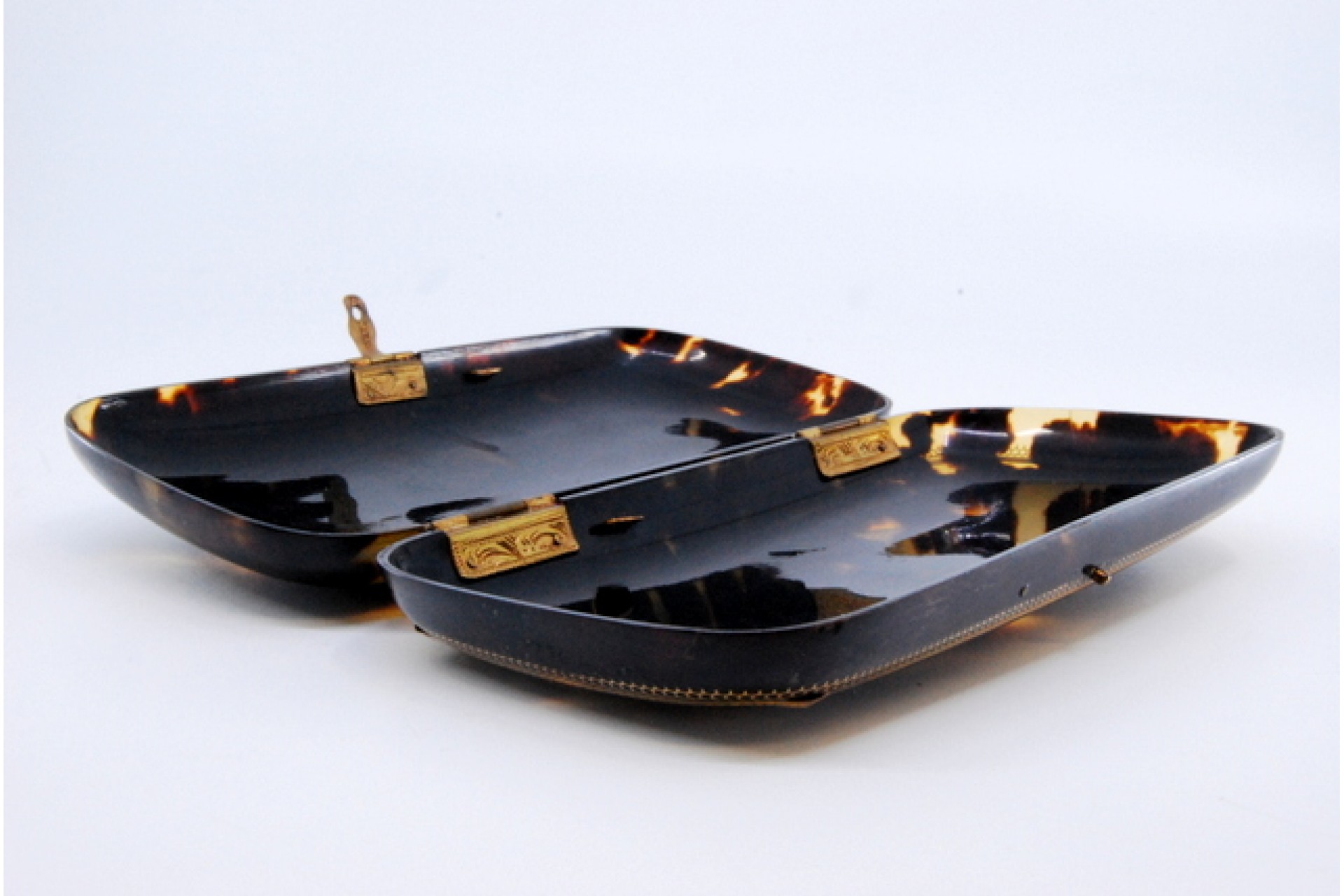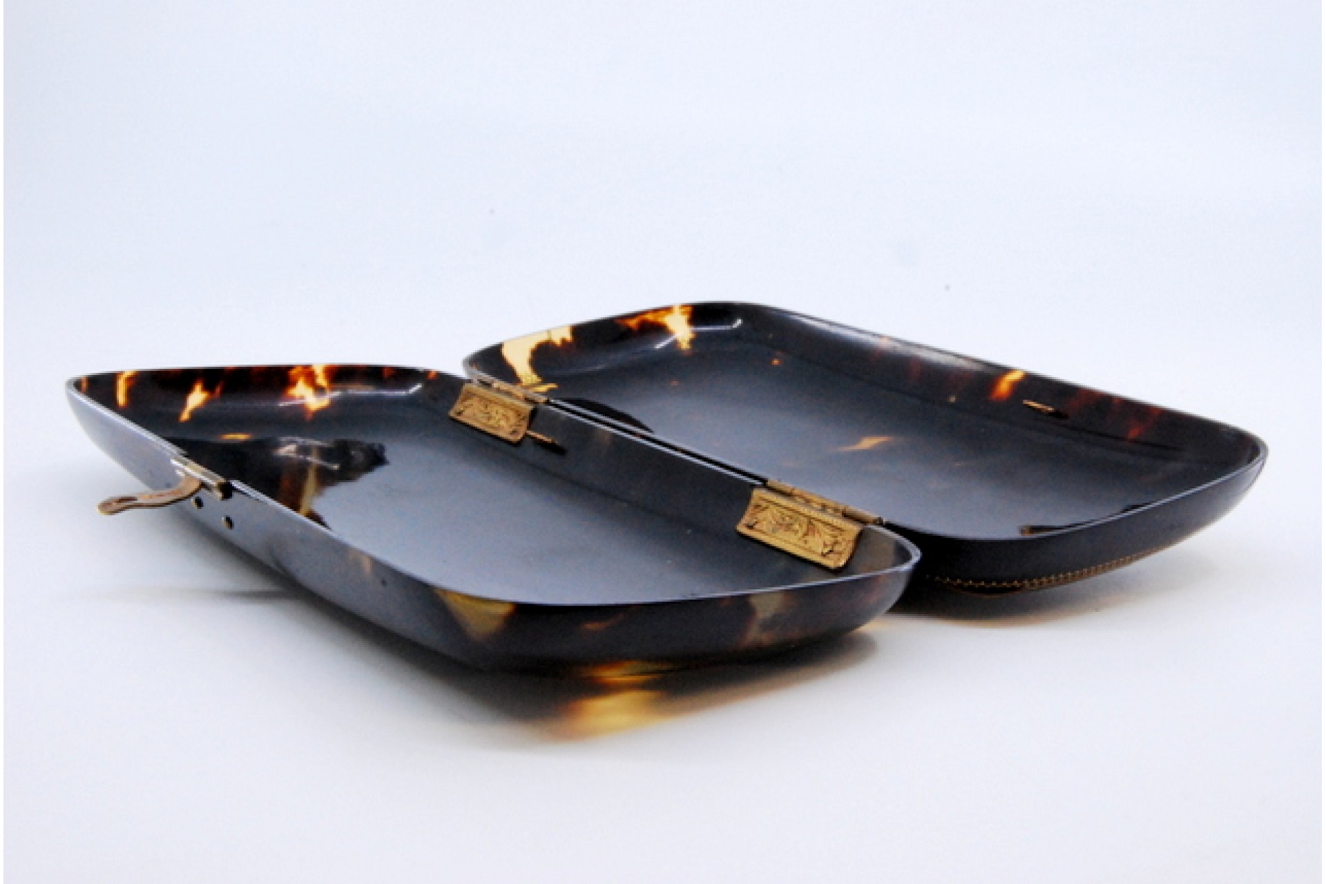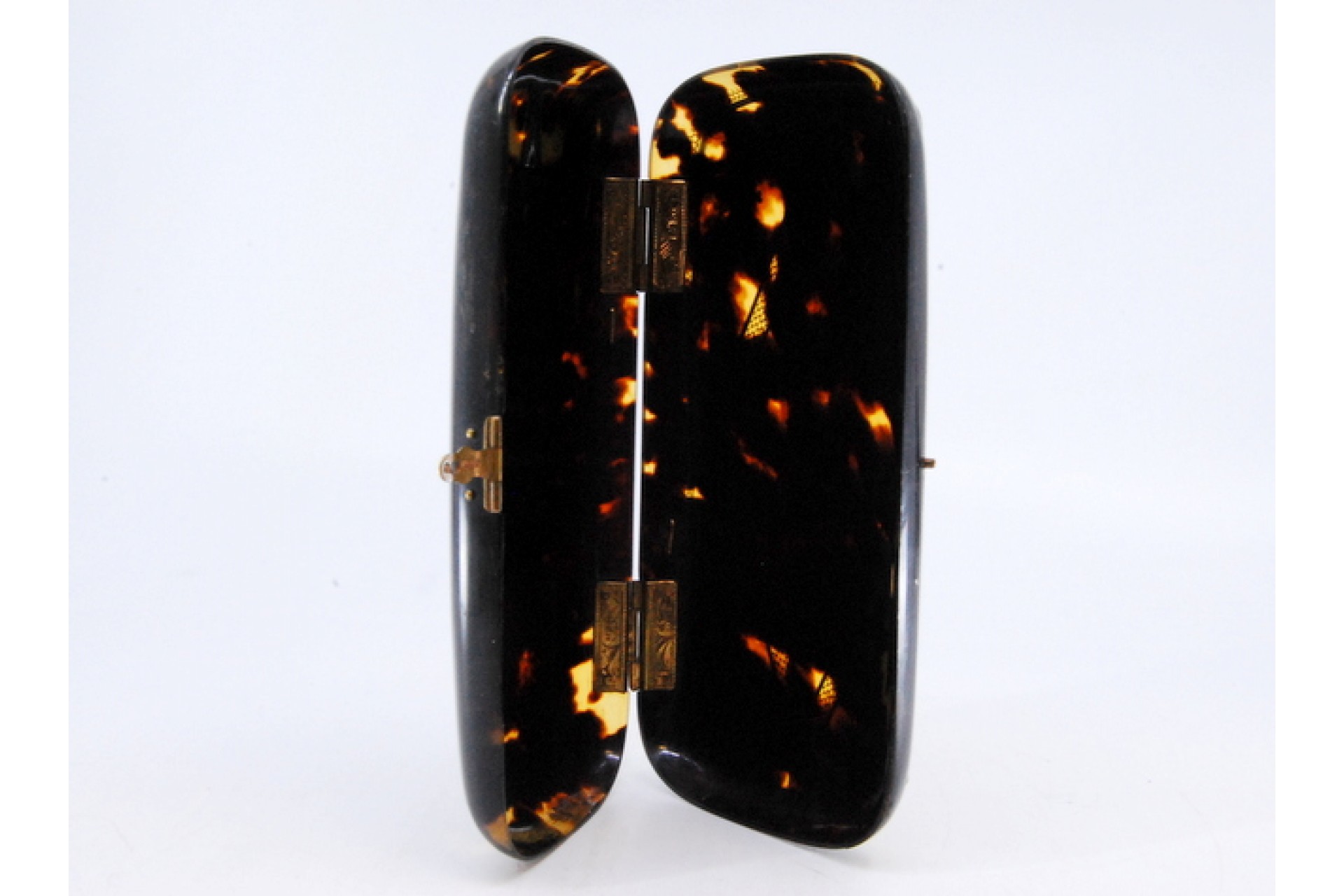 • Descrição: Caixa para óculos em tartaruga e aplicações em ouro, monogramada no centro.
