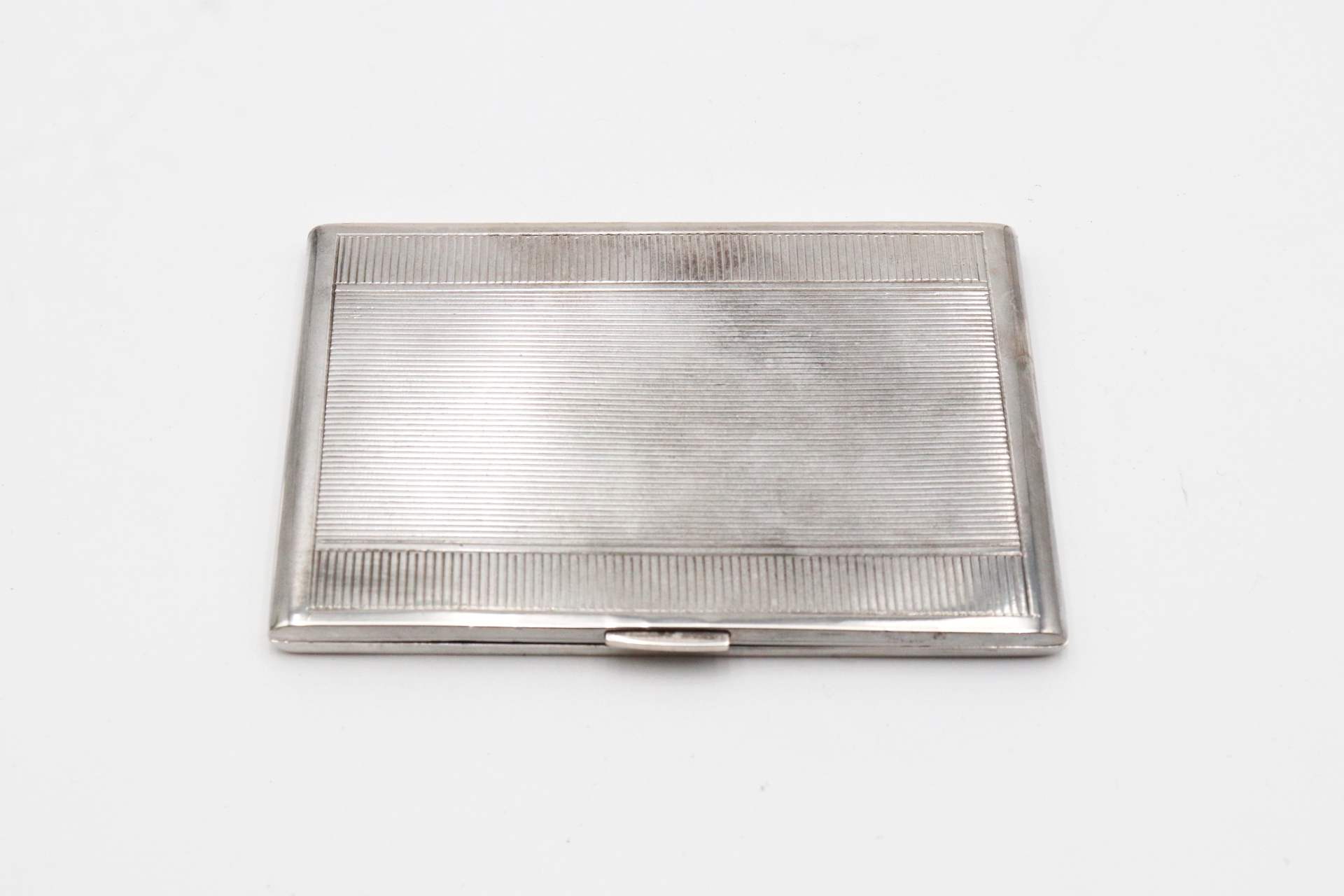 Cigarreira de prata guilhochada com frisos relevados e tampa basculante.
