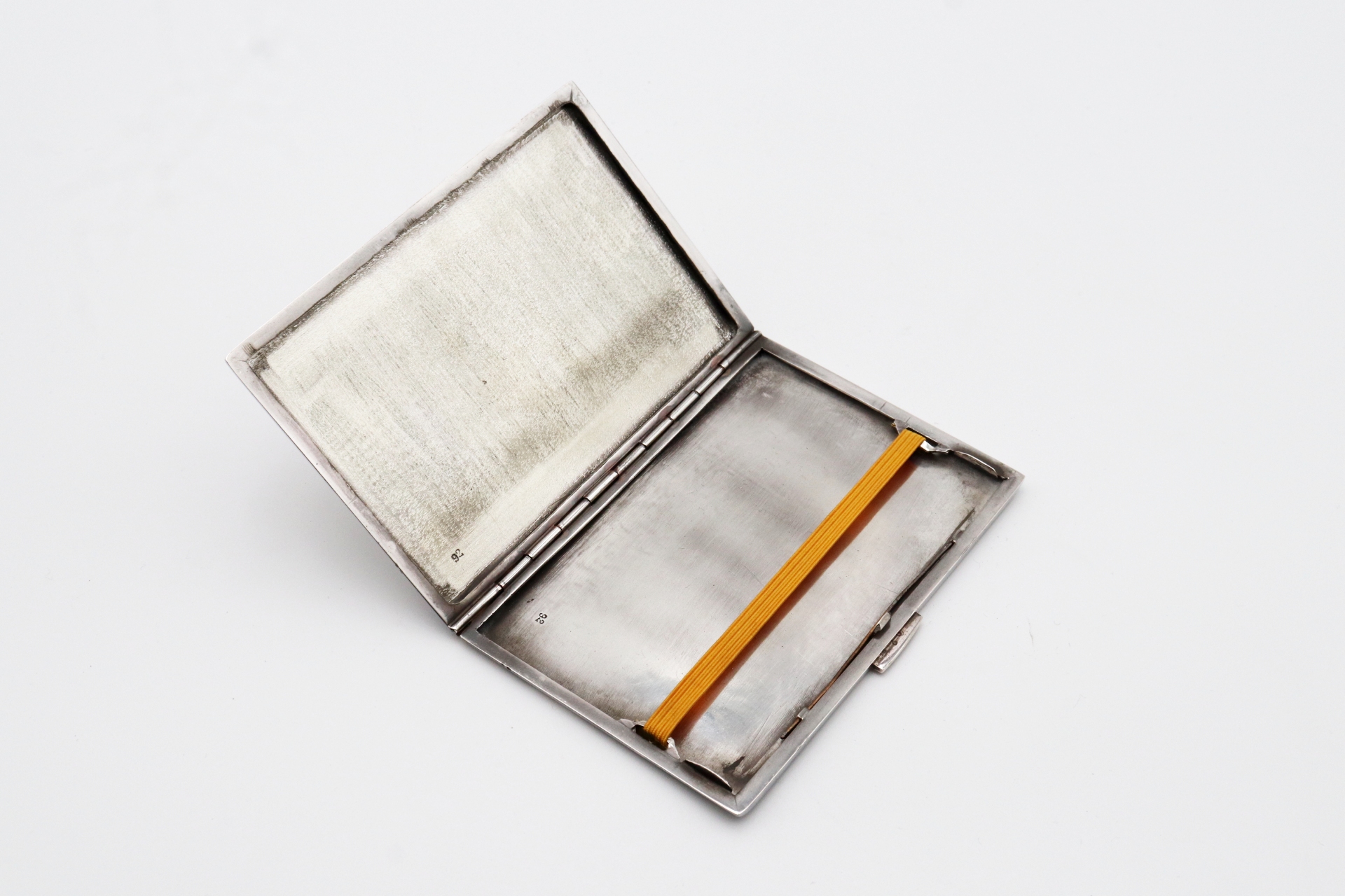 • Descrição: Cigarreira de prata guilhochada com frisos relevados e tampa basculante.
