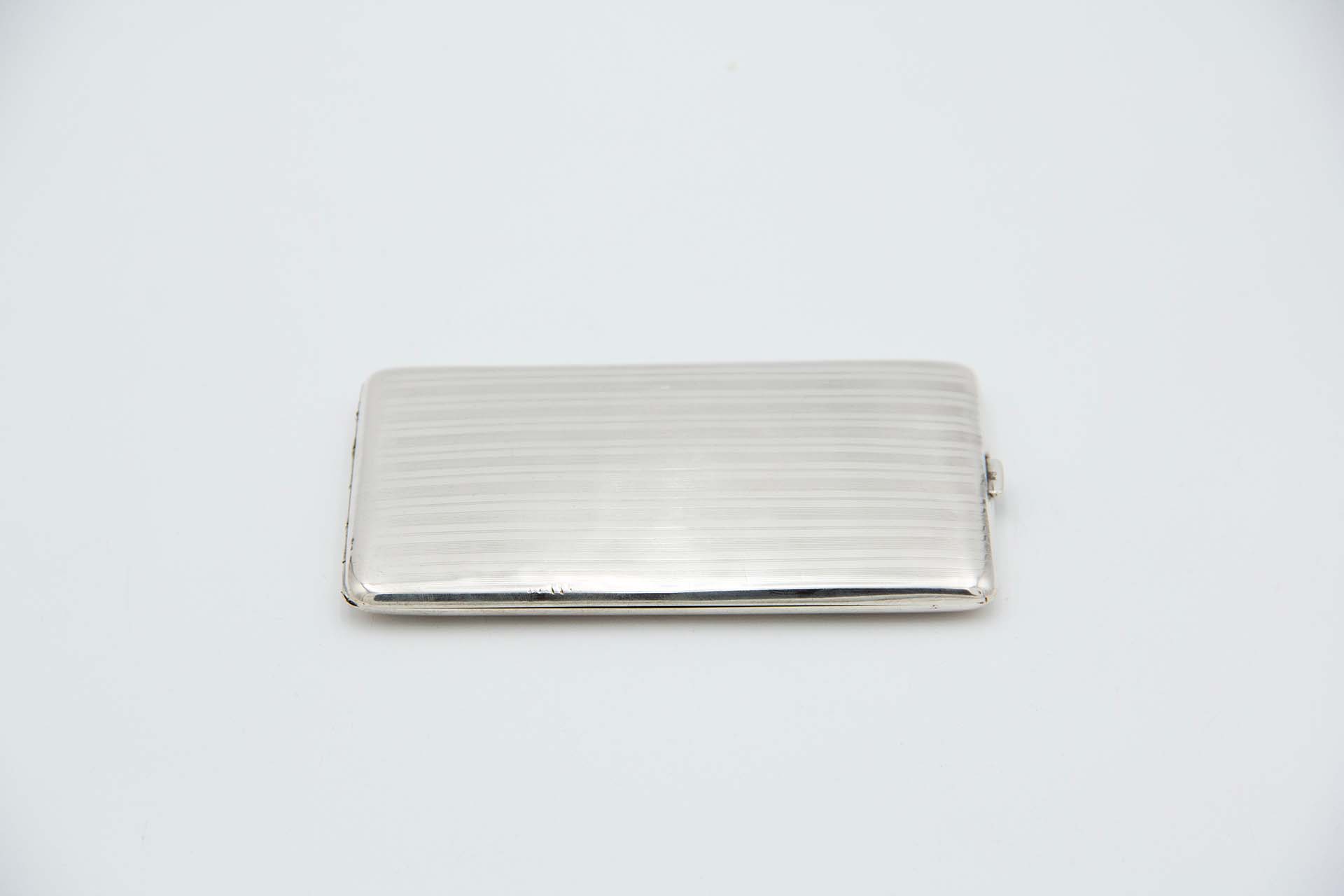 • Descrição: Cigarreira de prata retangular com bandas longitudinais na tampa basculante.