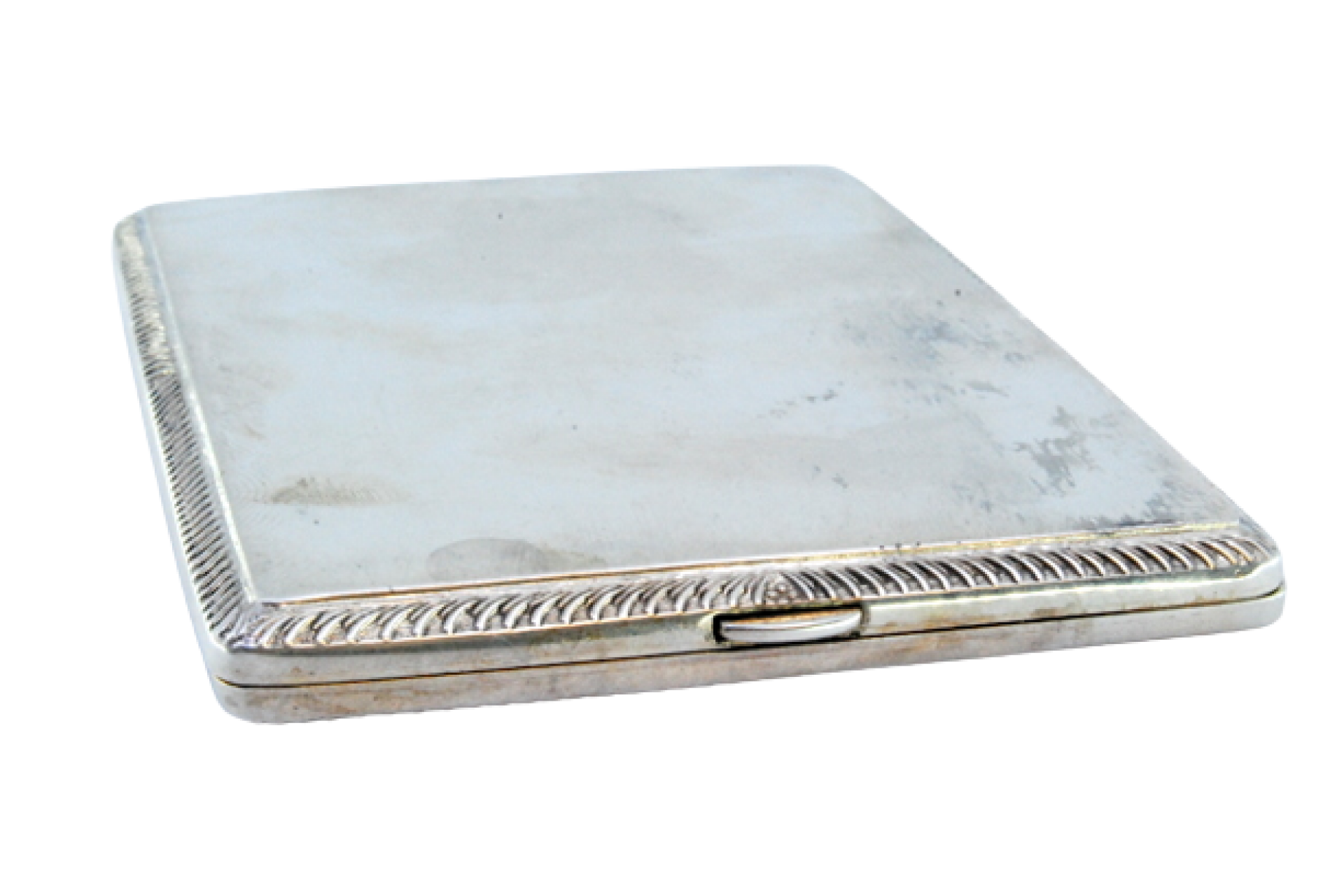 • Descrição: Cigarreira de prata foscada com frisos na envolvência, interior dourado e tampa basculante.