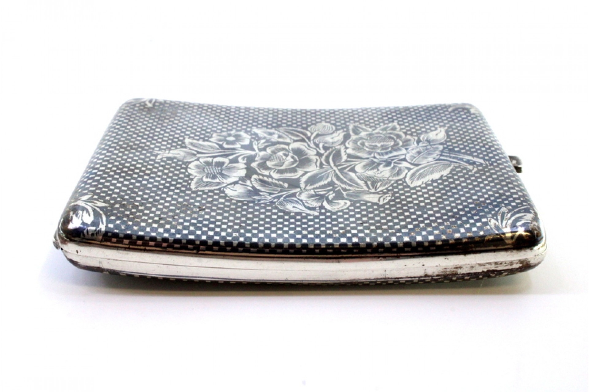 • Descrição: Cigarreira em prata nielada com flores e tampa basculante.