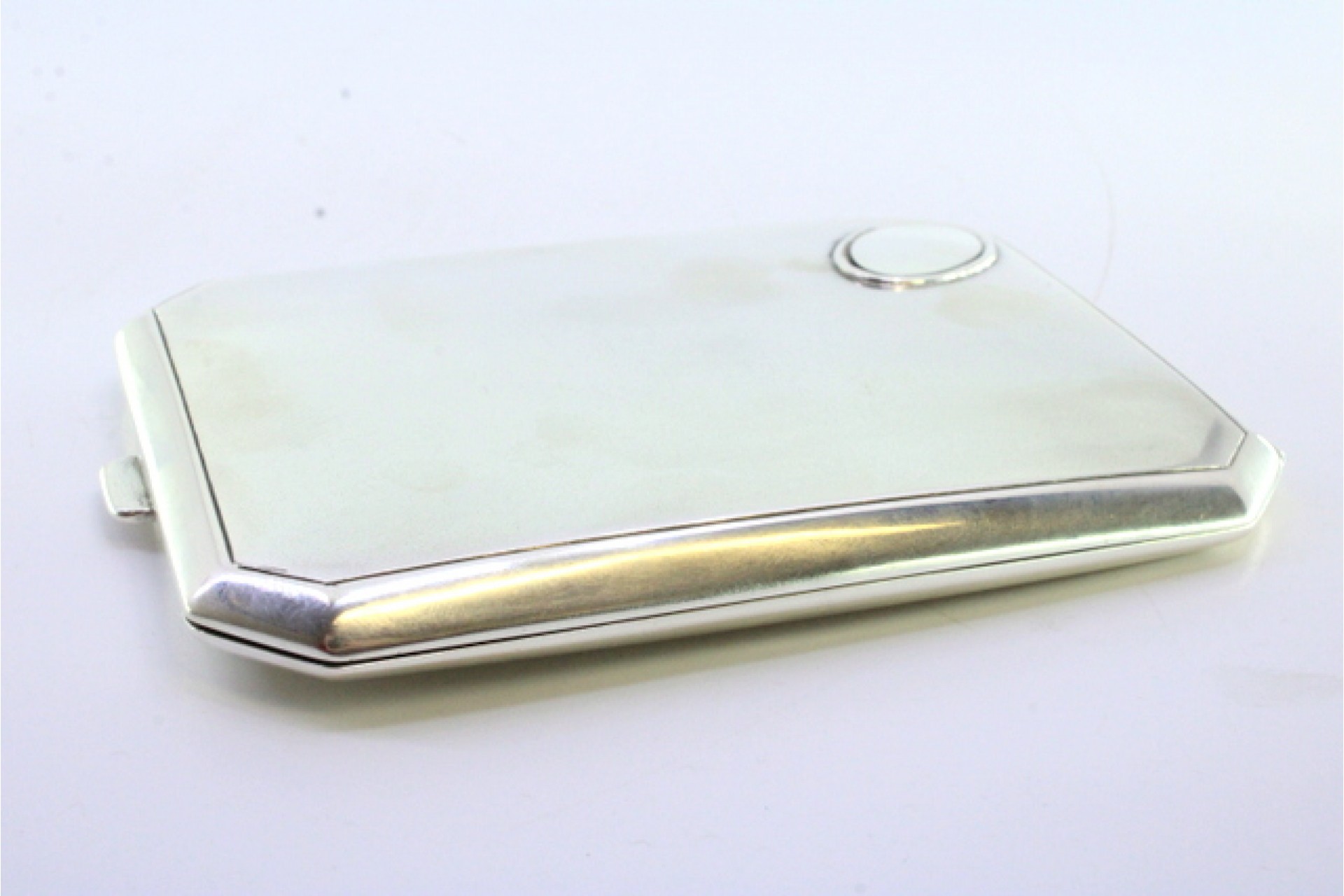 • Descrição: Cigarreira em prata fosca de cantos chanfrados, frisos envolvendo cartela para monograma e interior dourado.