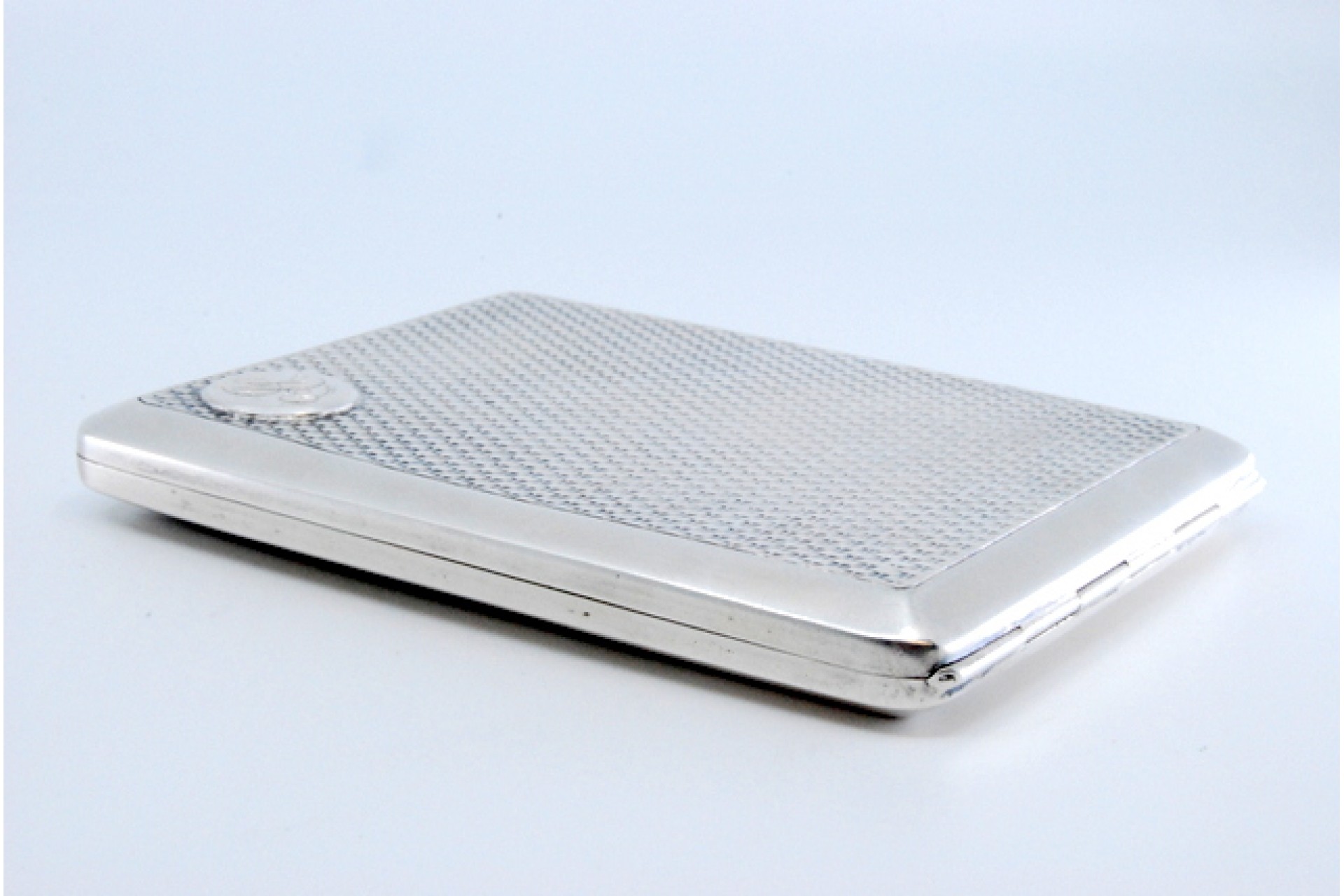 • Descrição: Cigarreira em prata guilhochada envolvendo cartela para monograma com interior dourado e tampa basculante.