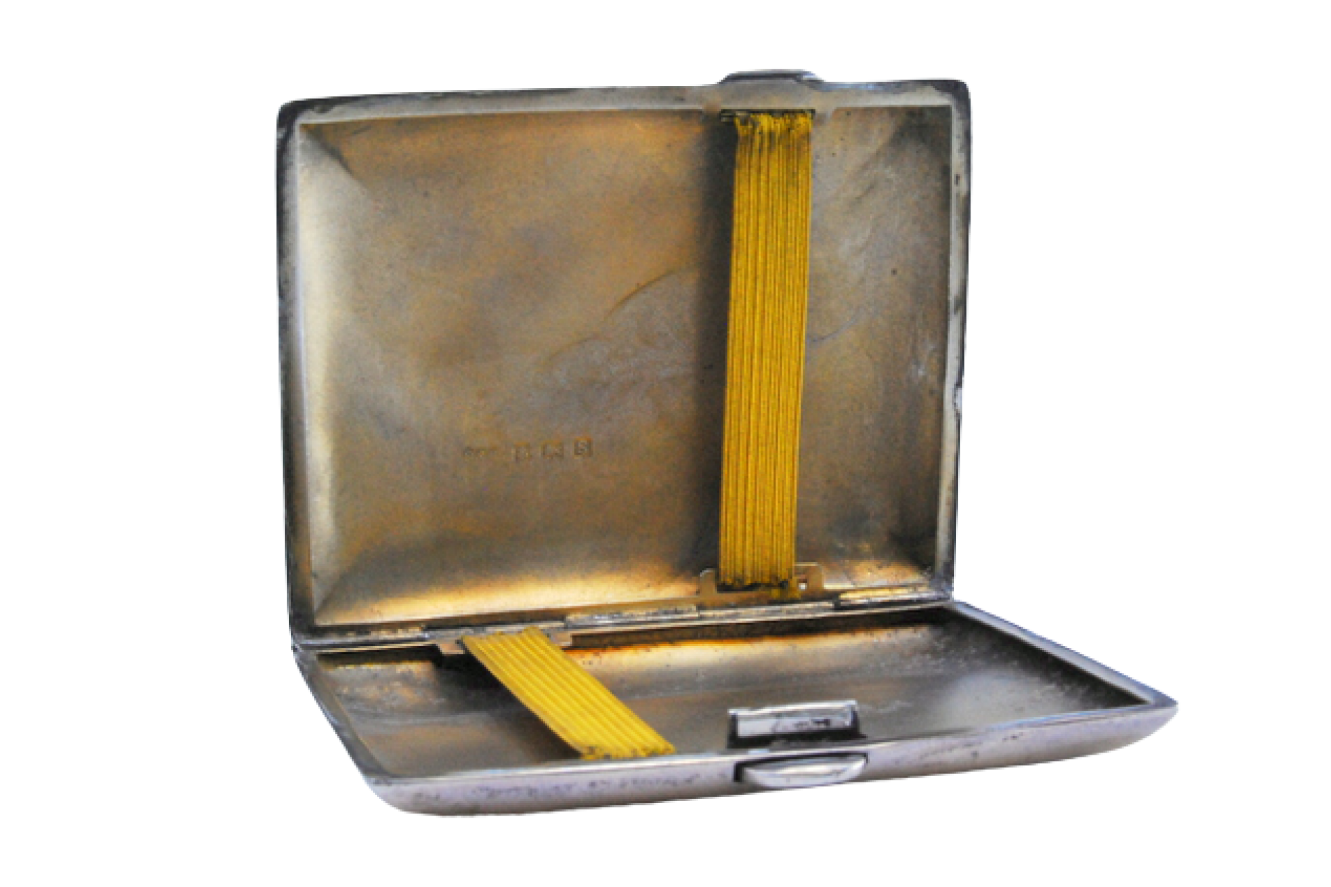 • Descrição: Cigarreira de prata com volutas gravadas de formato curvo e tampa basculante.