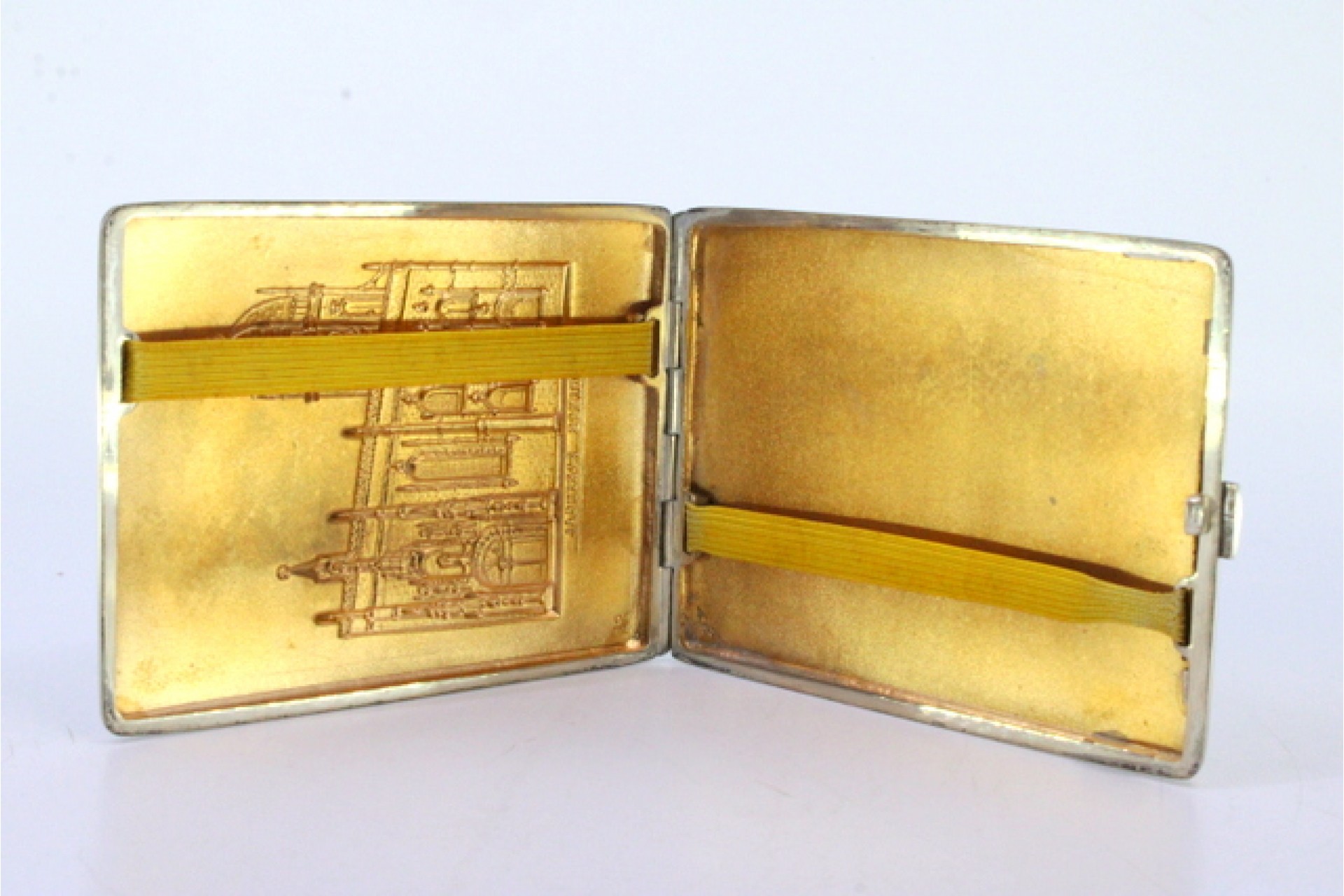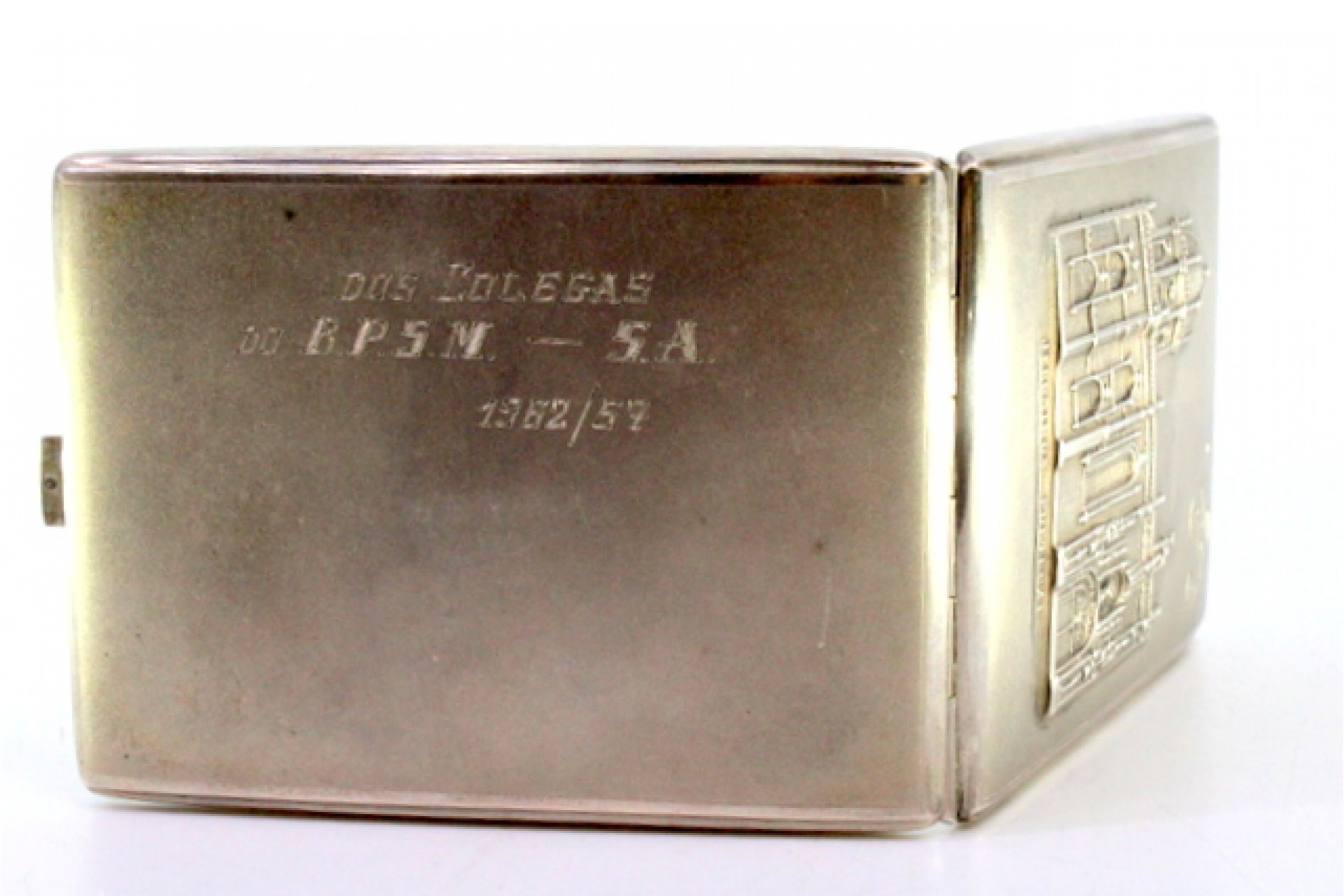 Cigarreira em prata com relevos alusivos ao Mosteiro dos Jerónimos e interior dourado com tampa basculante.