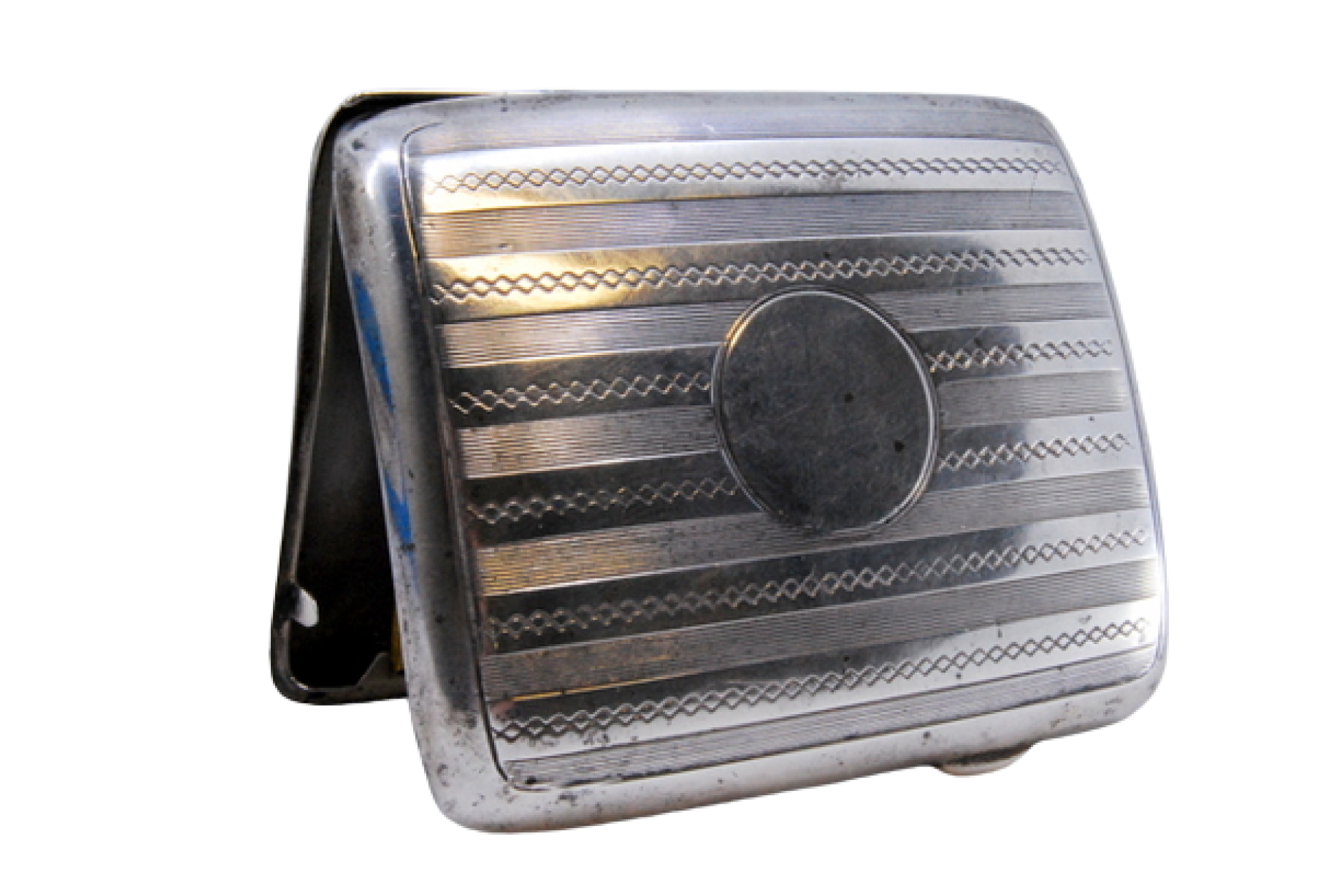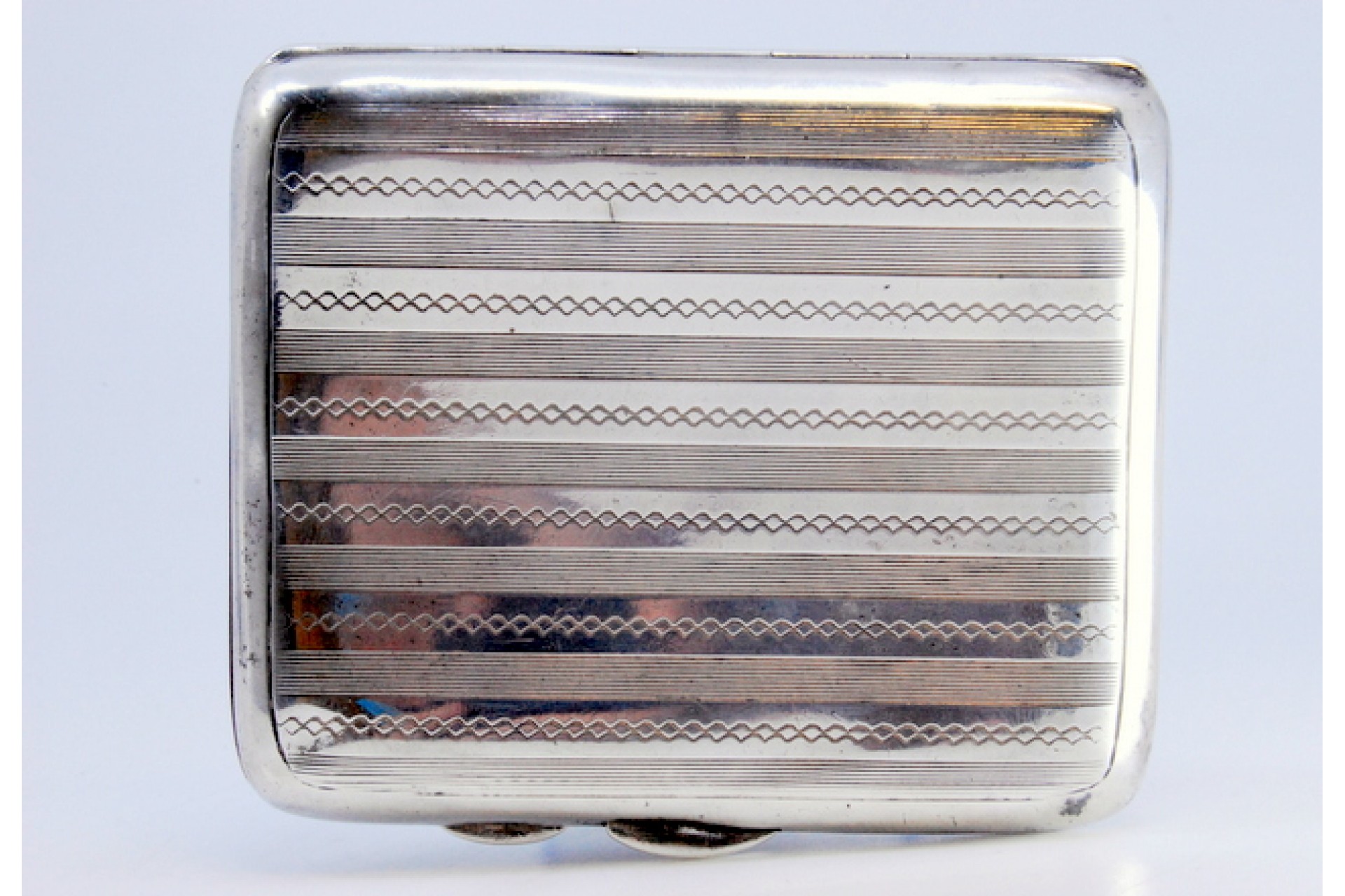 • Descrição: Cigarreira de prata guilhochada com bandas ao alto envolvendo cartela para monograma com suporte para os cigarros no interior e tampa basculante.