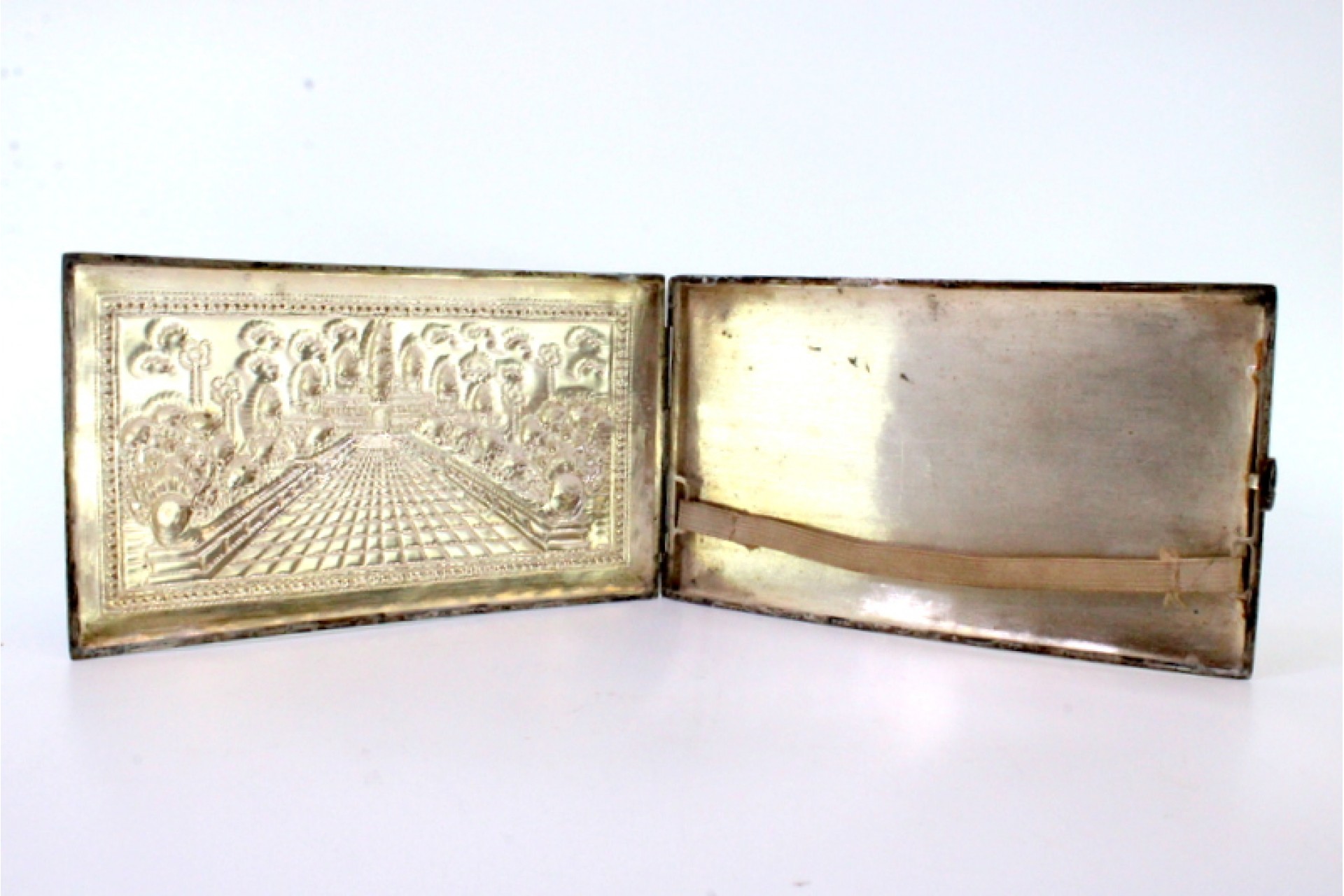 • Descrição: Cigarreira em prata de formato curvo com o Taj Mahal relevado em cercadura perlada.