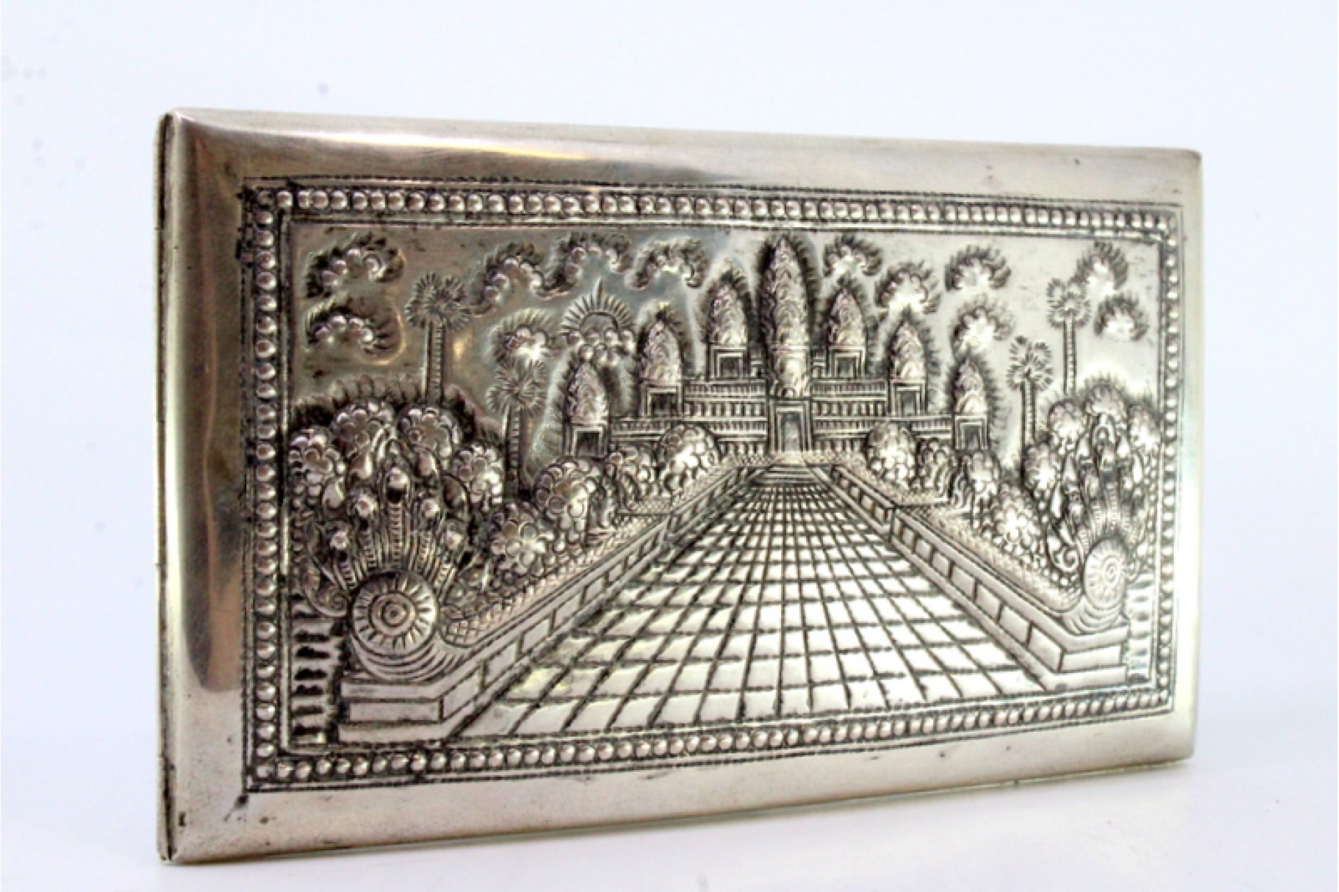 Cigarreira em prata de formato curvo com o Taj Mahal relevado em cercadura perlada.