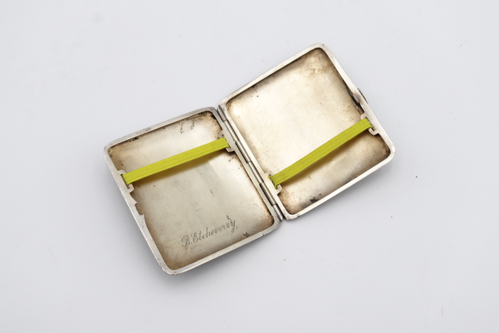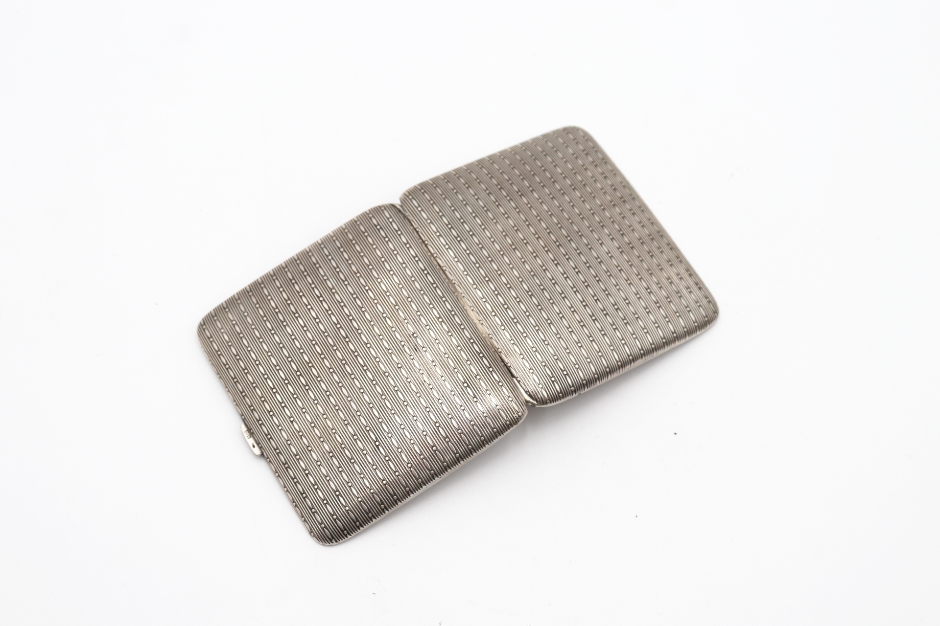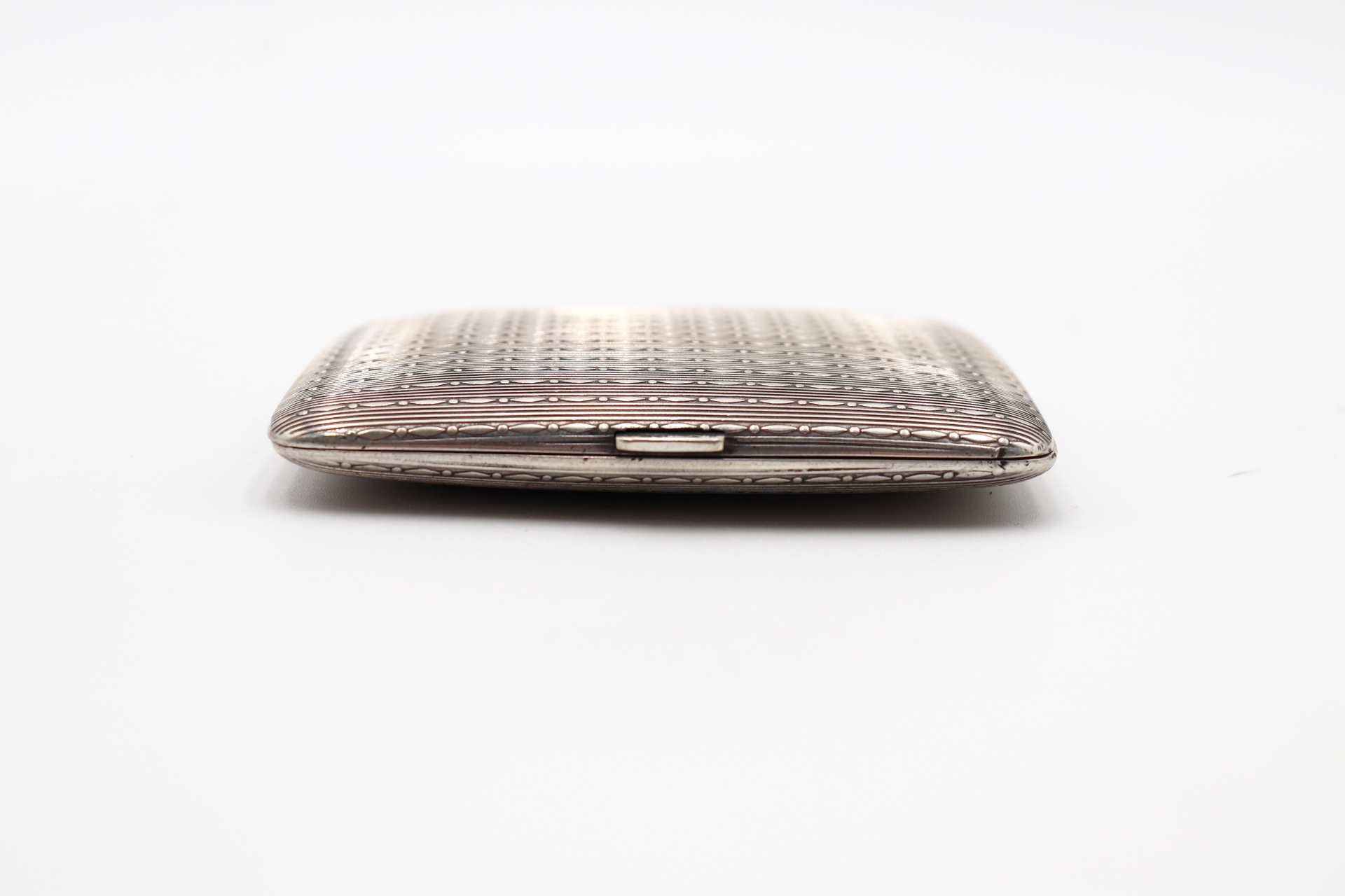 • Descrição: Cigarreira em prata de bandas guilhochadas, tampa de mola e fita dupla interior