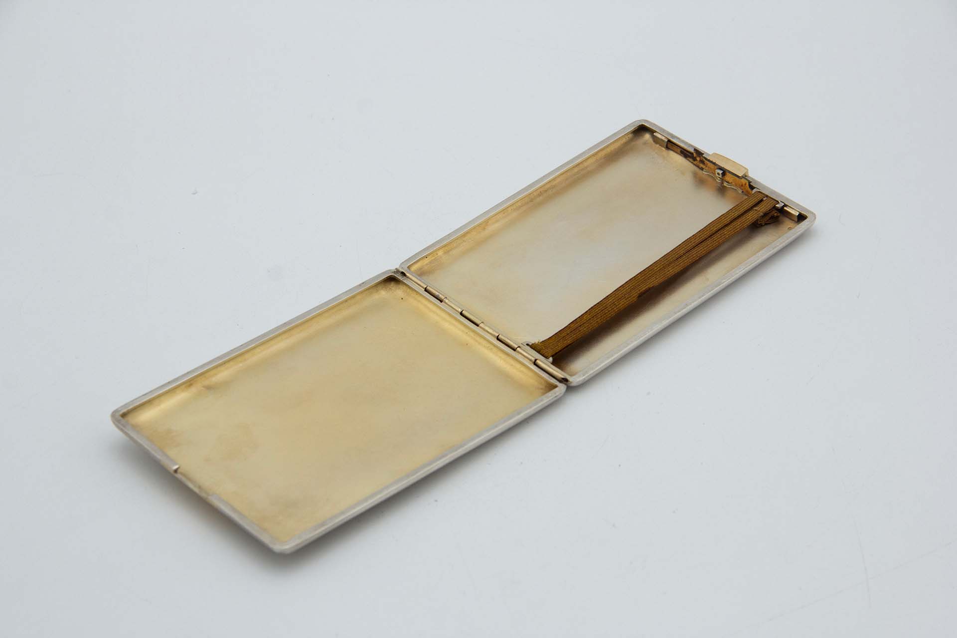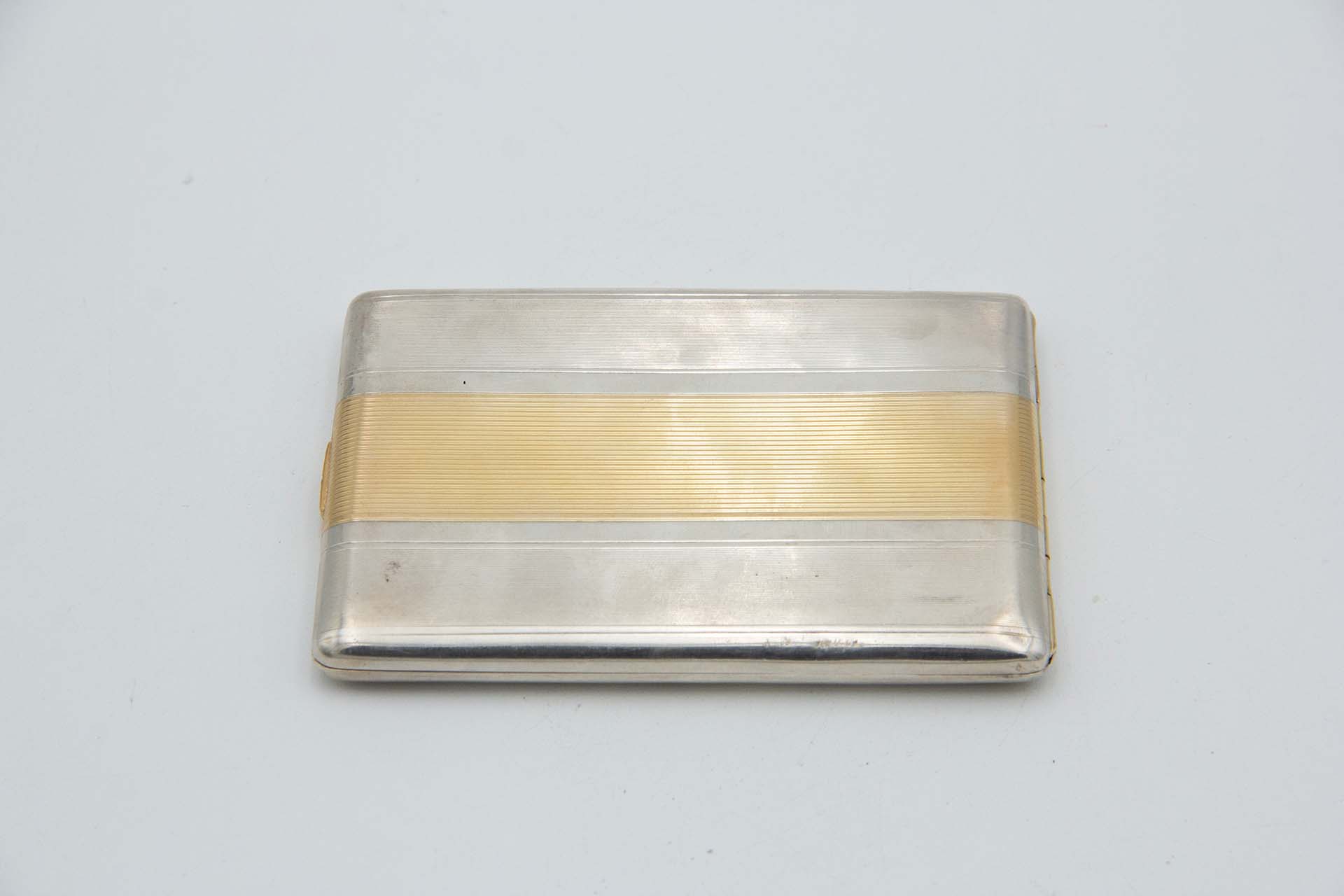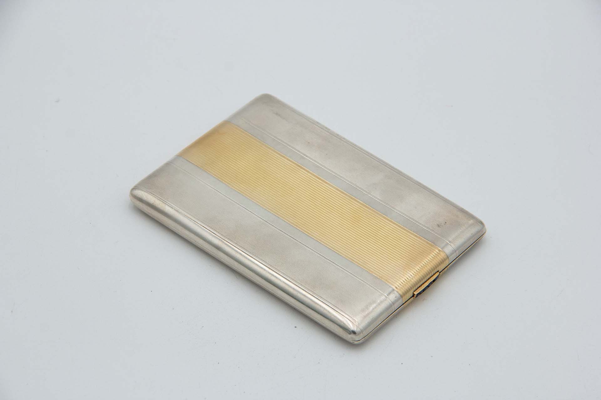 • Descrição: Cigarreira retangular de prata com bandas guilhochadas douradas ao longo e fecho com de aplicação de safiras Australianas calibradas.