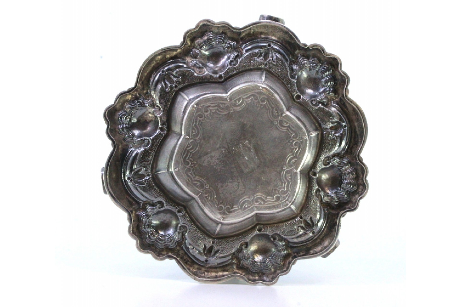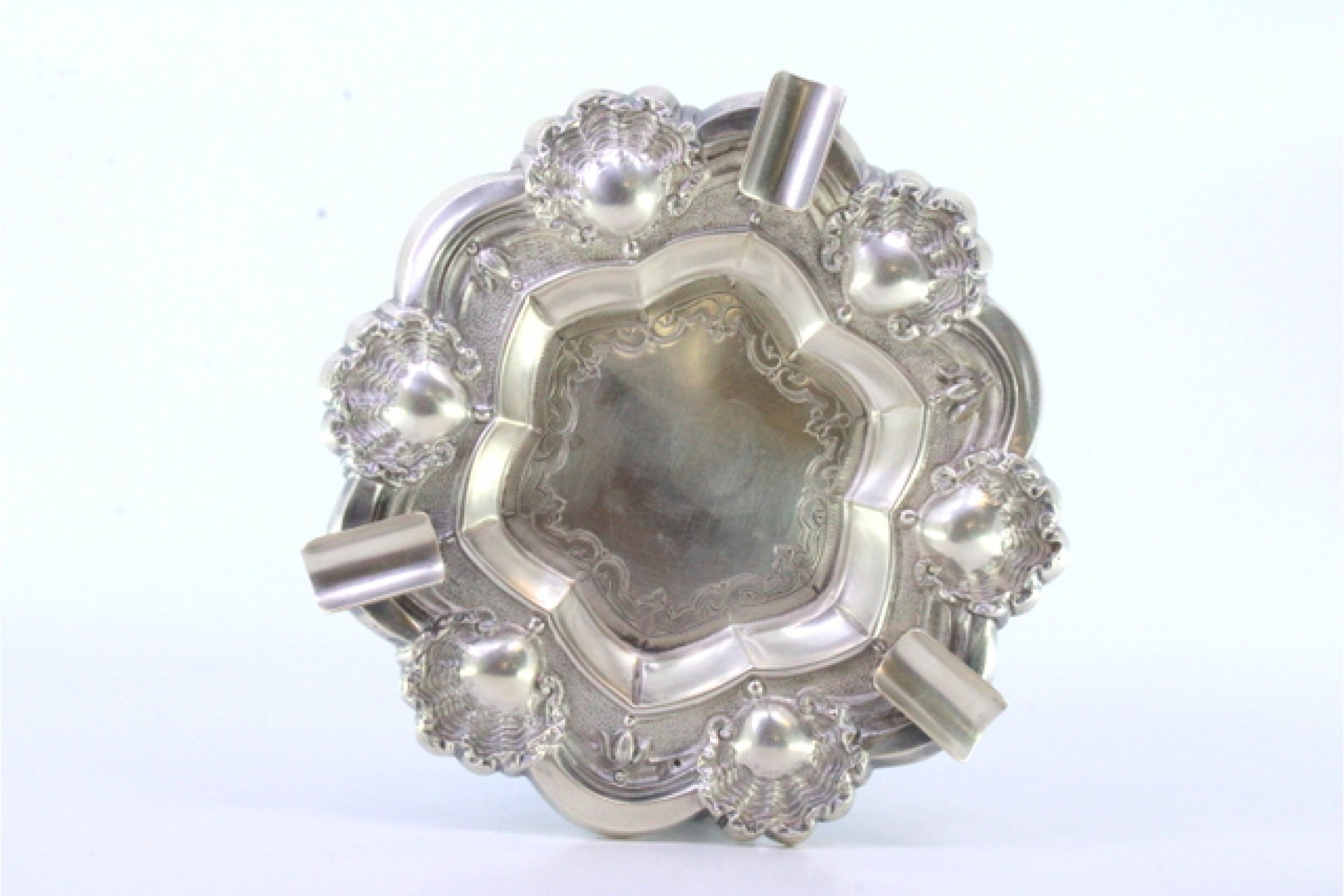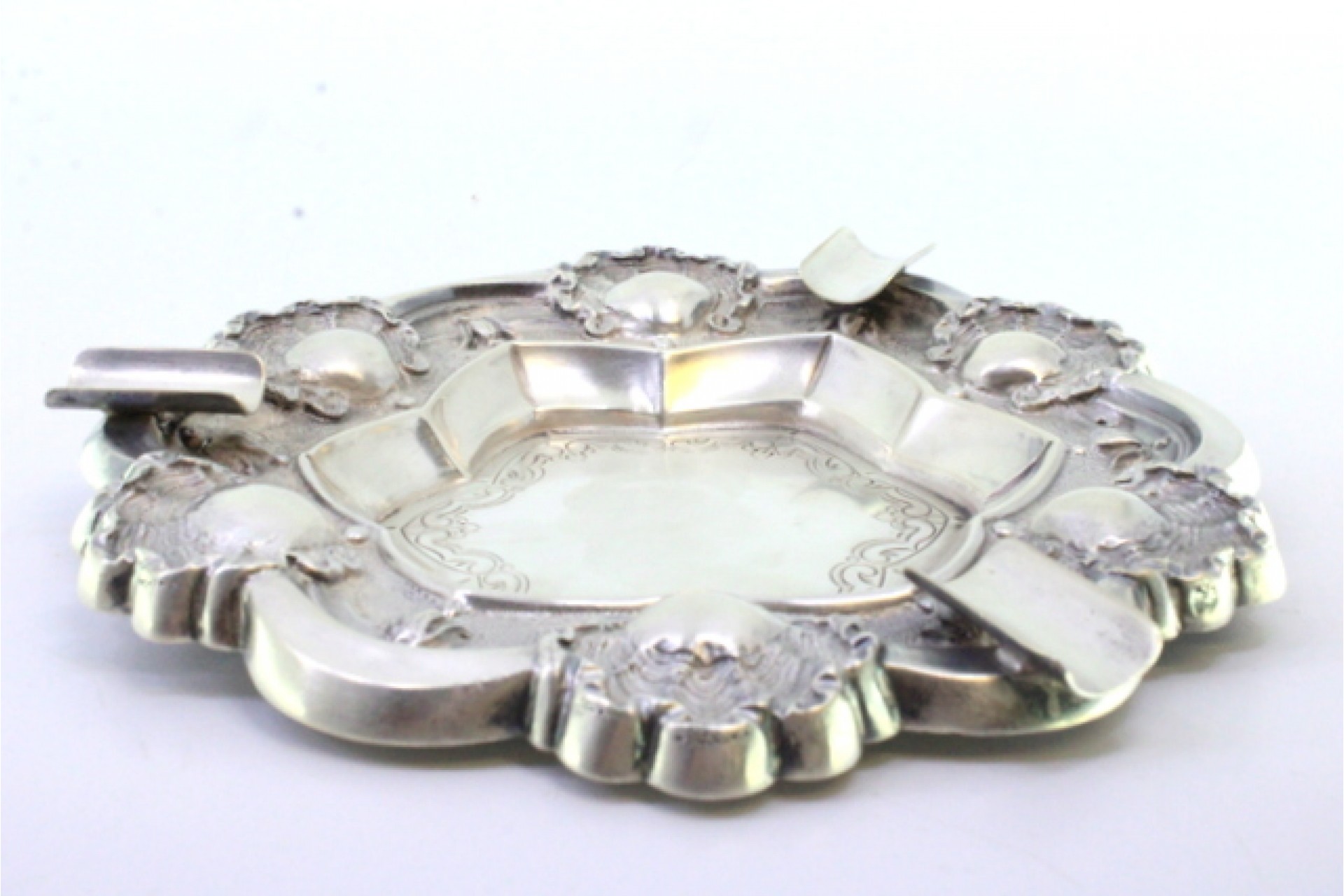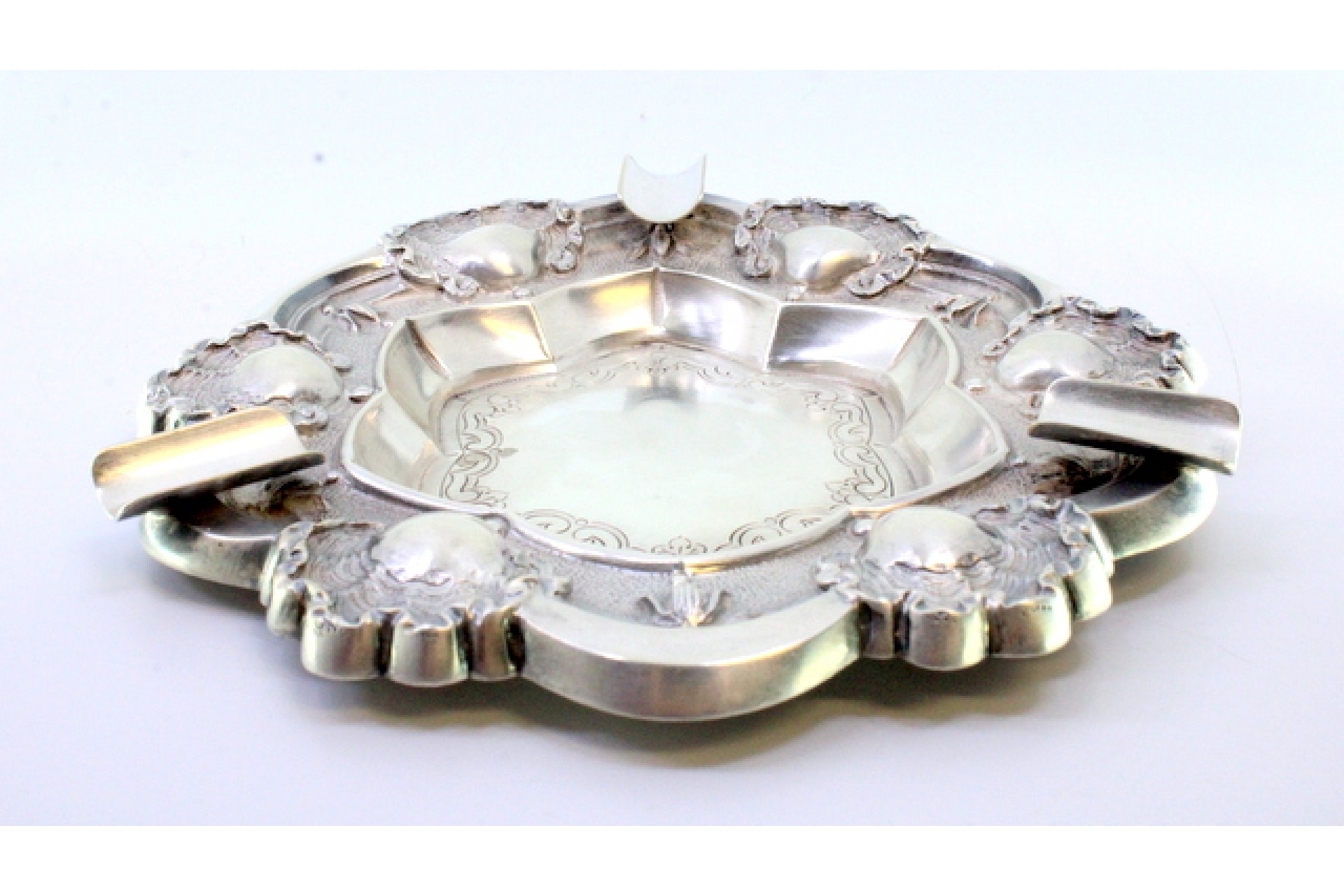 • Descrição: Cinzeiro em prata relevada com conchas e gravados no centro, com três apoios de cigarros.