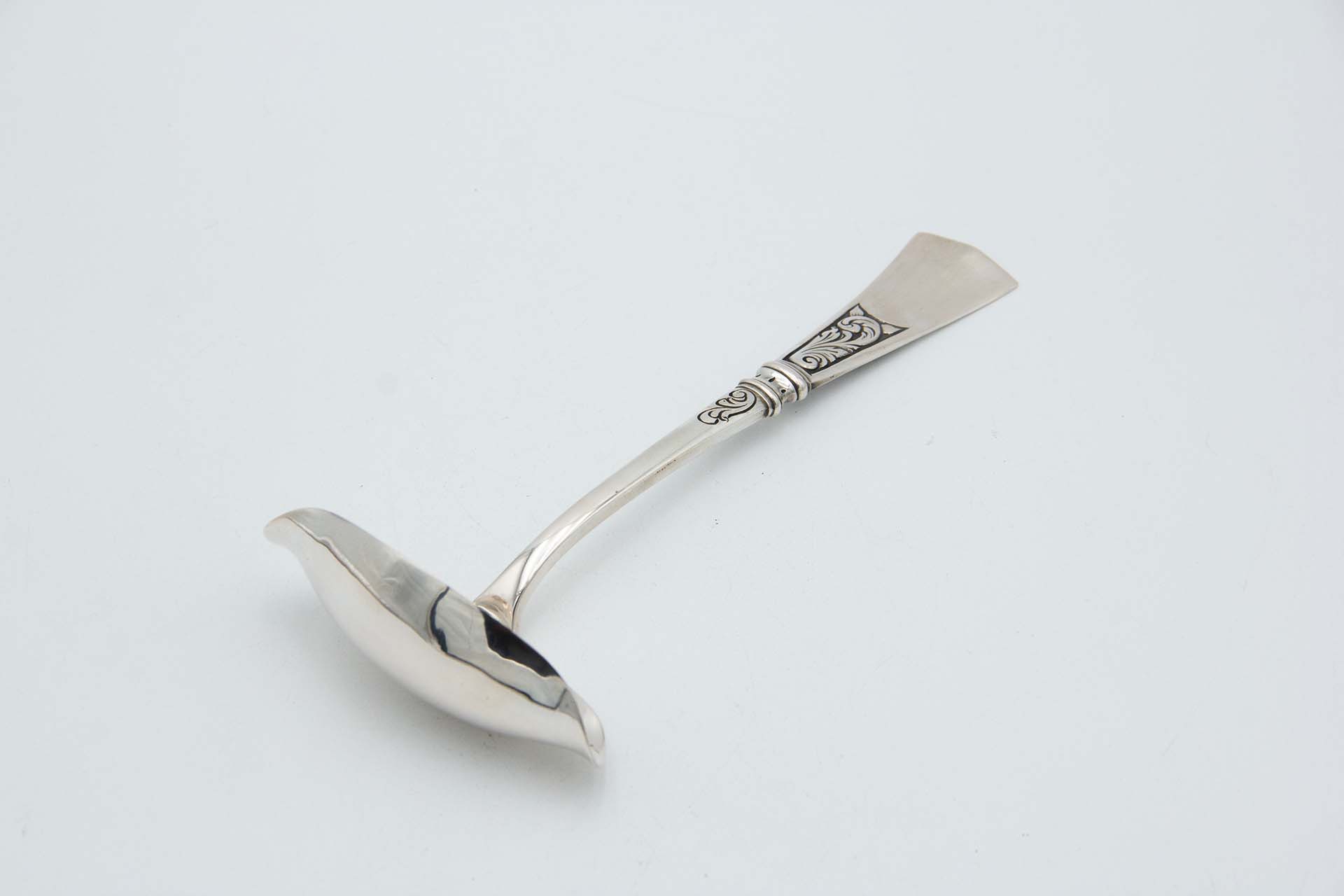 • Descrição: Colher de molhos em prata lisa para ambidestros com relevos cinzelados no cabo.