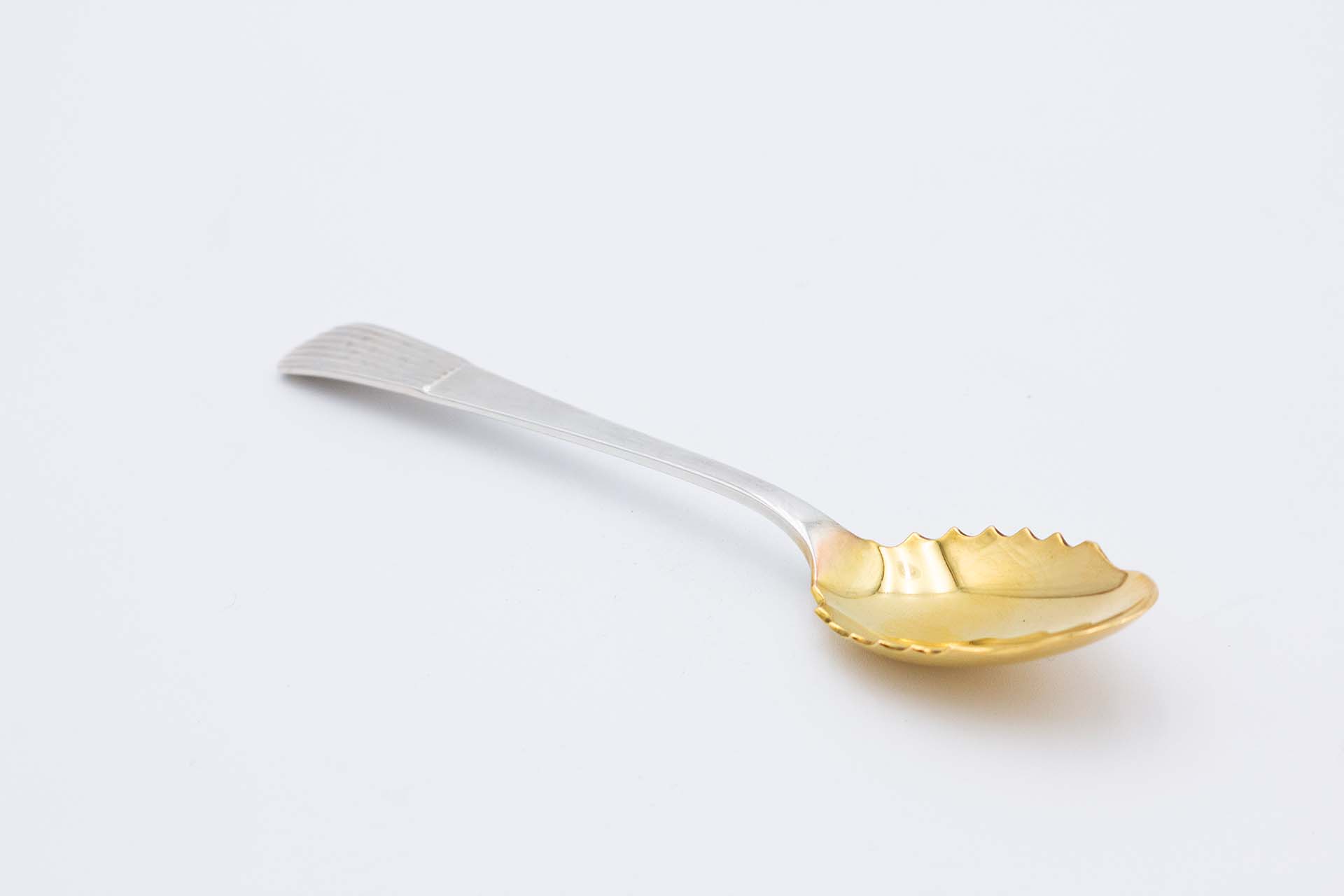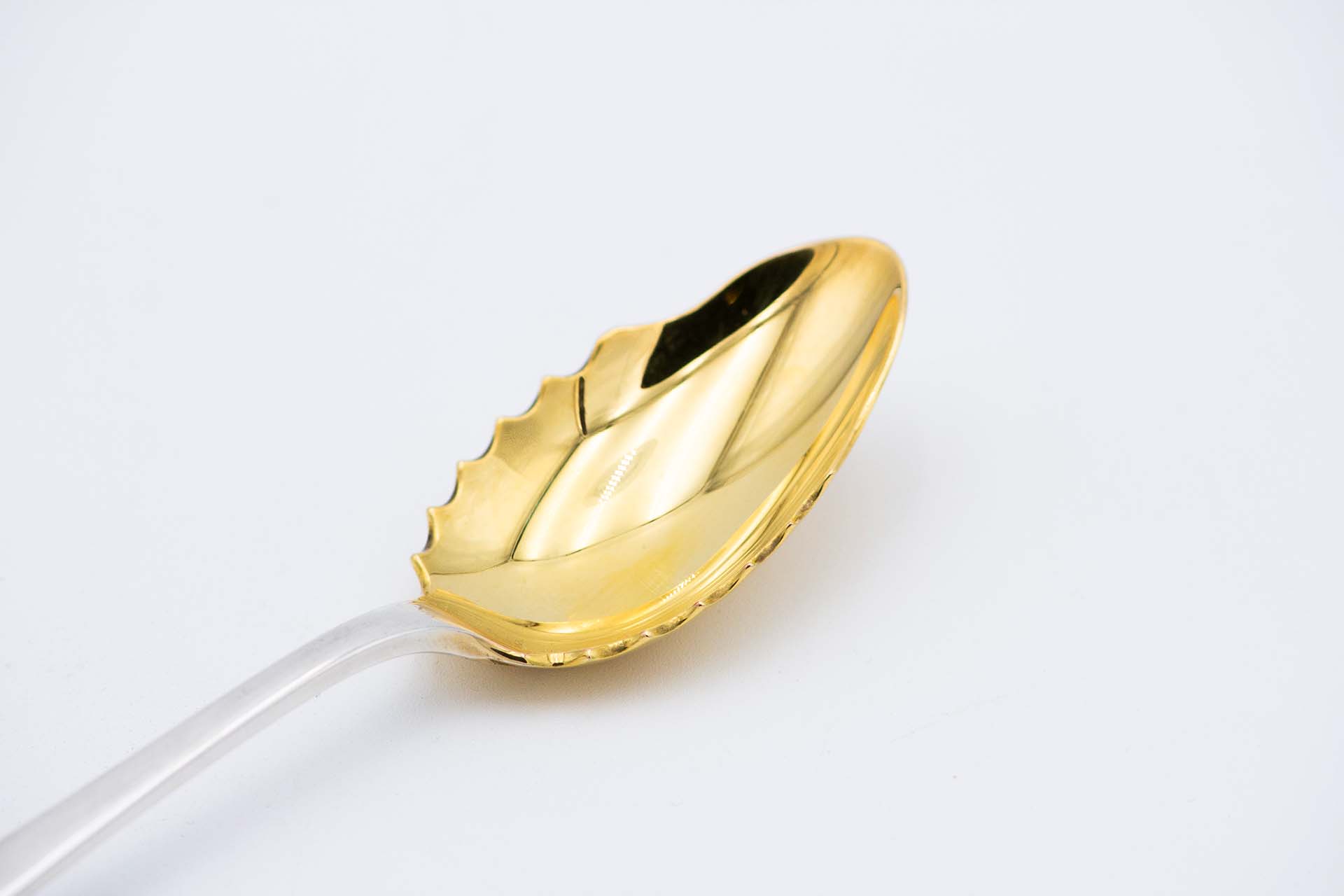• Descrição: Colher de prata para salada com concha dourada ao estilo caninhas .