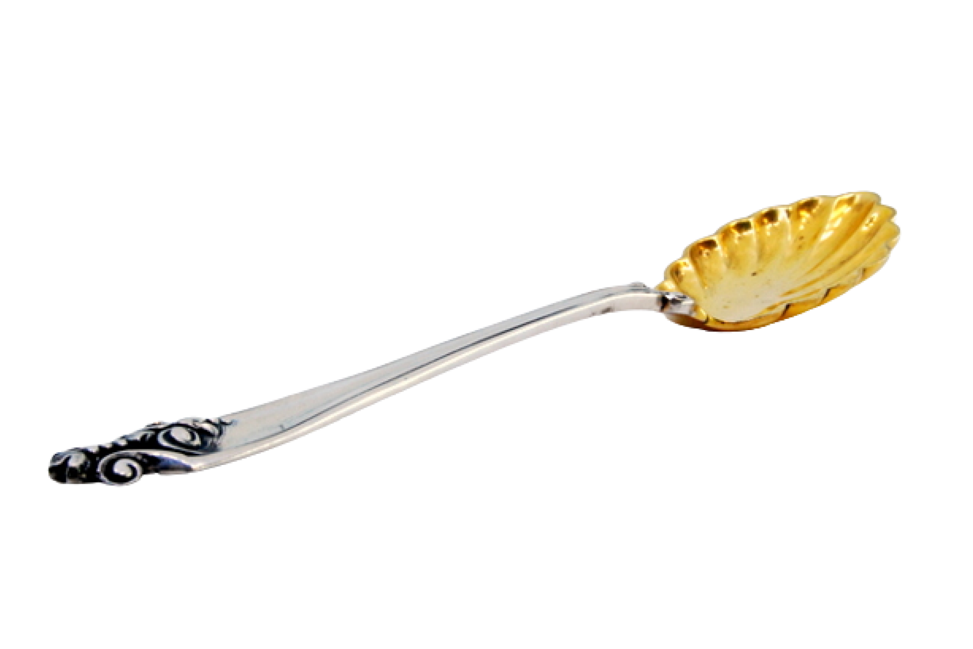 Colher de prata para fruta com concha dourada e cabo com frisos e relevos.