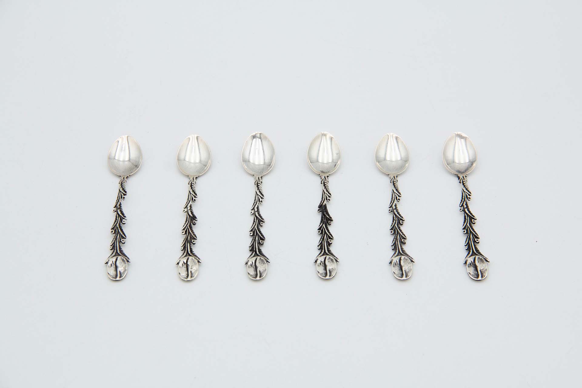 • Descrição: Conjunto de seis colheres de café em prata com os cabos relevados em forma de grãos de café.