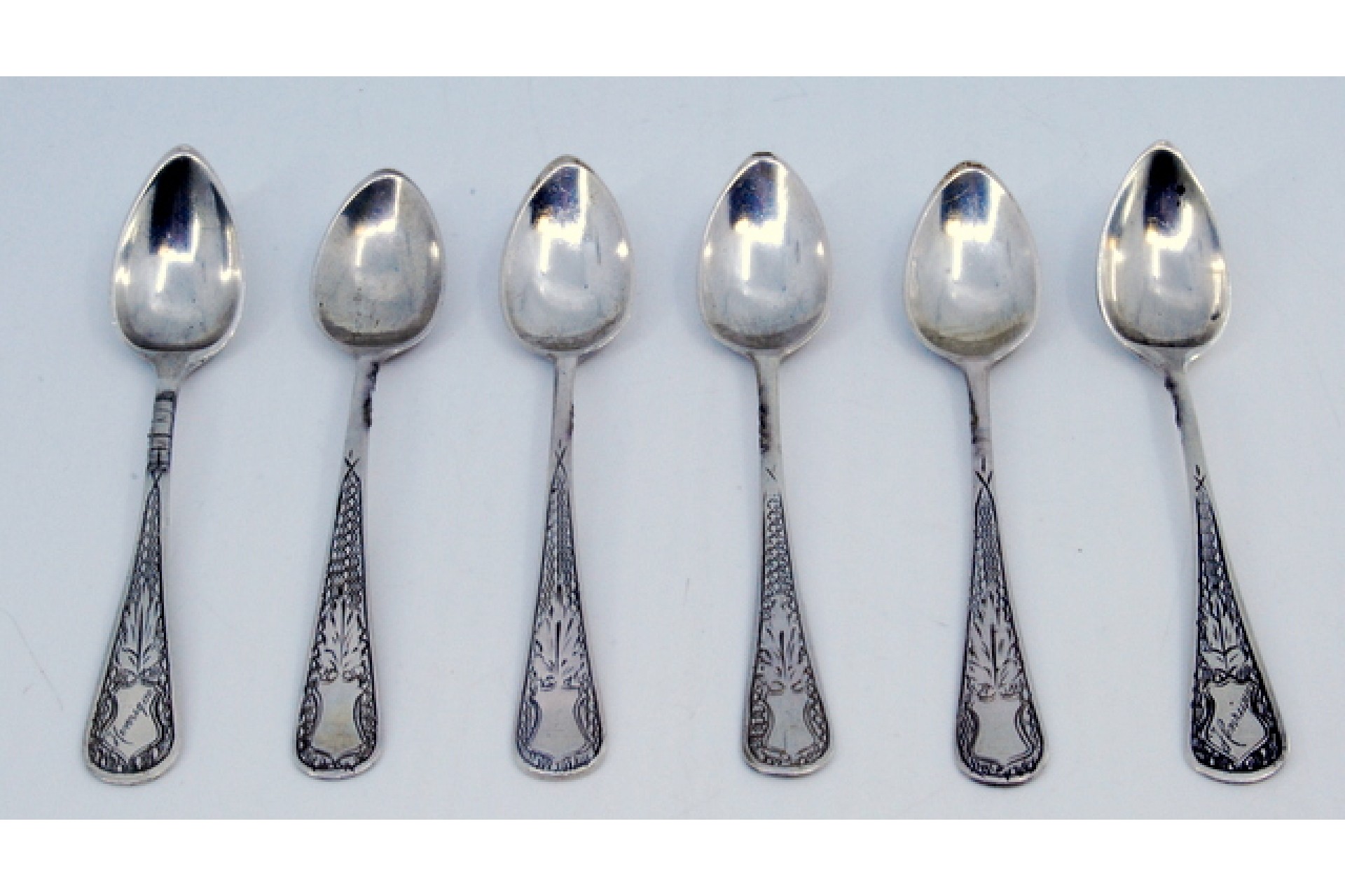 Conjunto de seis colheres de café em prata com gravados nos cabos.