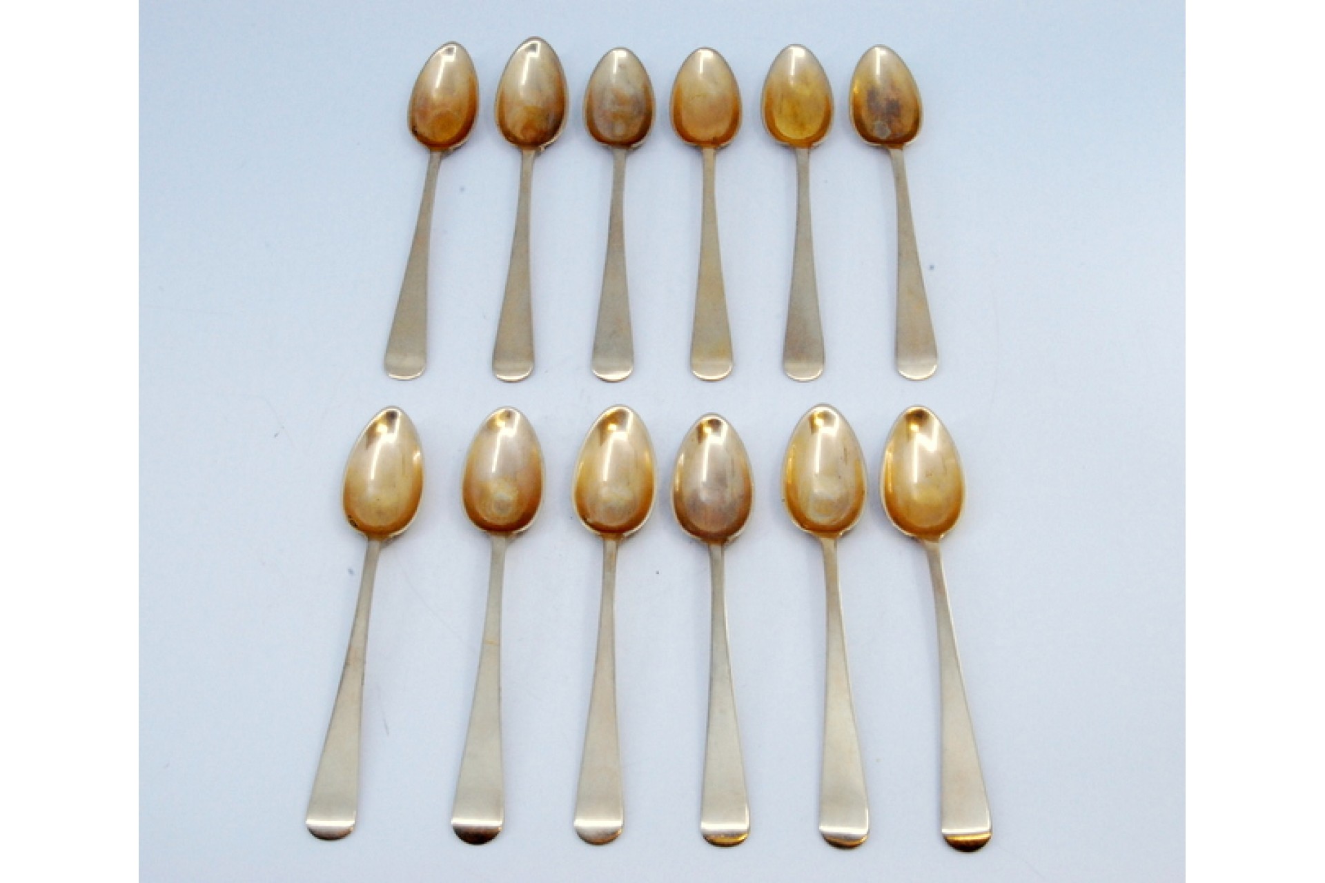 Conjunto de doze colheres de chá em prata lisa e conchas douradas.