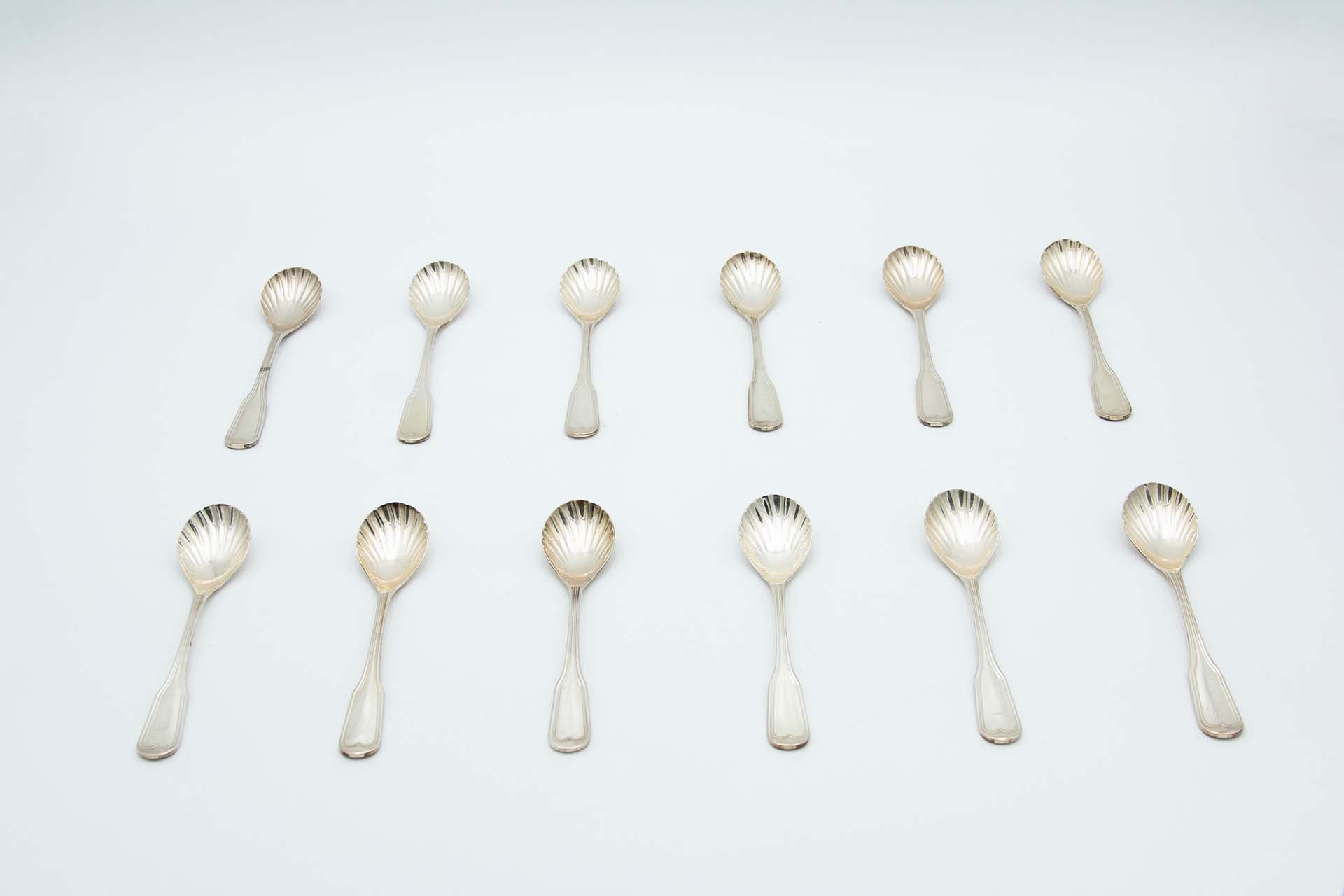 • Descrição: Conjunto de doze colheres de gelado em prata em formato concheado.