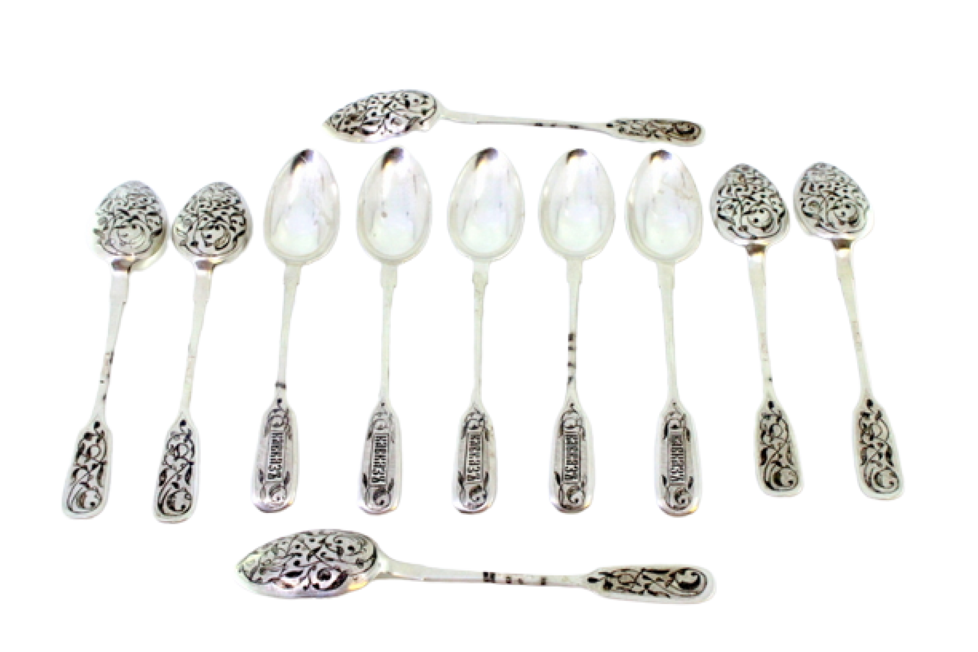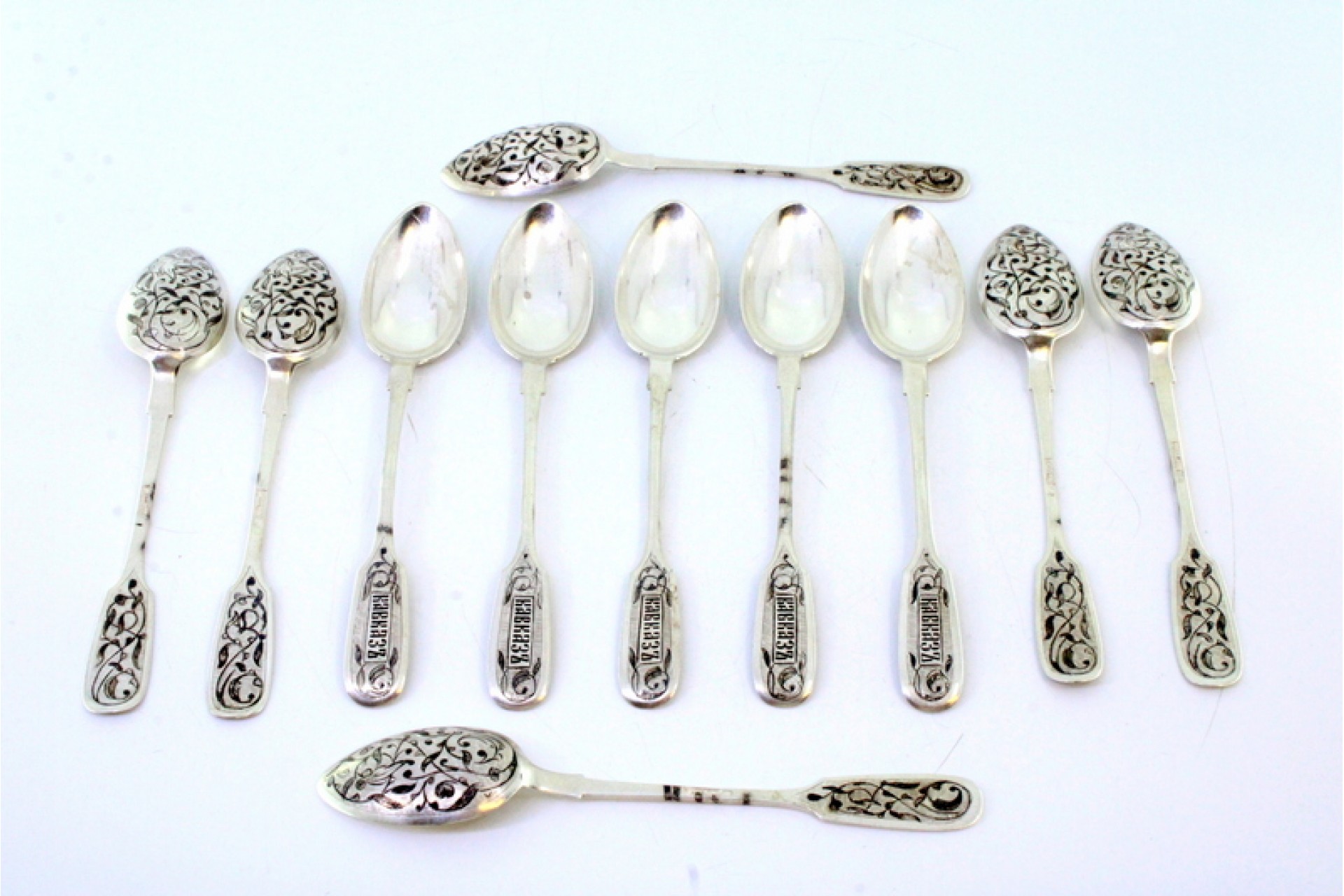 • Descrição: Conjunto de onze colheres de sobremesa em prata com gravados nas conchas e cabos ao gosto Russo.