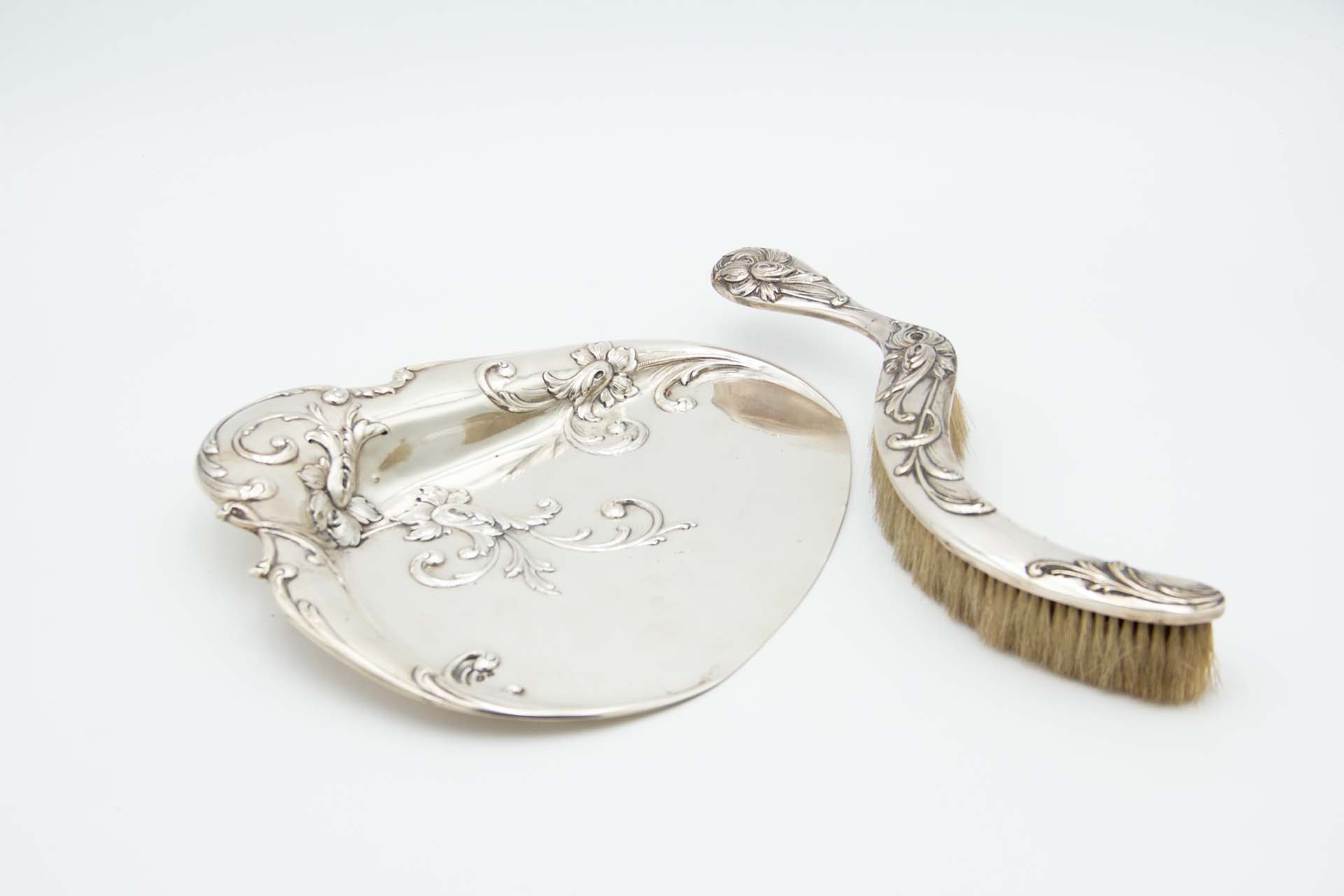 • Descrição: Conjunto de apanha migalhas em prata e escova com relevos ao estilo Arte Nova.