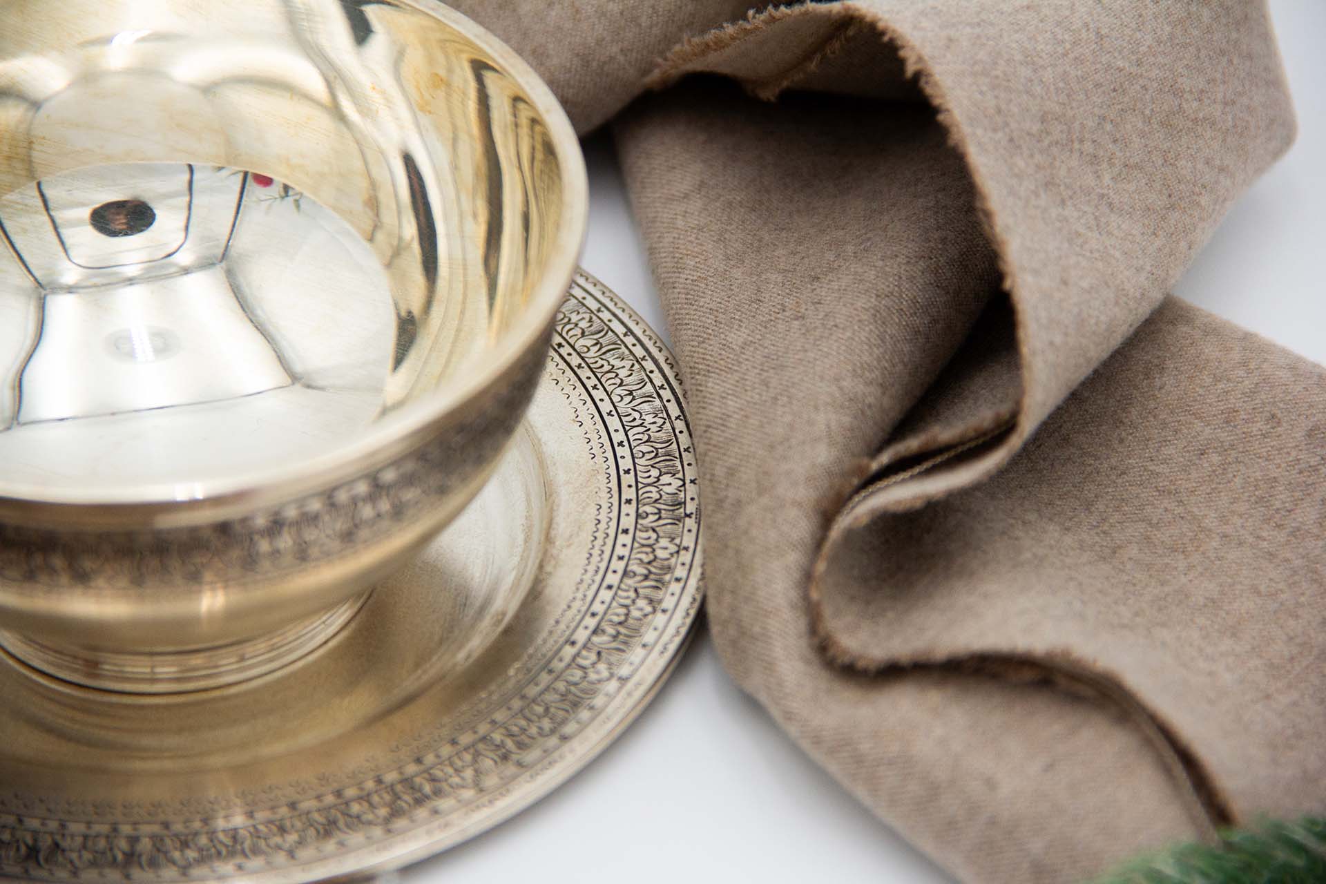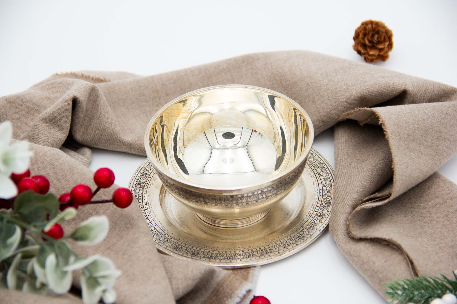 • Descrição: Conjunto de doze lavabos com pires em prata com gravados e frisos envolventes.