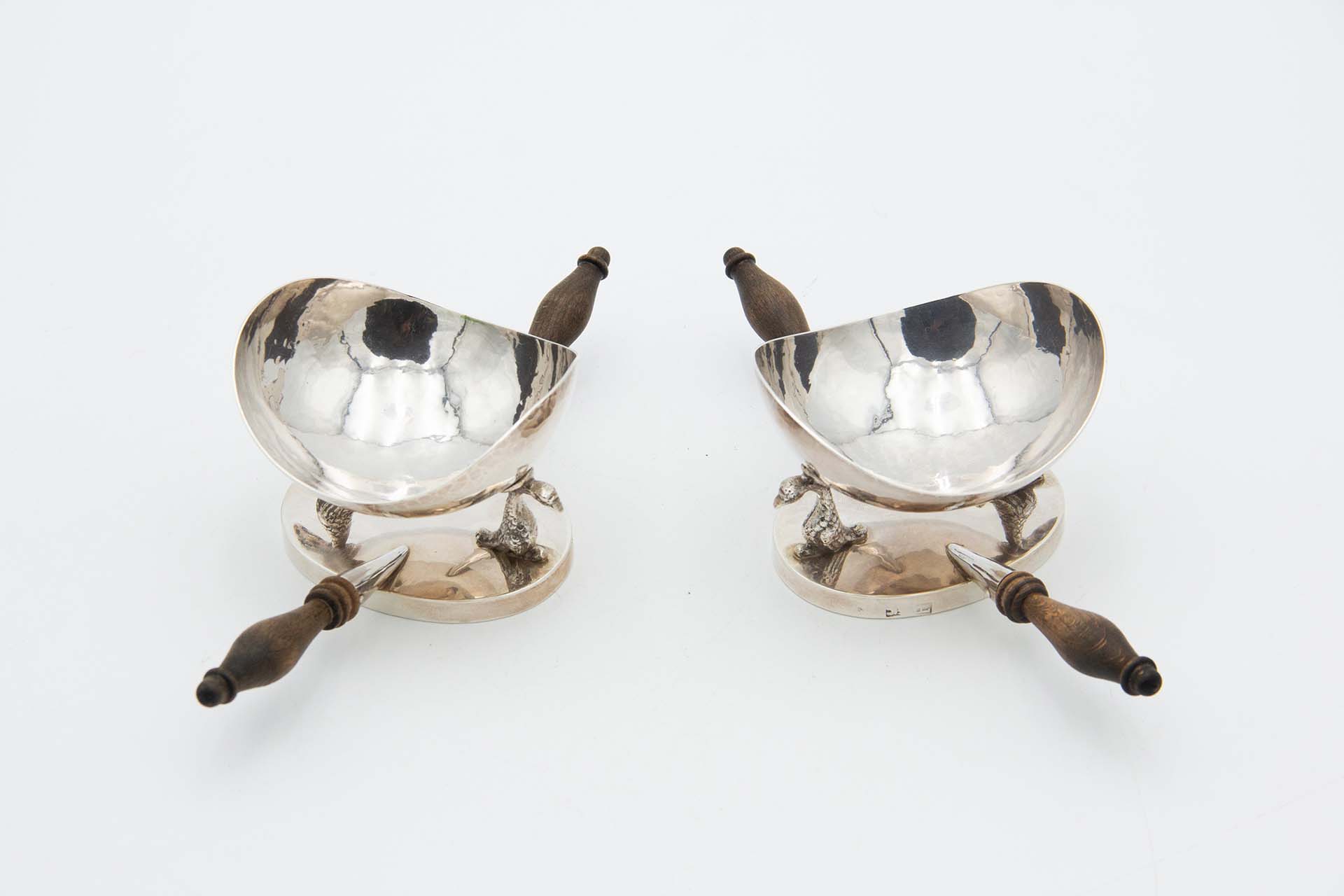 • Descrição: Saleiro e pimenteiro em prata martelada, formato elíptico, suportados por dois grifos e pegas em madeira de castanho.