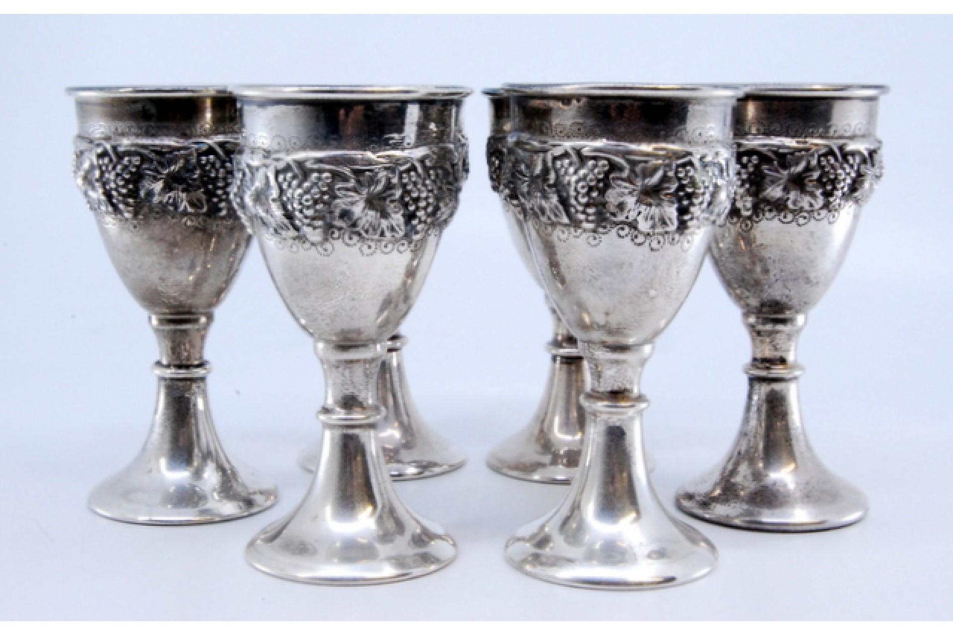 Conjunto de seis copos para ovos em prata com relevos de cachos de uvas e folhas de parreira.