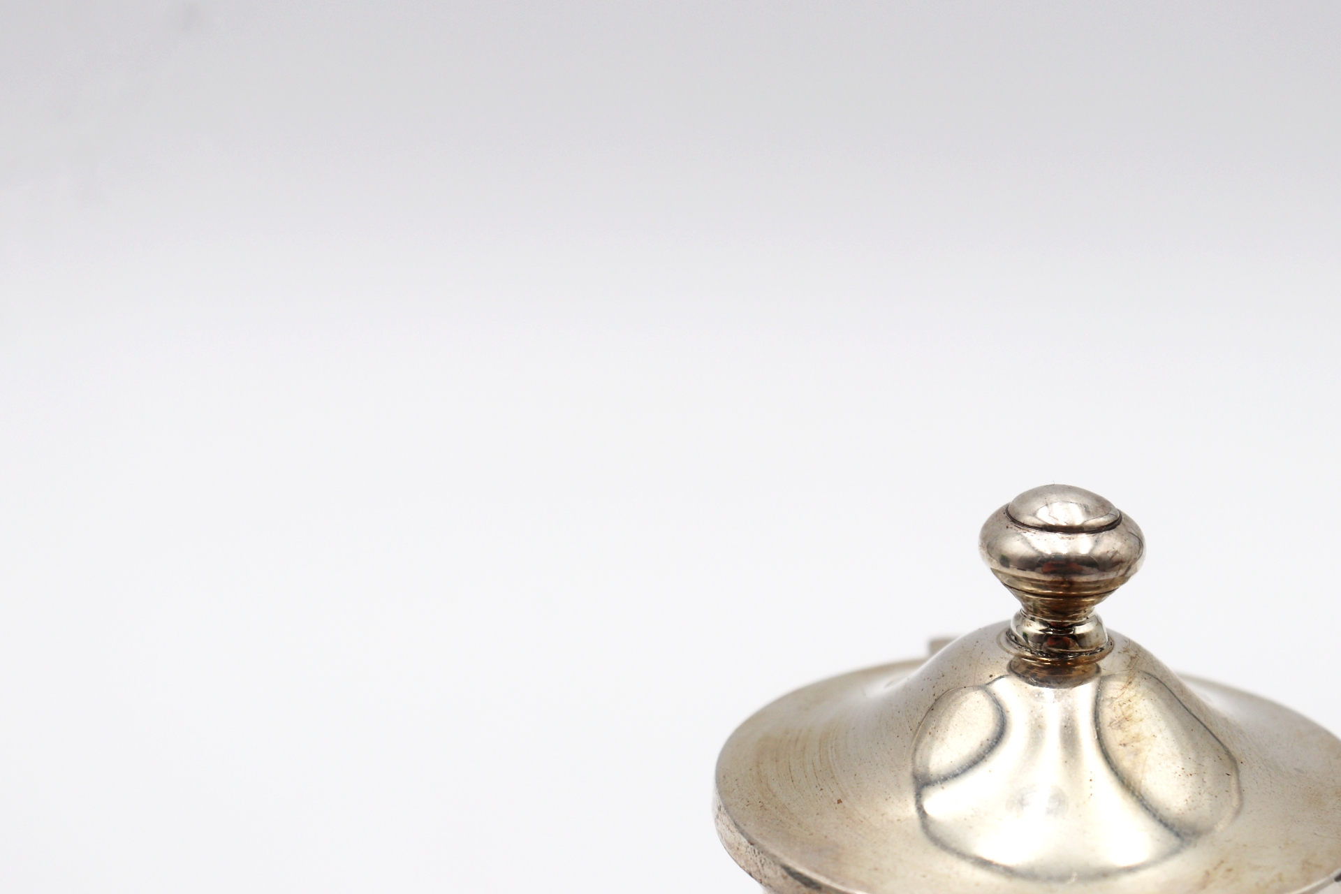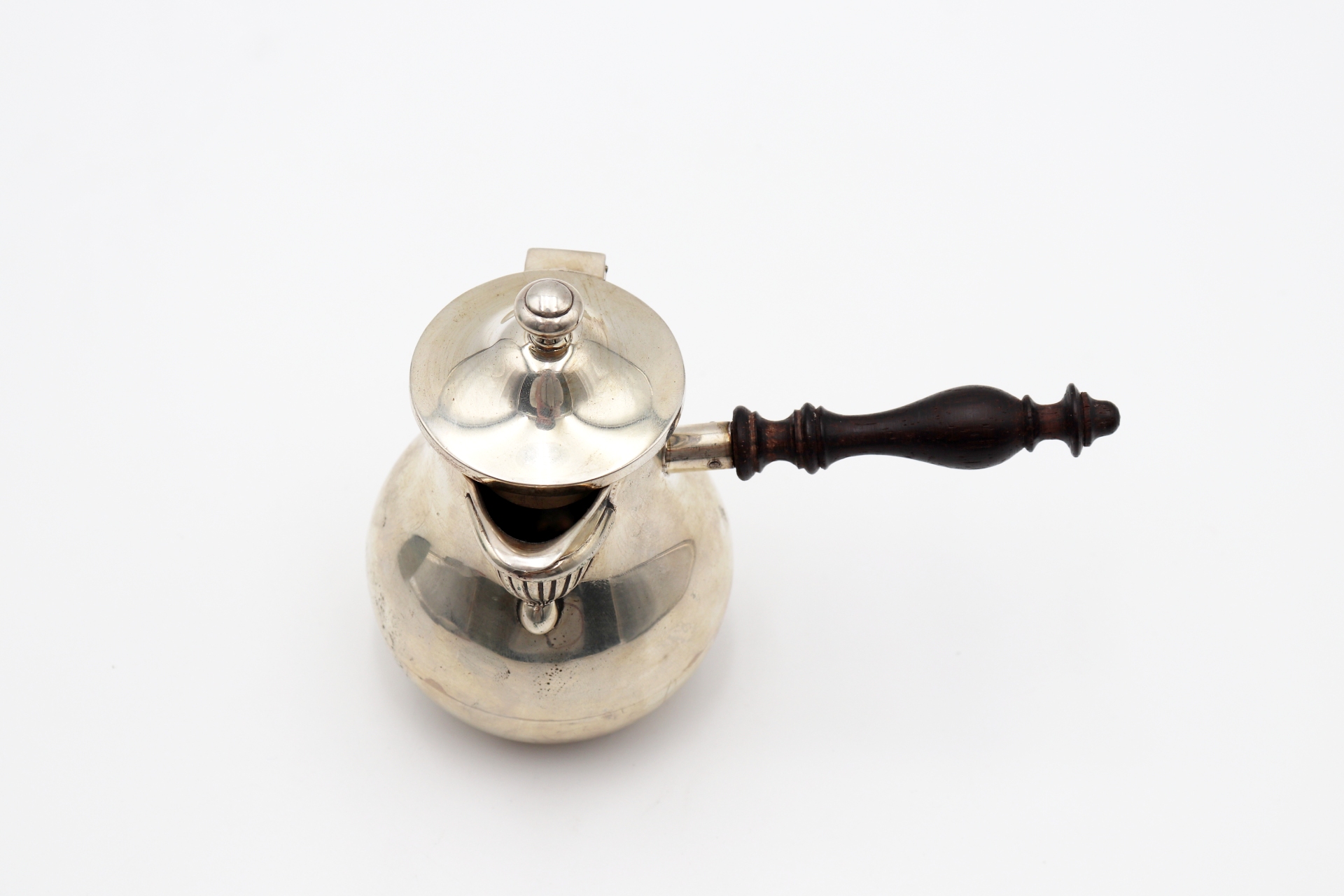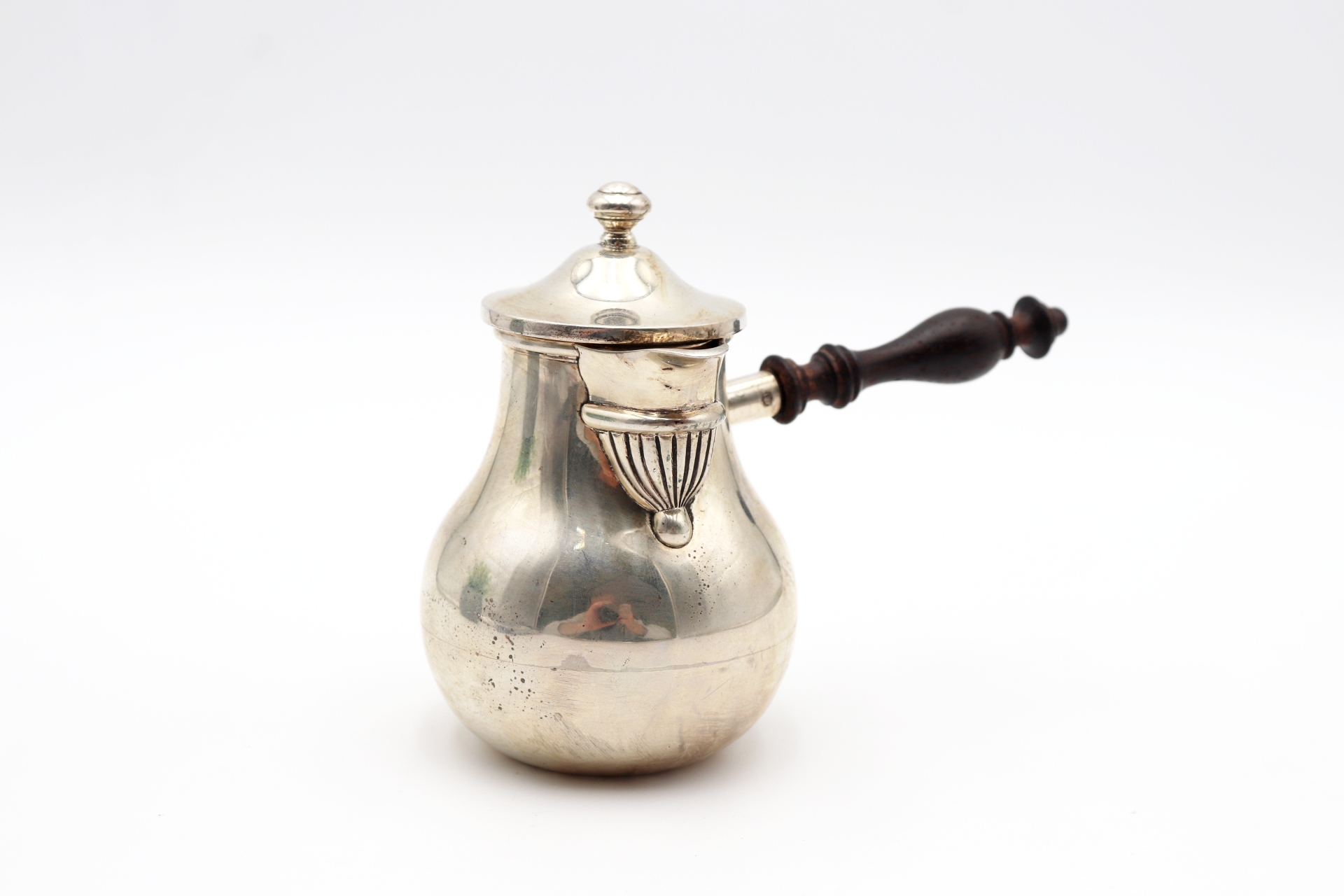 • Descrição: Cremeira bojuda em prata lisa com aplicação de pomo e cabo em madeira de castanho.
