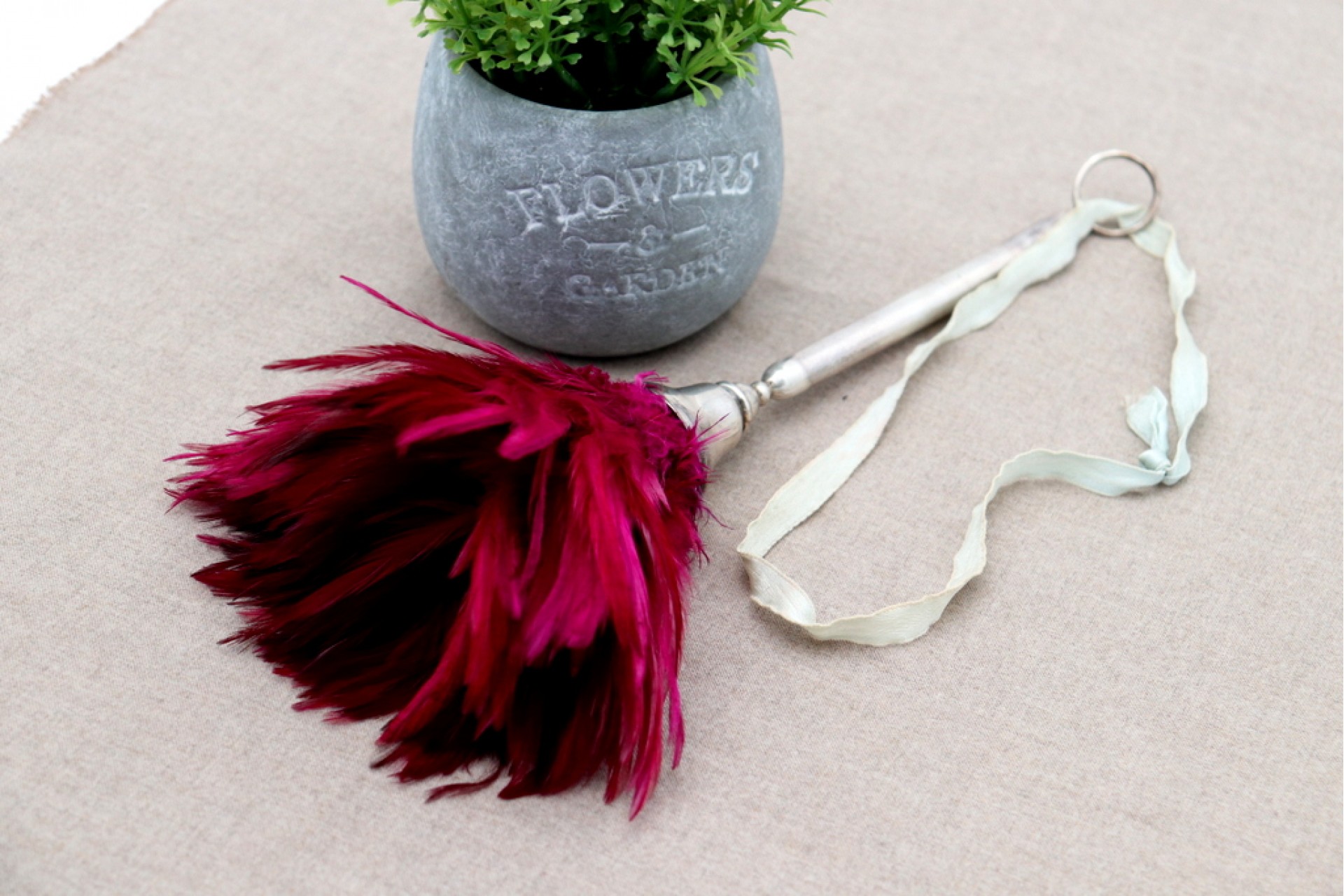 • Descrição: Espanador em prata com argola e penas em tons de bordeaux
