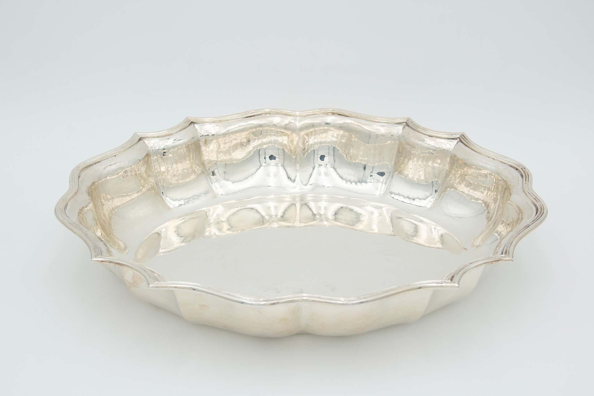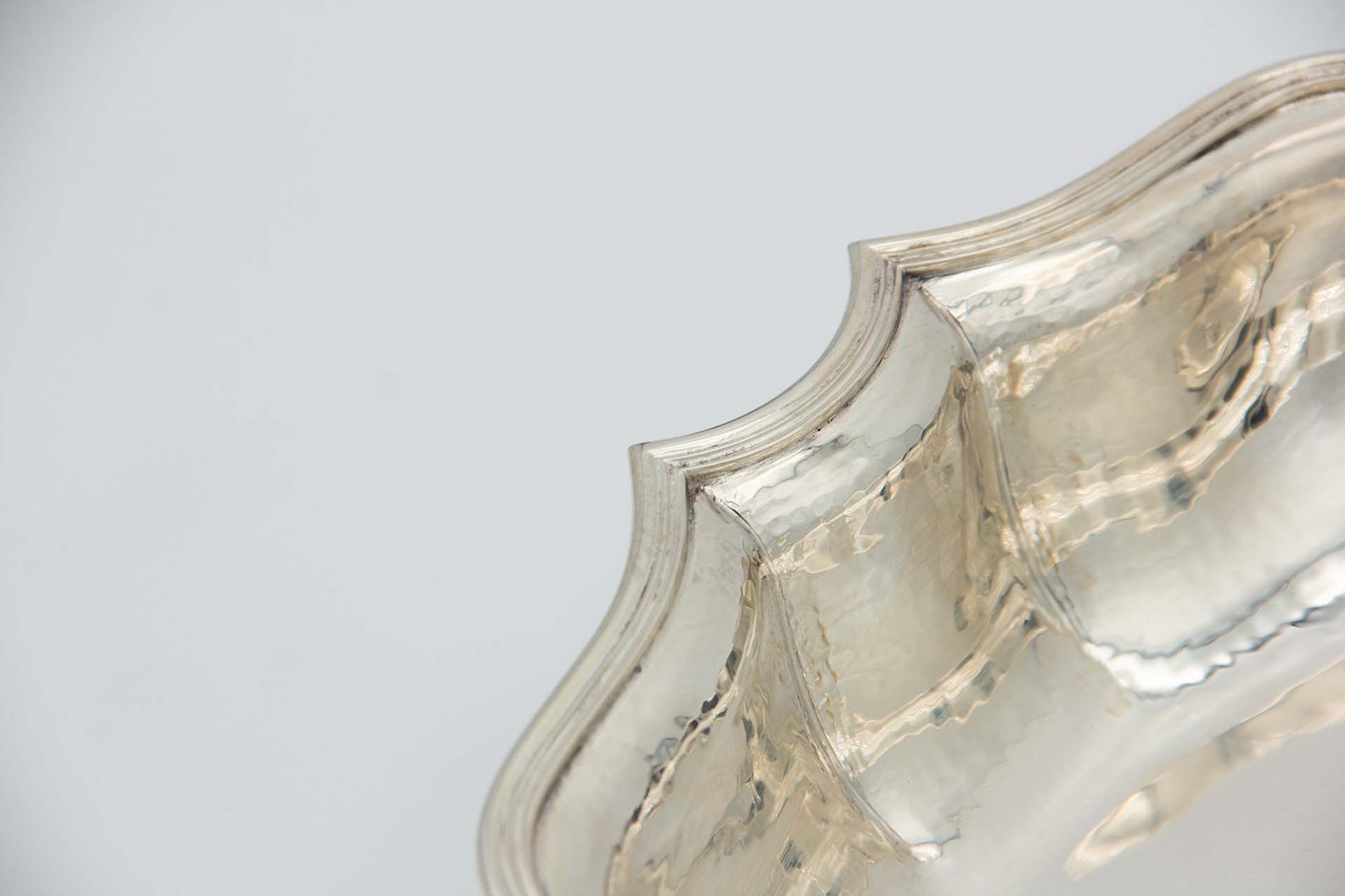 • Descrição: Saladeira em prata martelada de doze (12) gomos e rebordo com duplo friso.