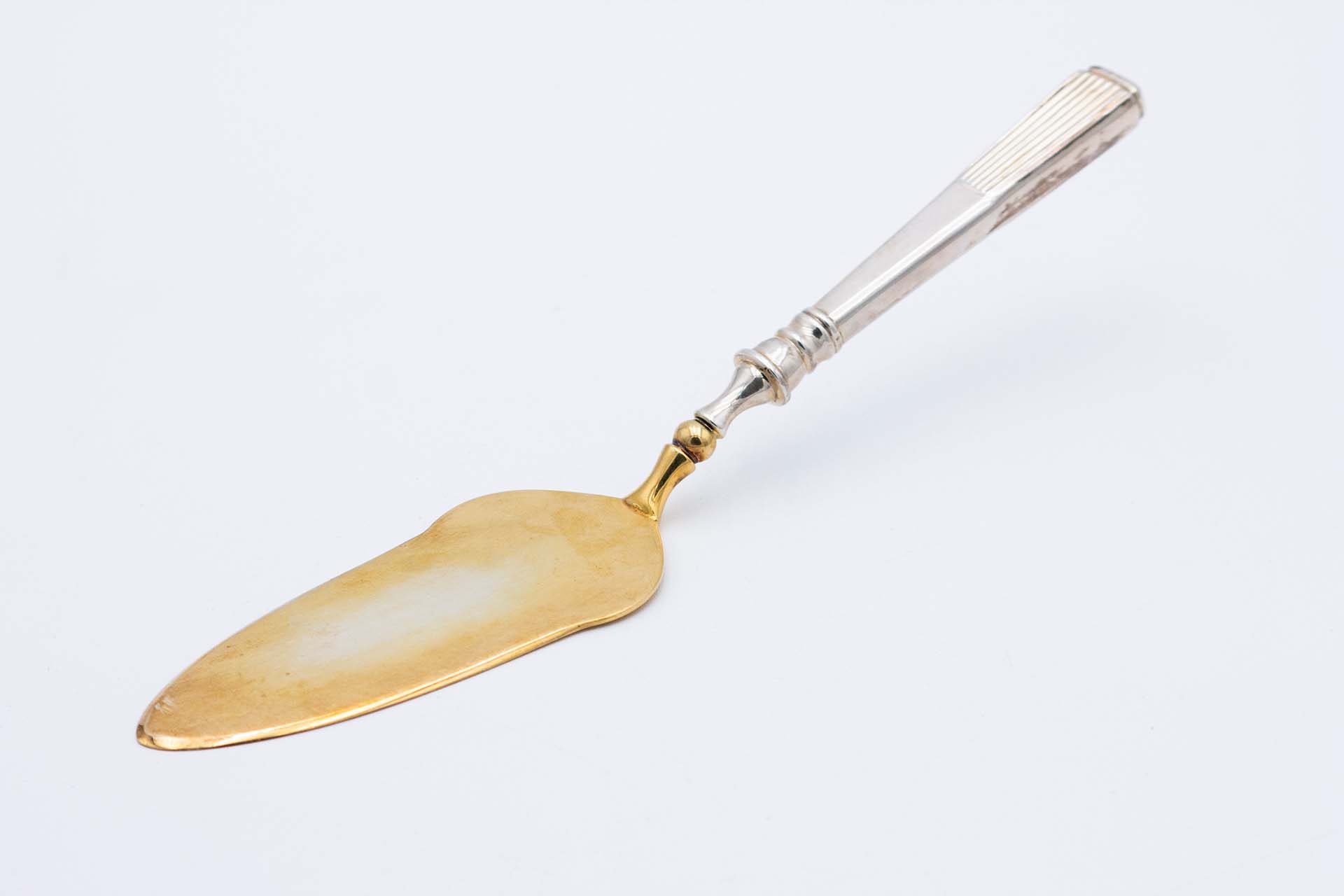• Descrição: Espátula de prata para serviço de sobremesas com lâmina e cabo elevado ao estilo caninhas.