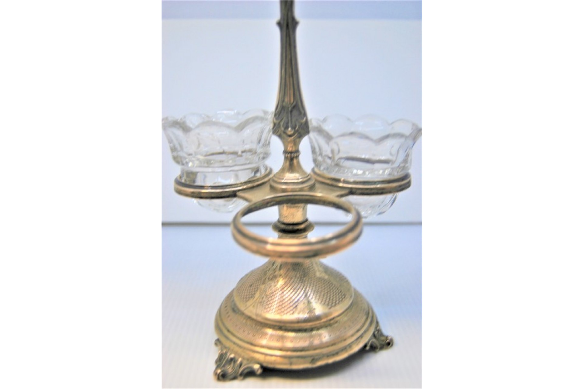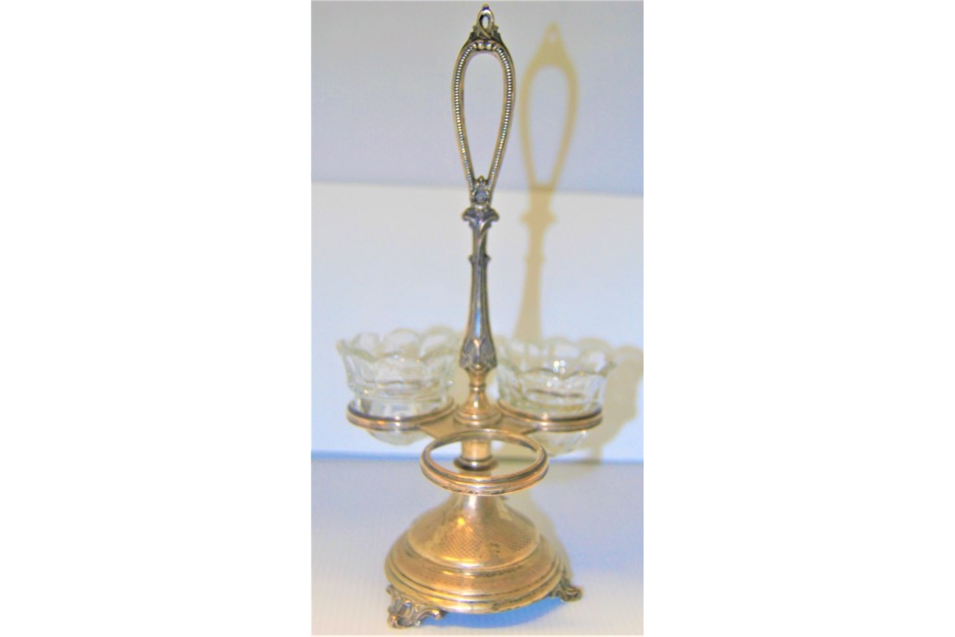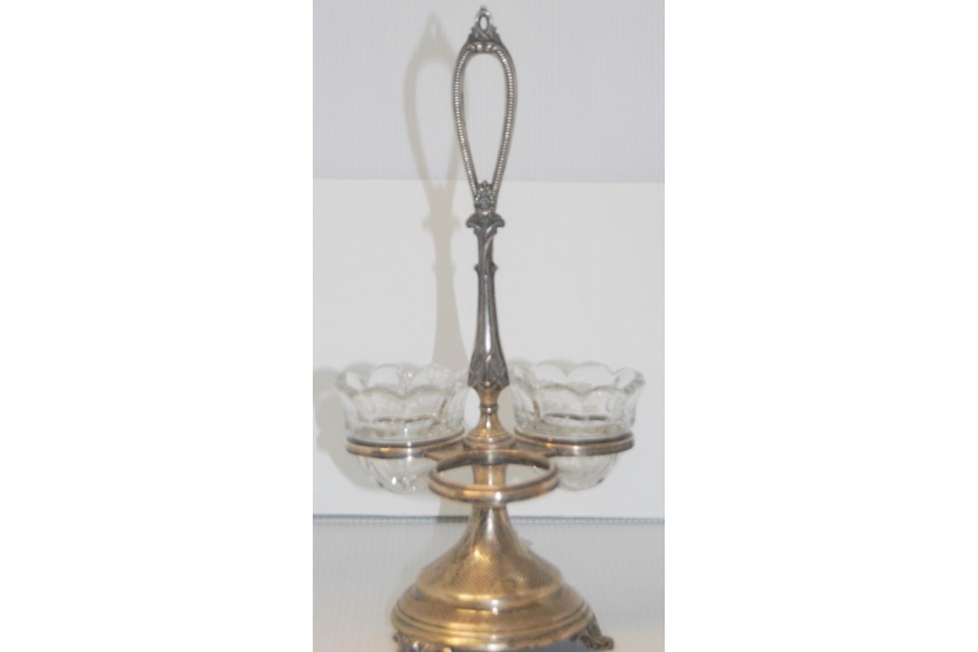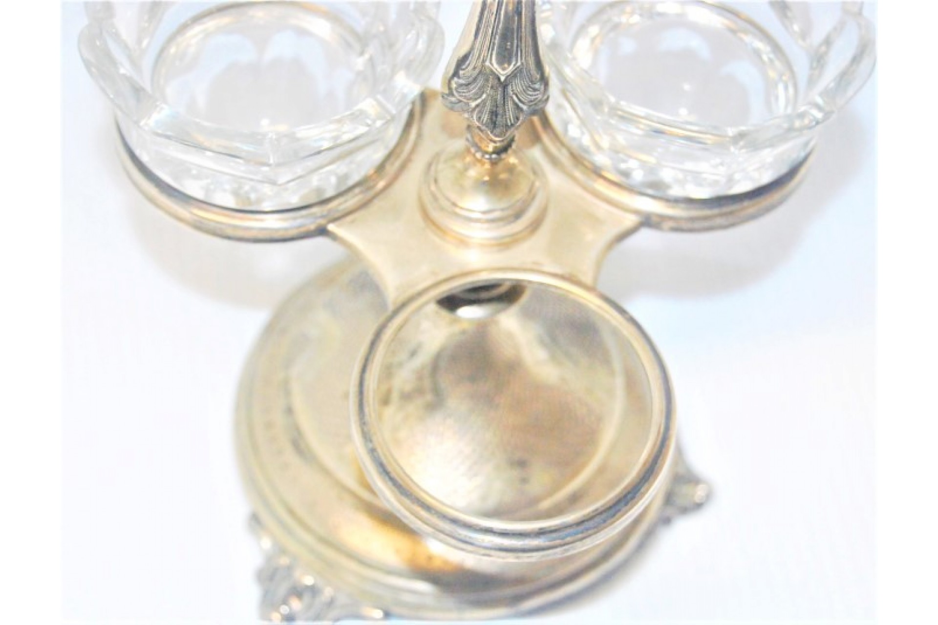 • Descrição: Especieiro em prata com três suportes em vidro com gravados, perlados e assente sobre três pés.