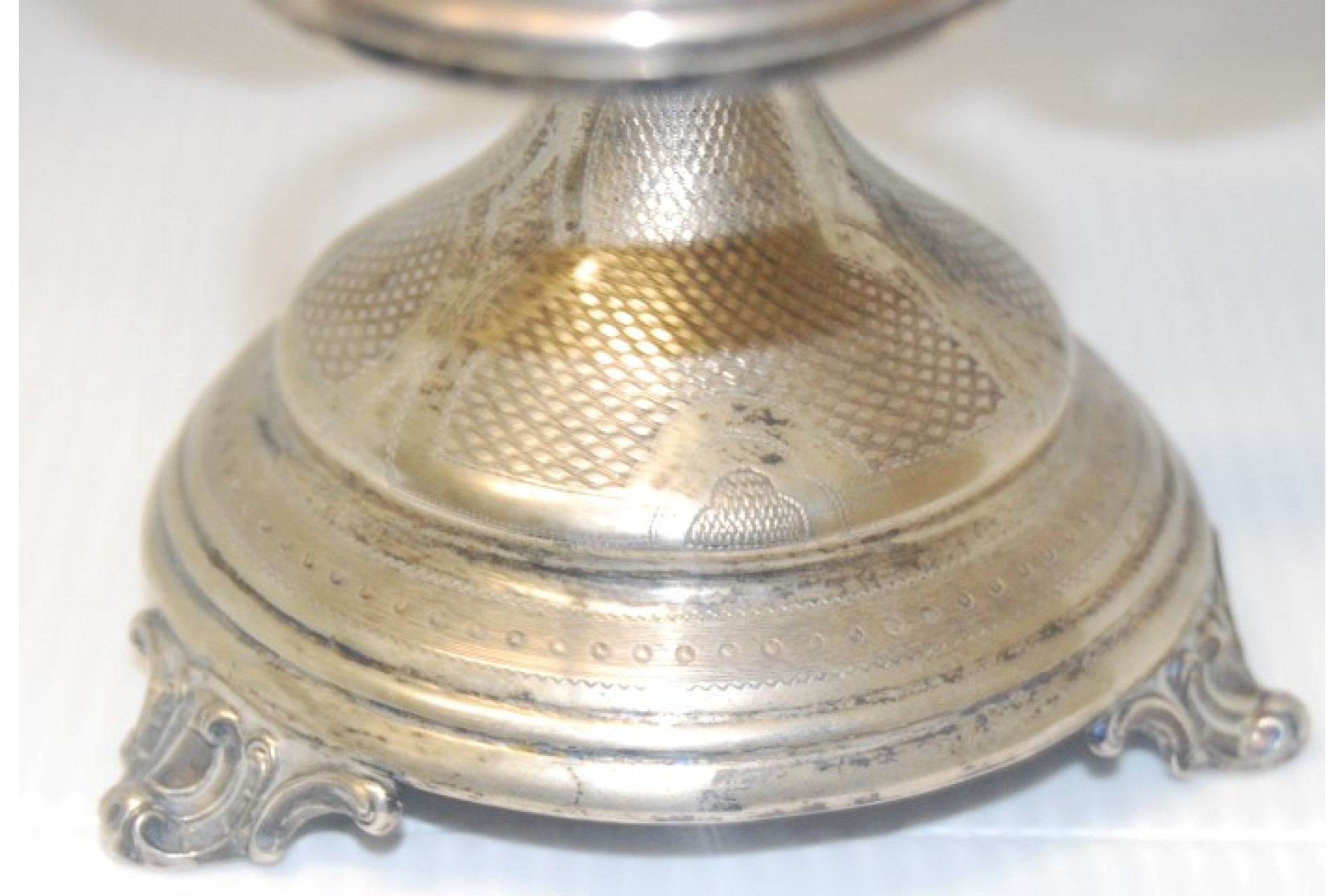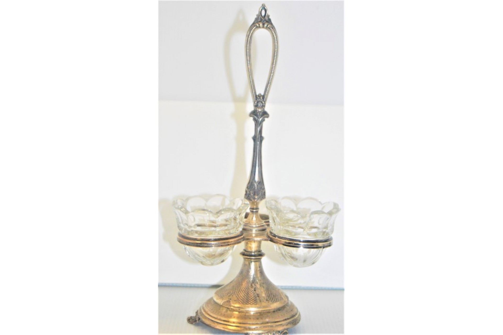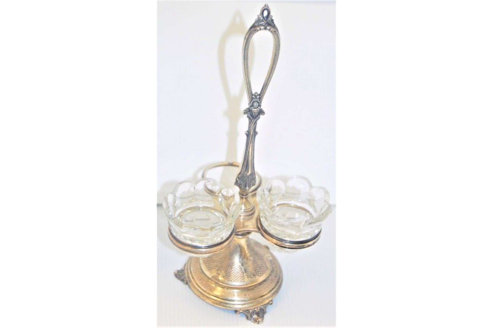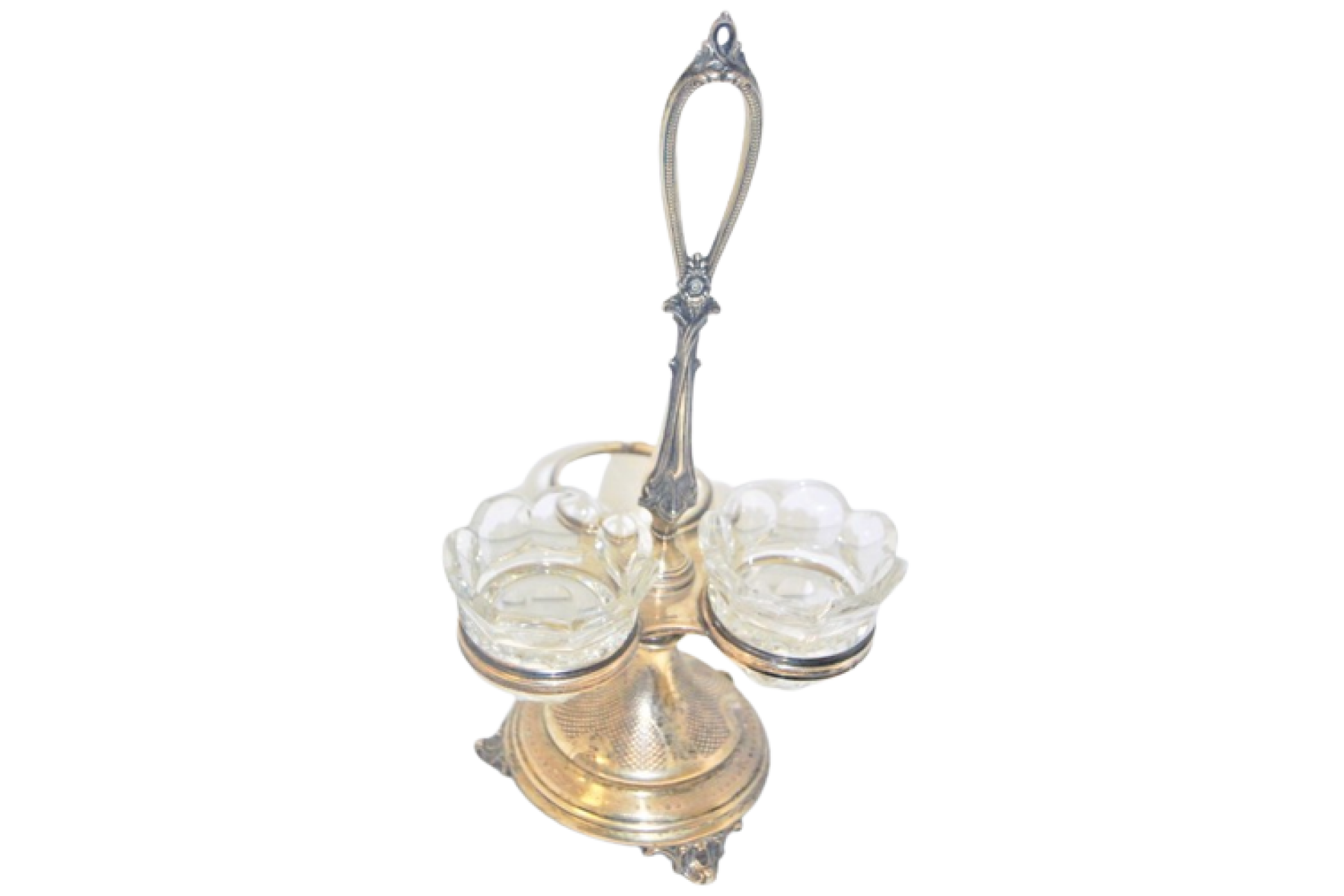• Descrição: Especieiro em prata com três suportes em vidro com gravados, perlados e assente sobre três pés.