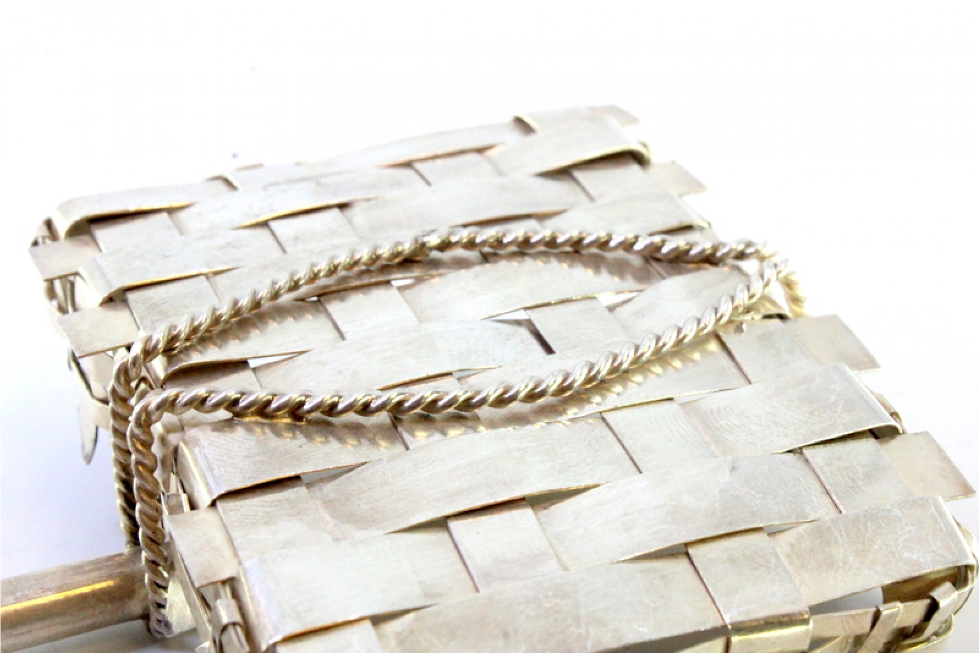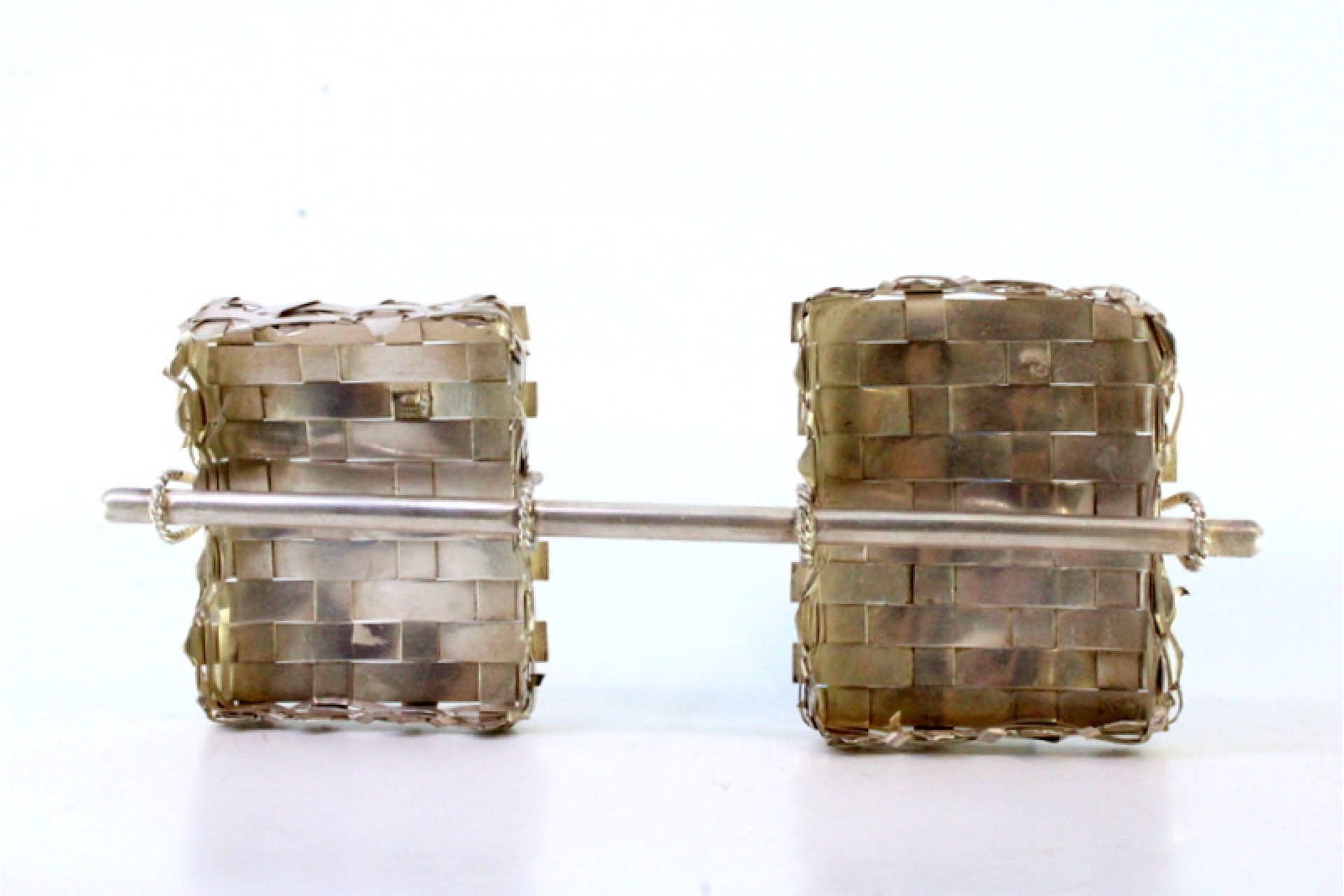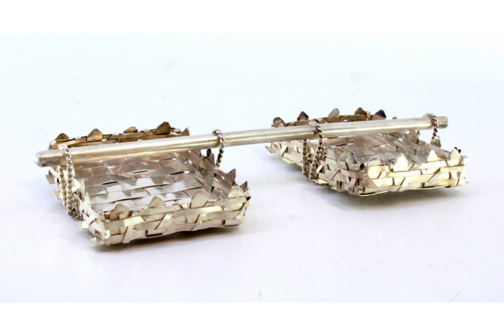 Especieiro em prata com dois depósitos em forma de canastras seguras por varal.