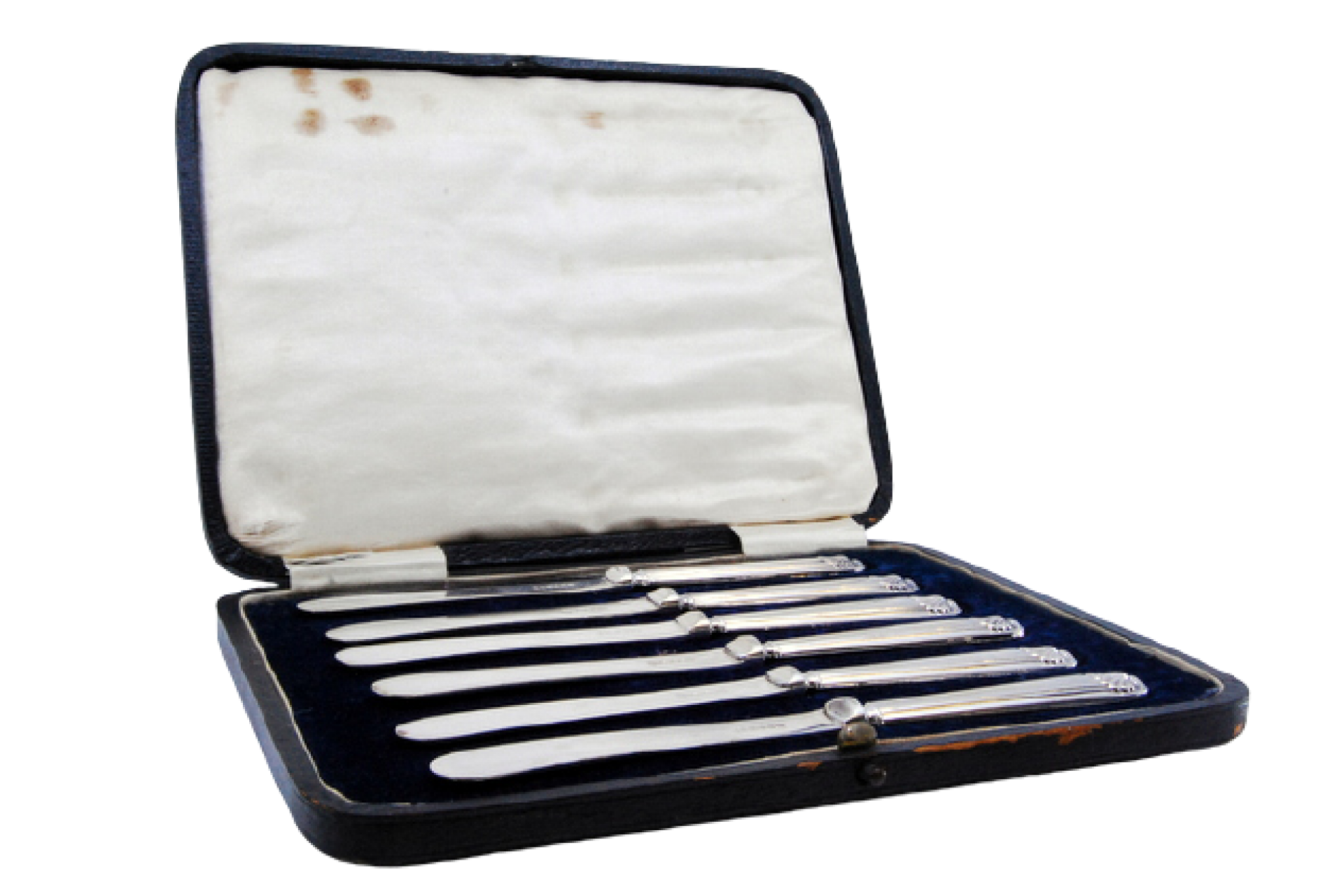 • Descrição: Conjunto de seis facas para manteiga com os cabos em prata frisada e concheada.