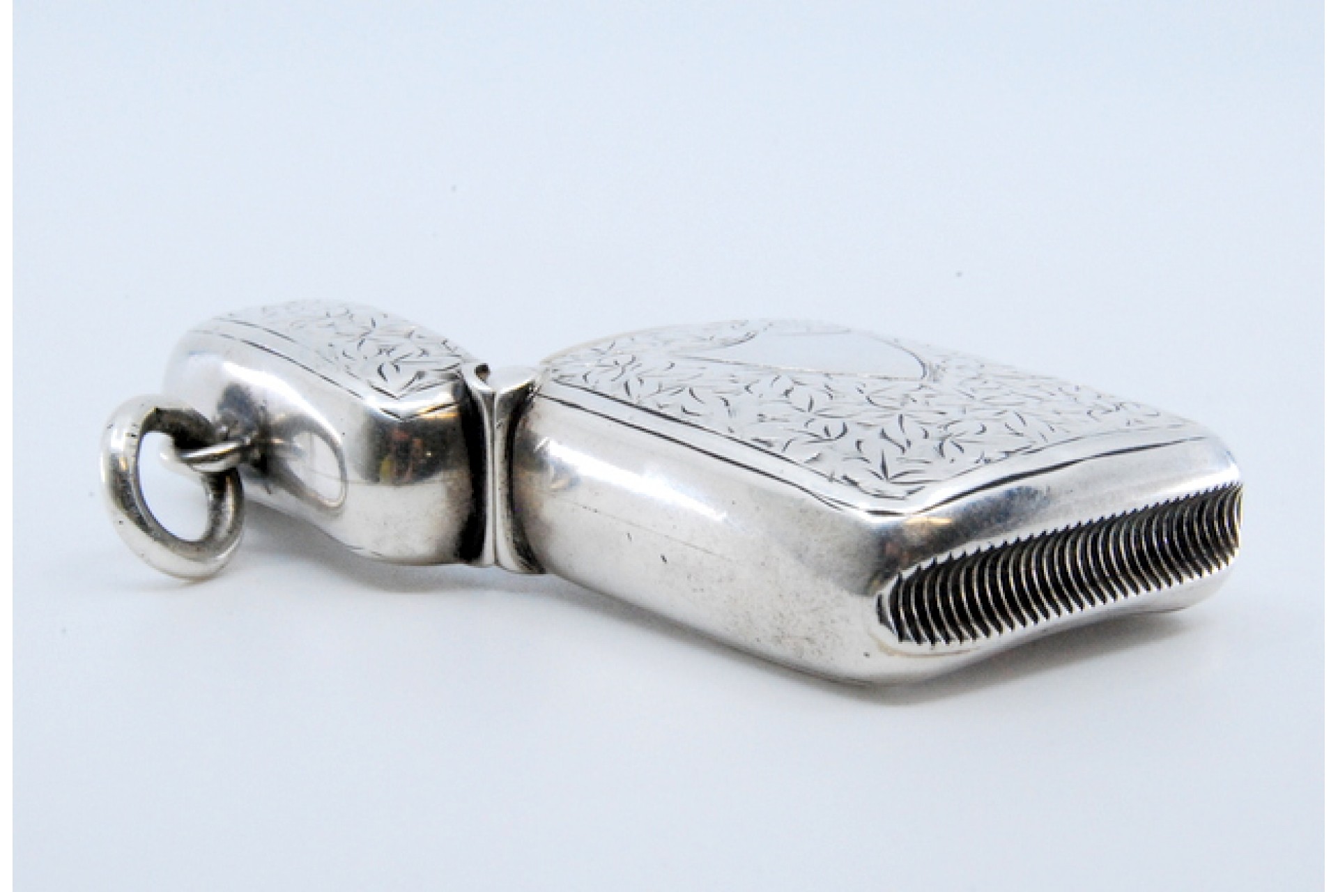 • Descrição: Fosforeira em prata com motivos vegetalistas gravados envolvendo cartela para monograma e tampa basculante.