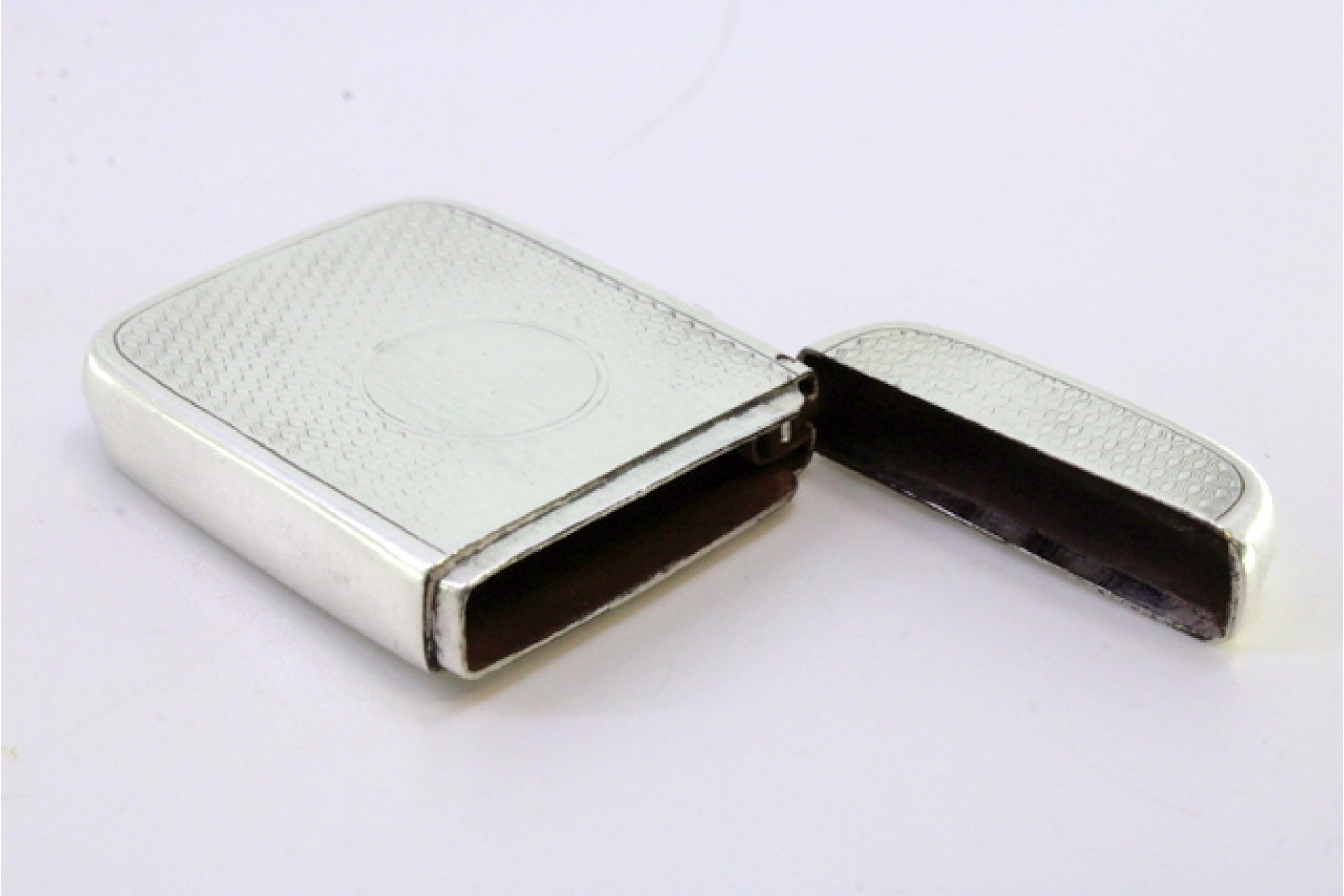 • Descrição: Fosforeira em prata guilhochada envolvendo cartela para monograma e tampa basculante, período Vitoriano.