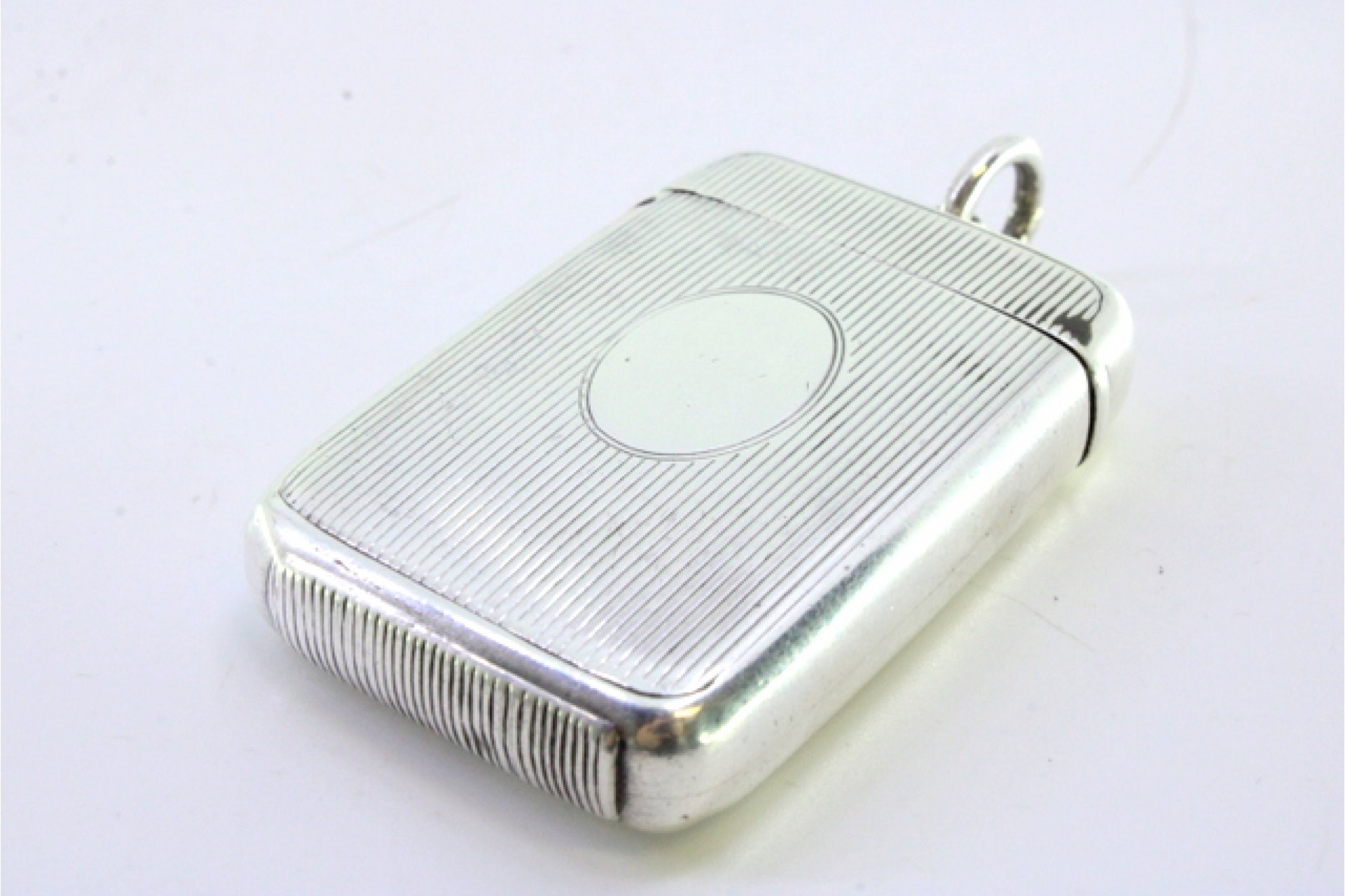 Fosforeira em prata com frisos ao alto envolvendo cartela para monograma e argola de suspensão.