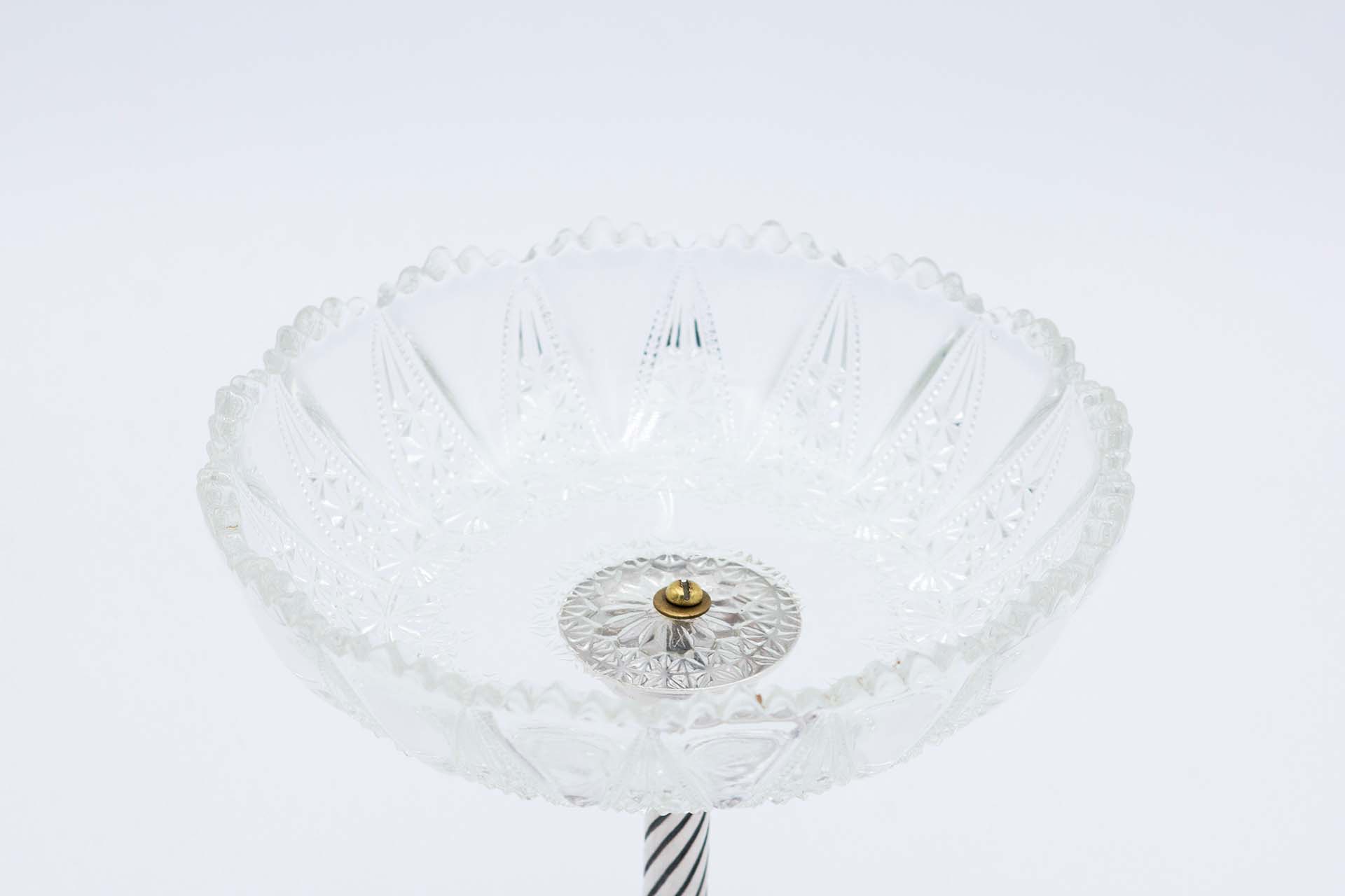 • Descrição: Fruteira centro de mesa em vidro lapidado com estrutura em prata, coluna torcida e base com gravados e motivos florais relevados.