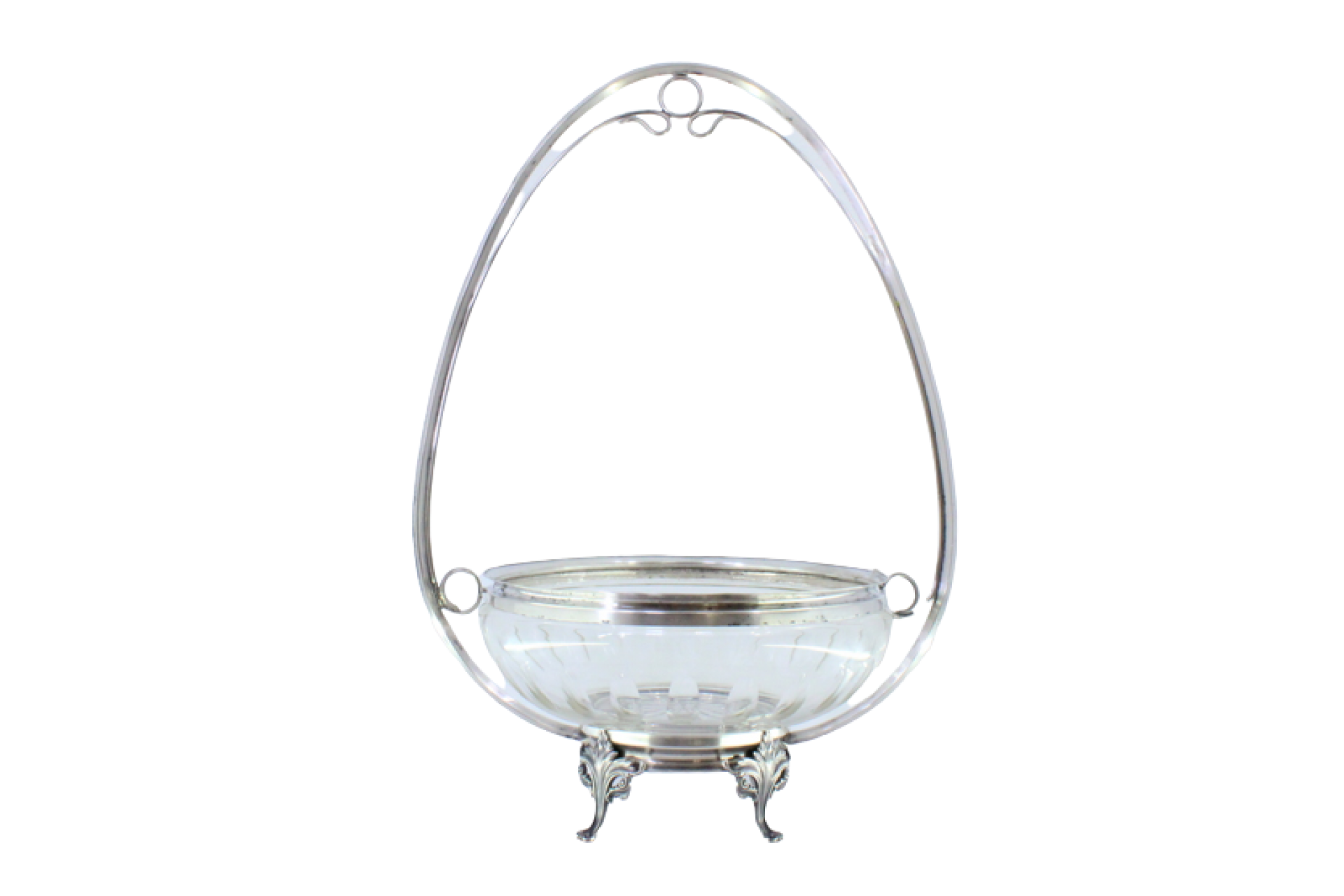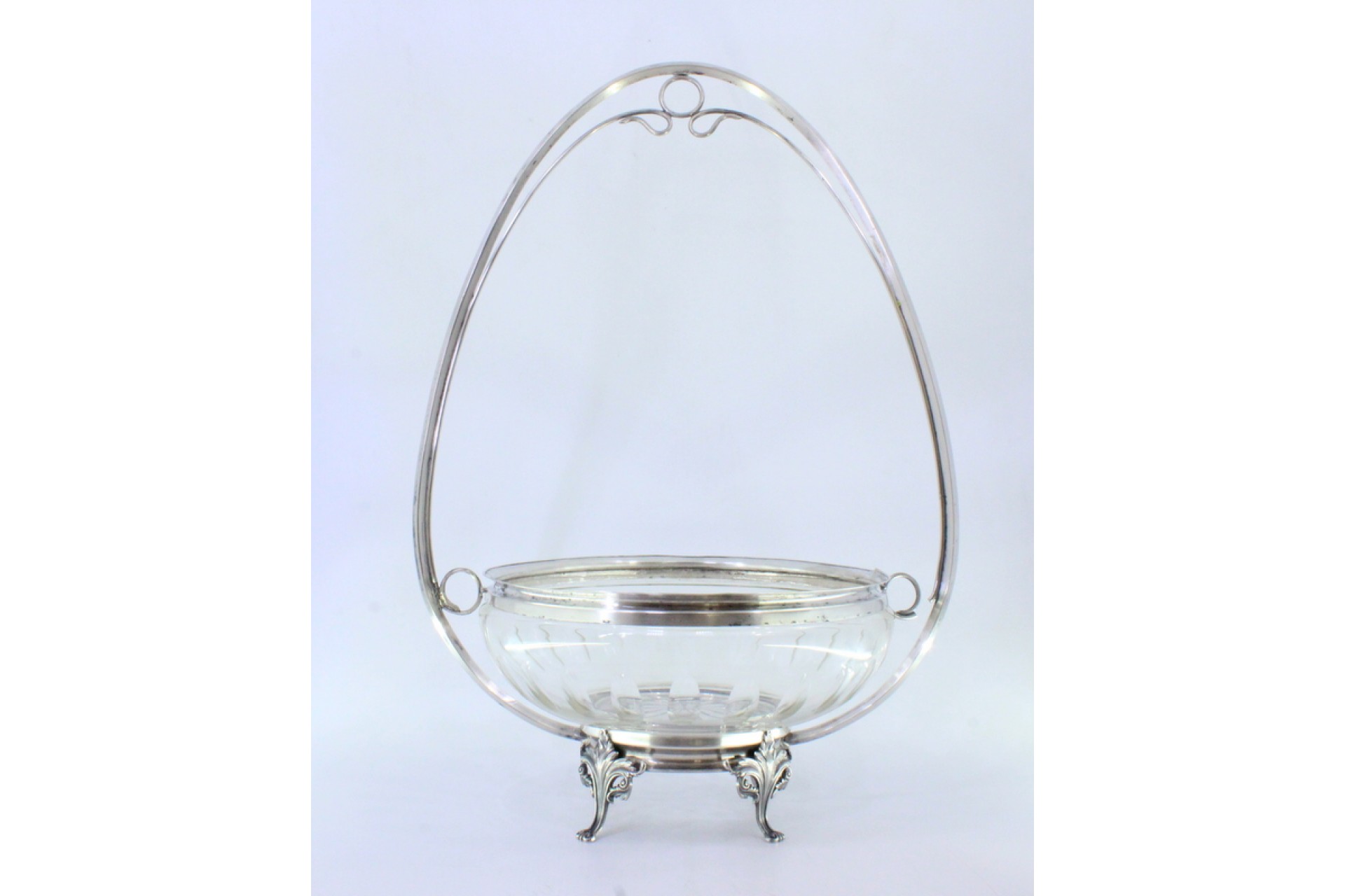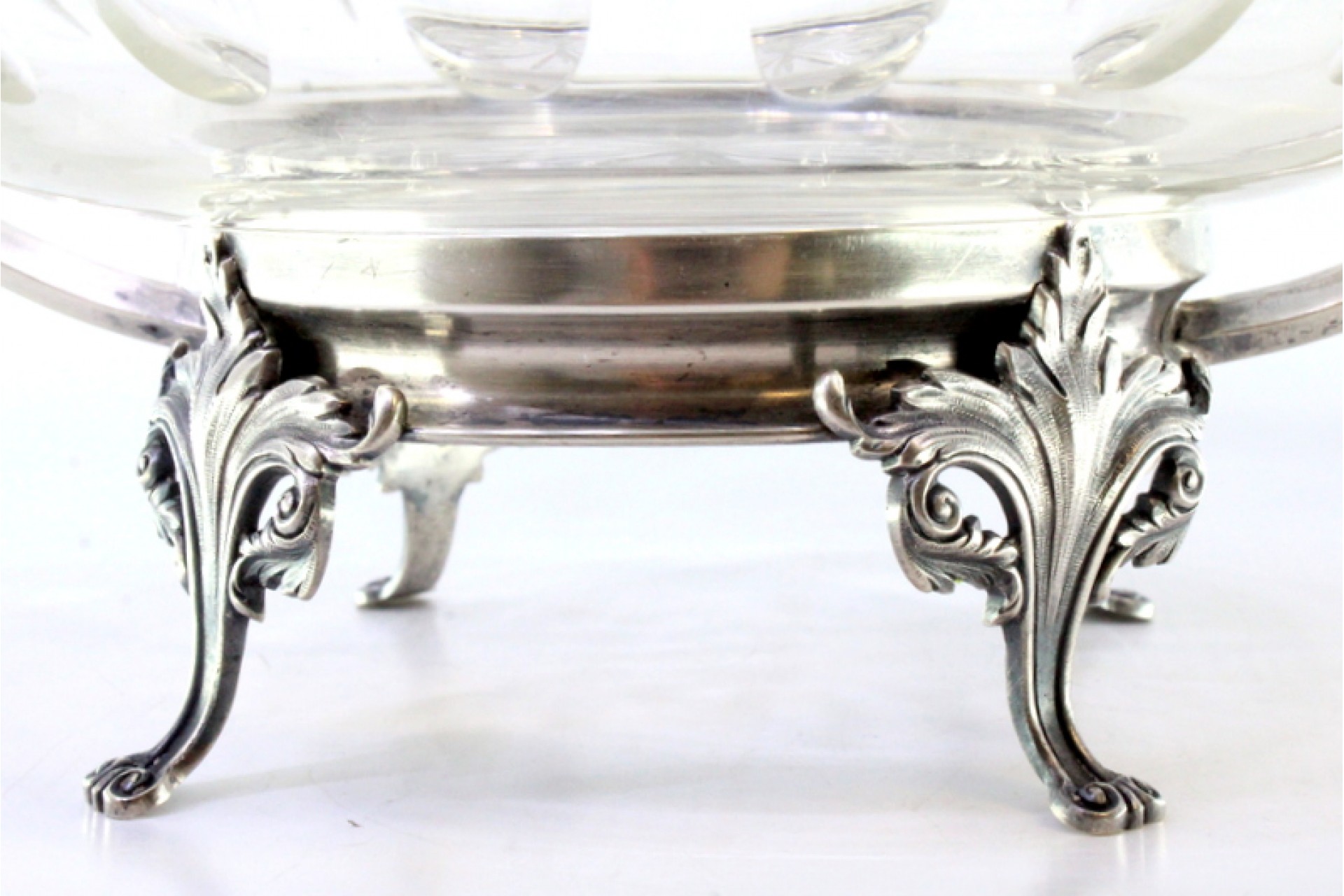 Fruteira com alma em vidro lapidado com estrutura em prata e assente em quatro pés com relevos e aplicações