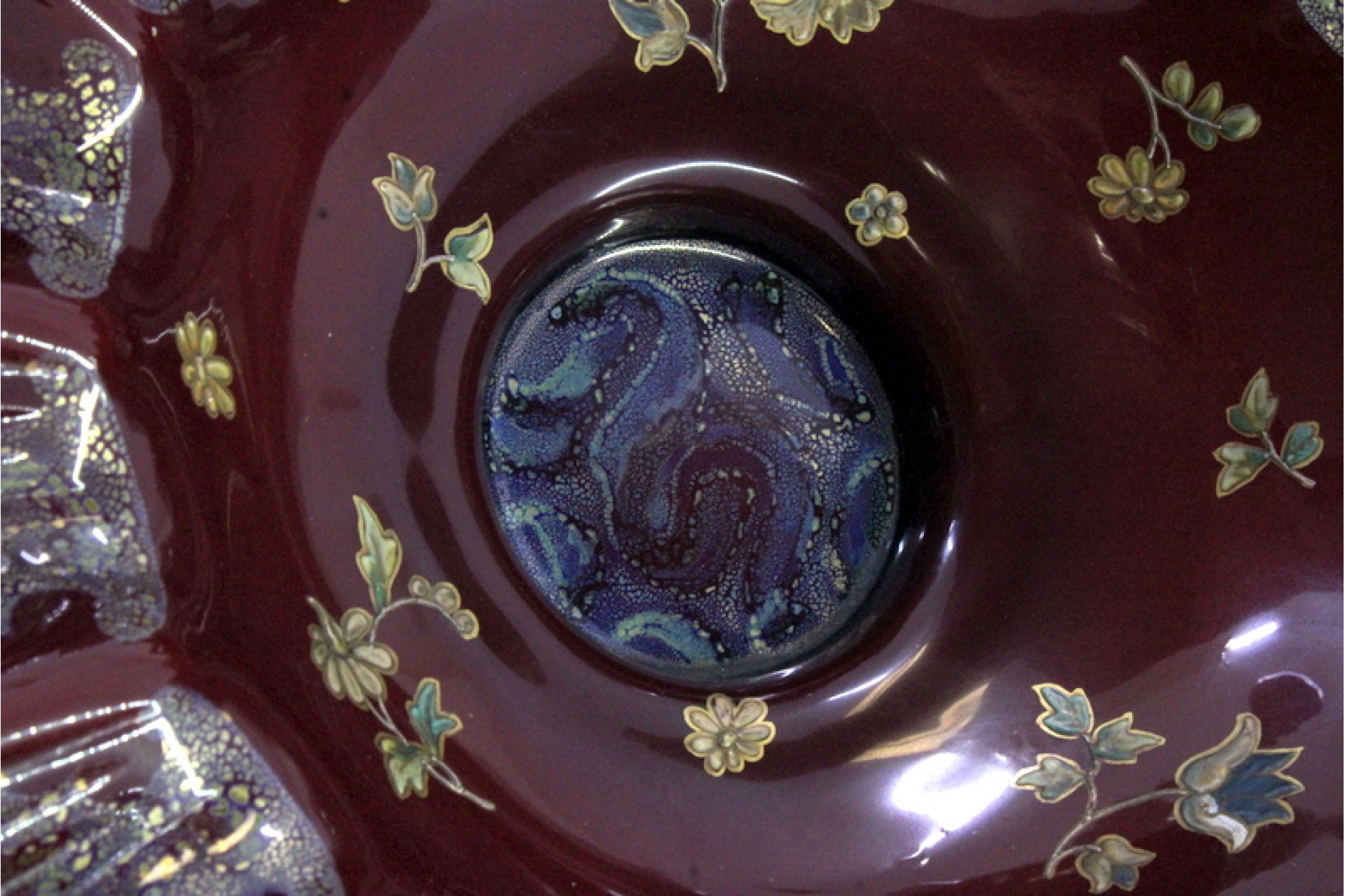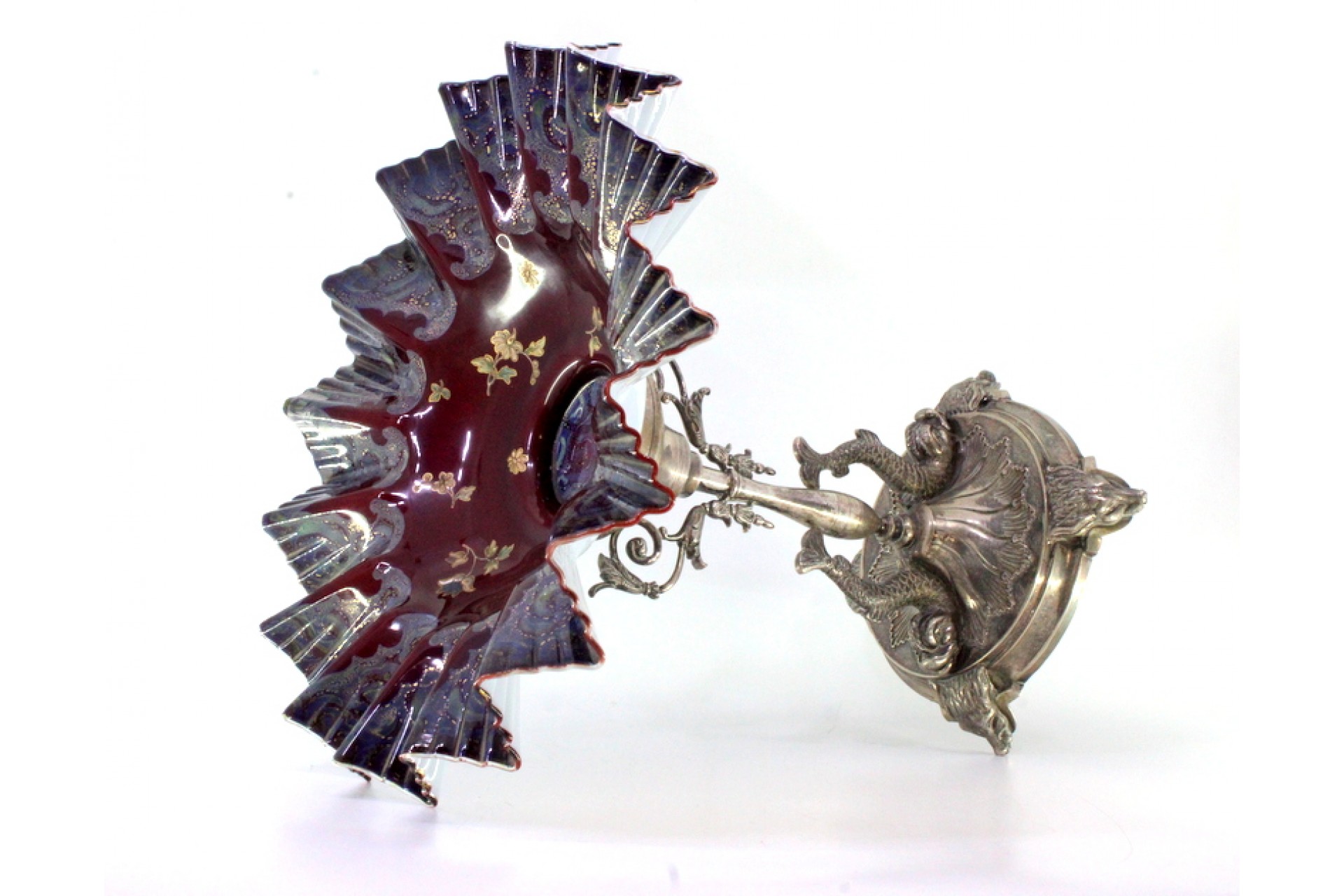 • Descrição: Fruteira com estrutura em prata recortada com figuras de peixes assentes em base relevada com figuras de lobos suportando a taça de vidro ondeado,  motivos florais definidos em dourado sobre fundo borderaux.