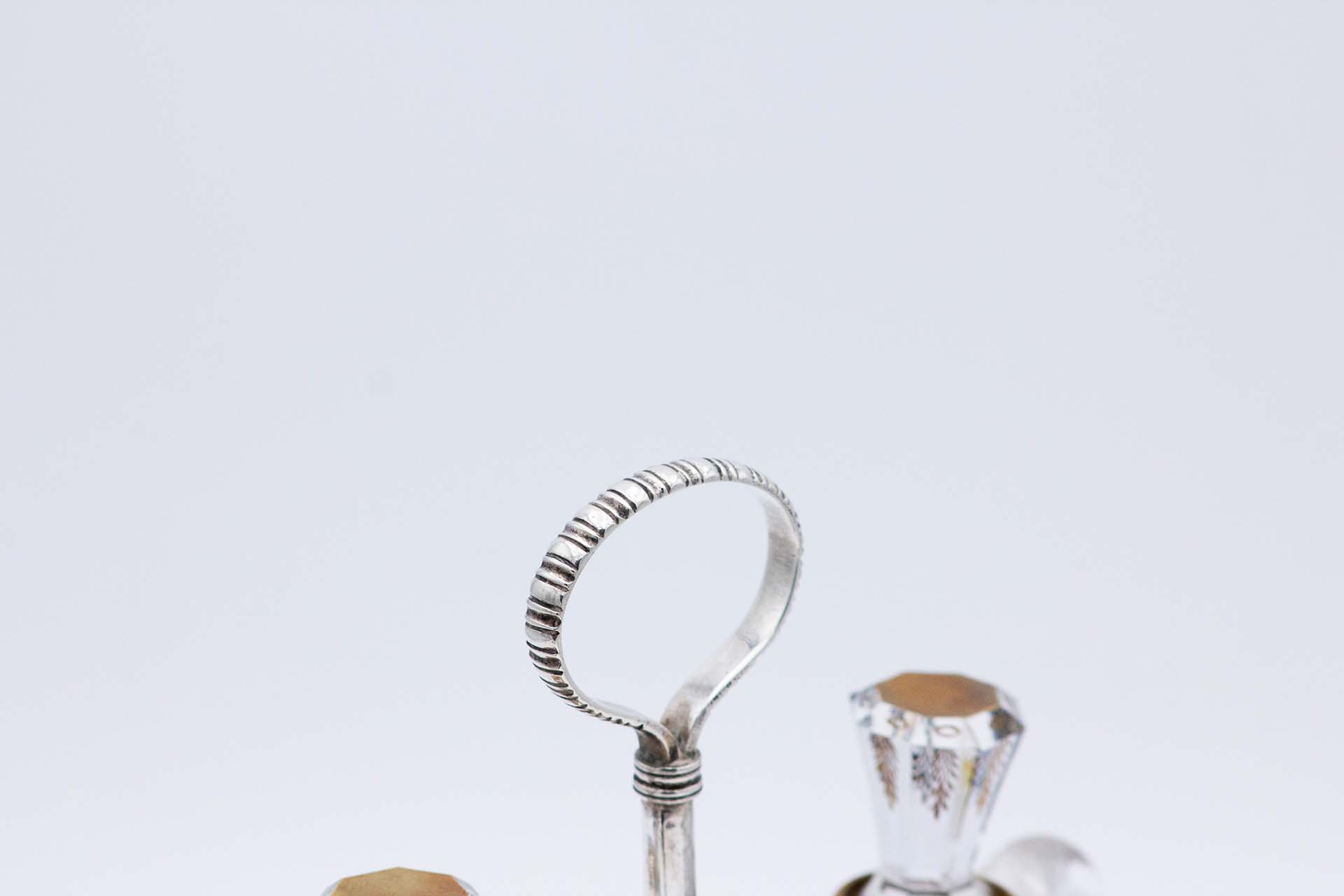 Galheteiro com estrutura em prata de forma elíptica com frisos envolventes, assente em quatro pés circulares e galhetas em vidro com dourados de parras.