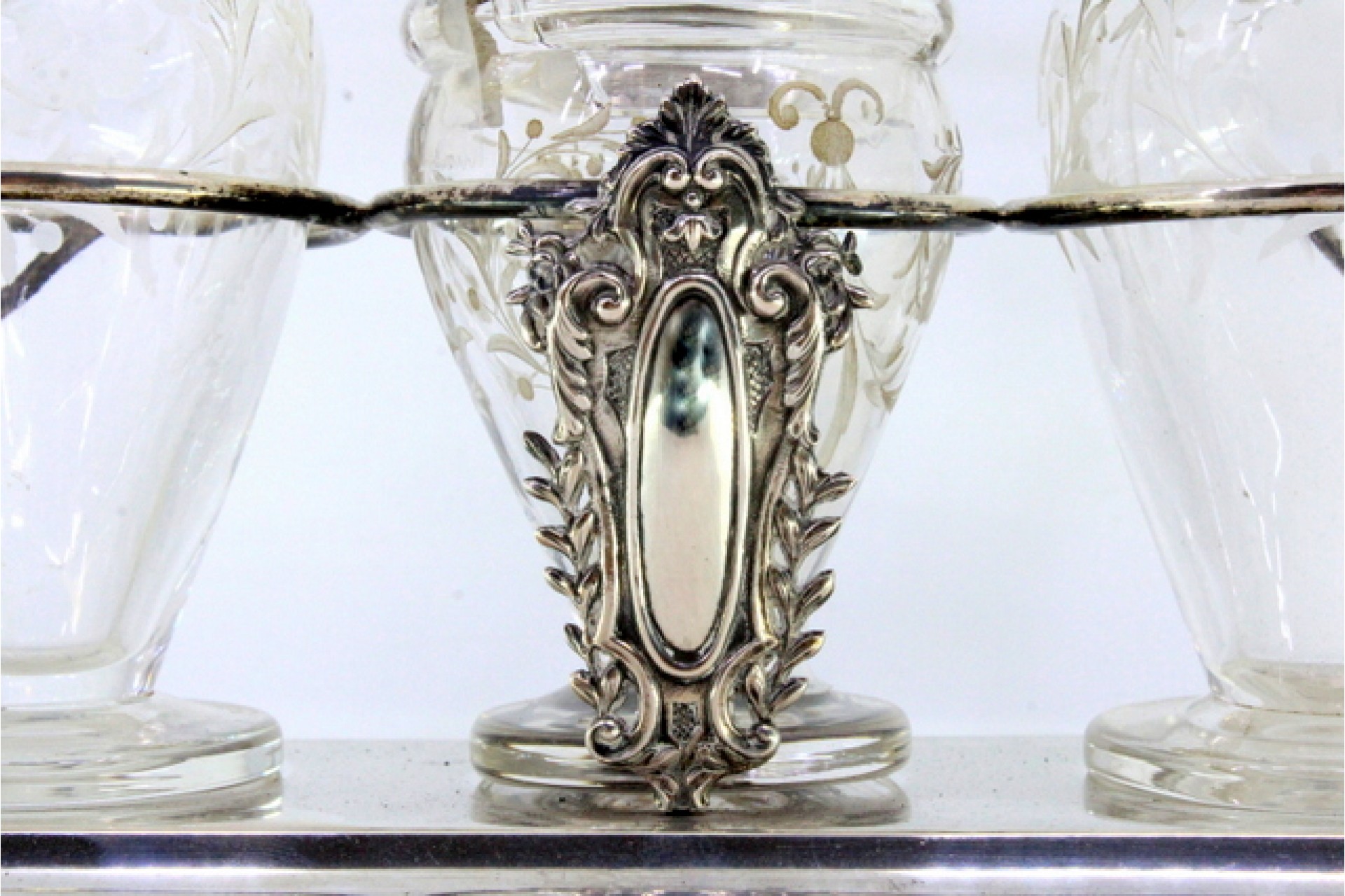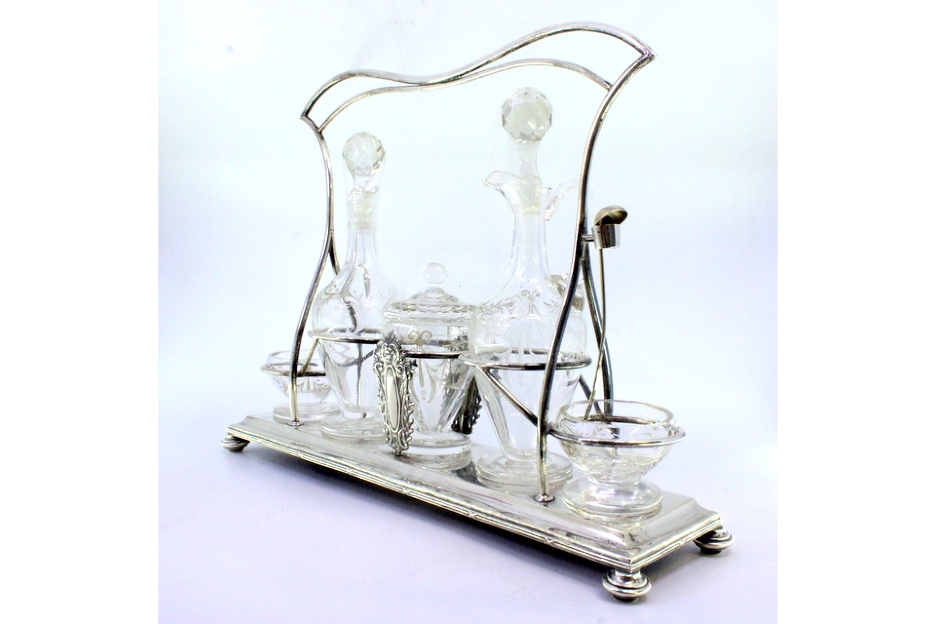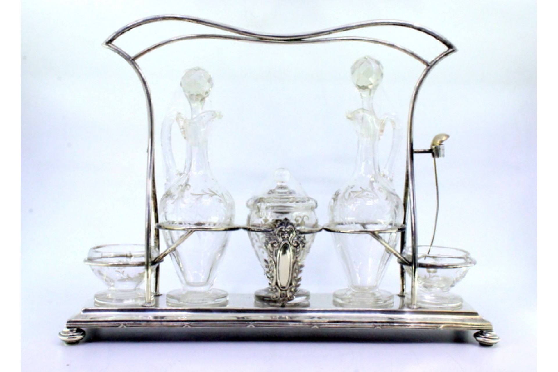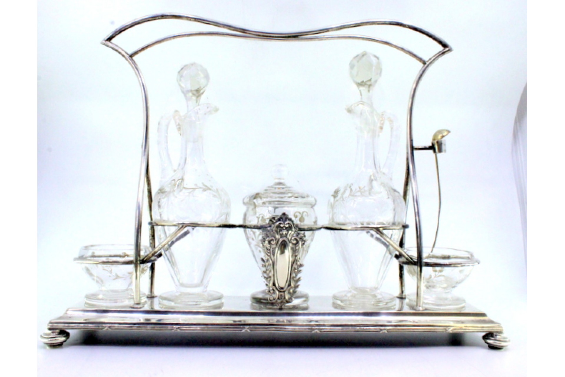 Galheteiro com estrutura de prata com cartelas para monogramas com saleiro, pimenteiro, mostardeira e galhetas em vidro gravados a acido.