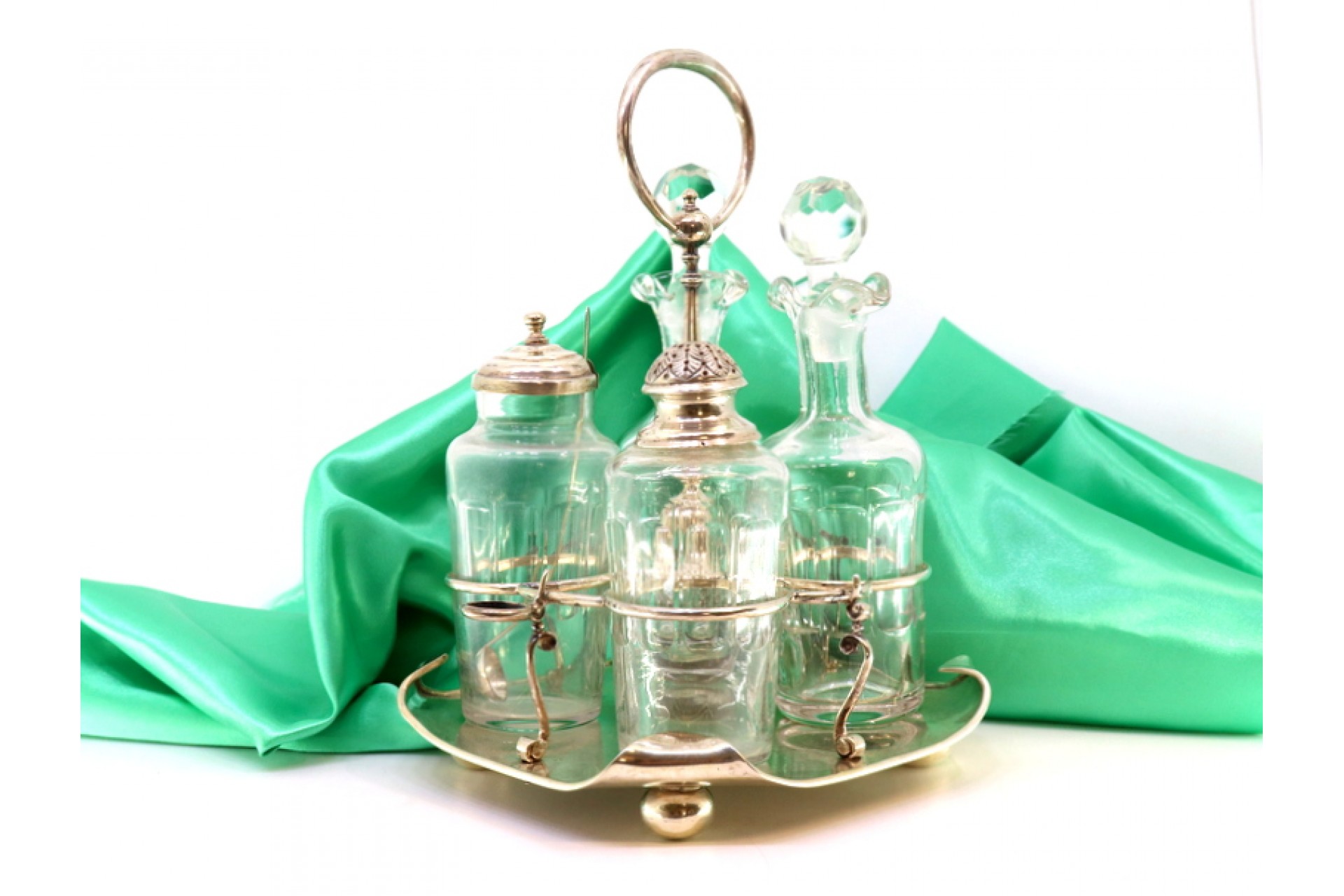 Galheteiro com estrutura de prata com saleiro, pimenteiro, mostardeira
