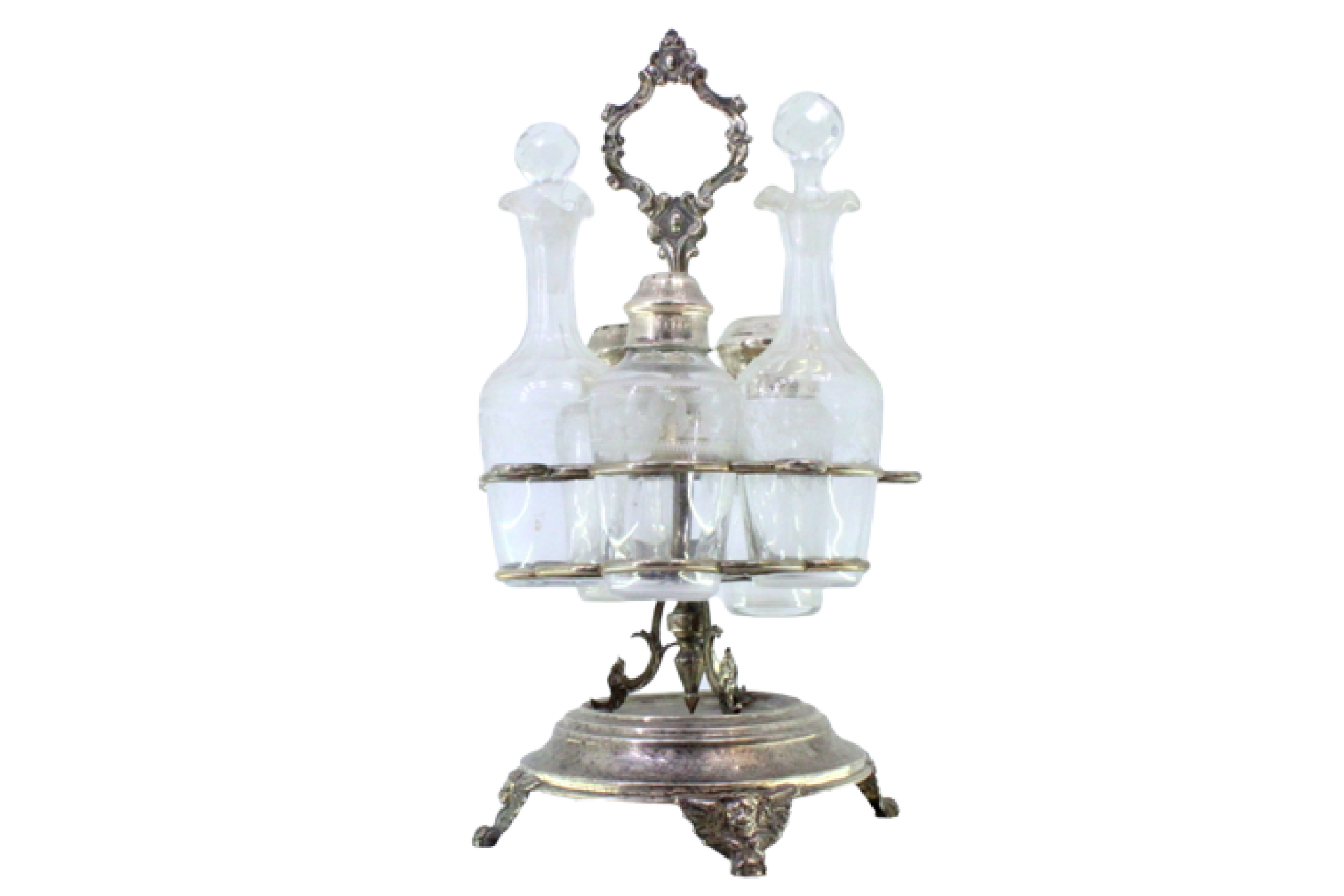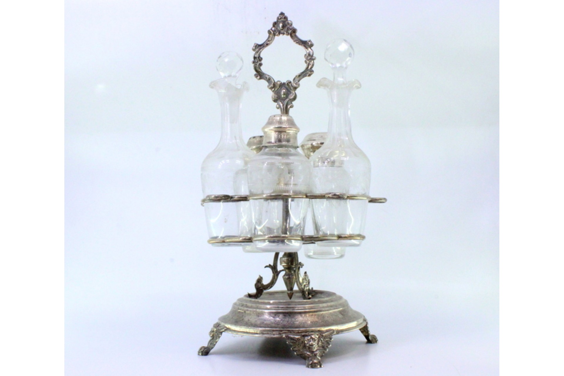 Galheteiro com estrutura em prata com galhetas lapidadas, saleiro, pimenteiro, mostardeira, suportes para as tampas e assente sobre base circular em três pés com mascarões.