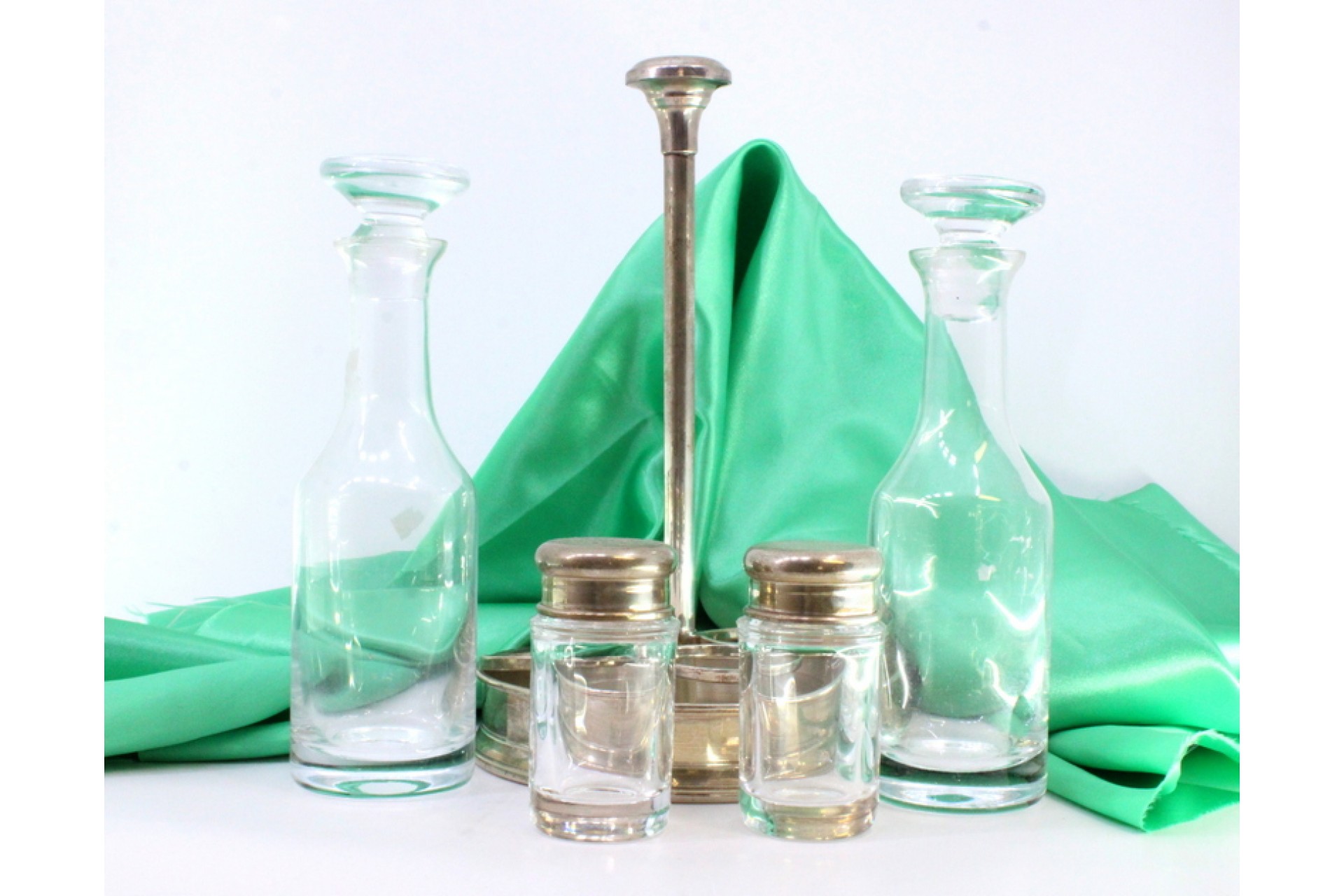 Galheteiro com estrutura em prata e duas galhetas em vidro, saleiro e pimenteiro
