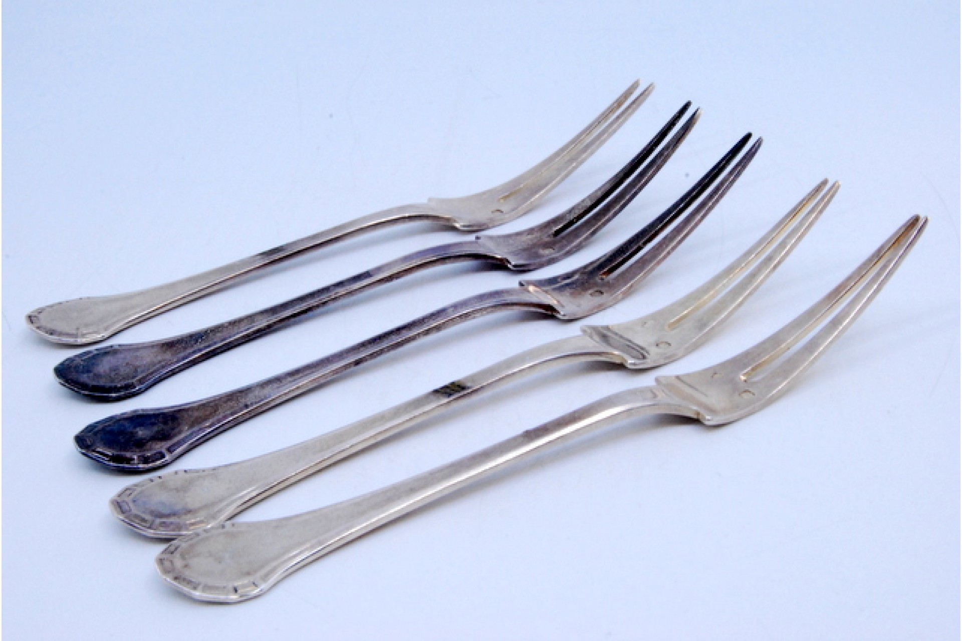 Conjunto de cinco garfos de prata para pickles com cabo revelado.