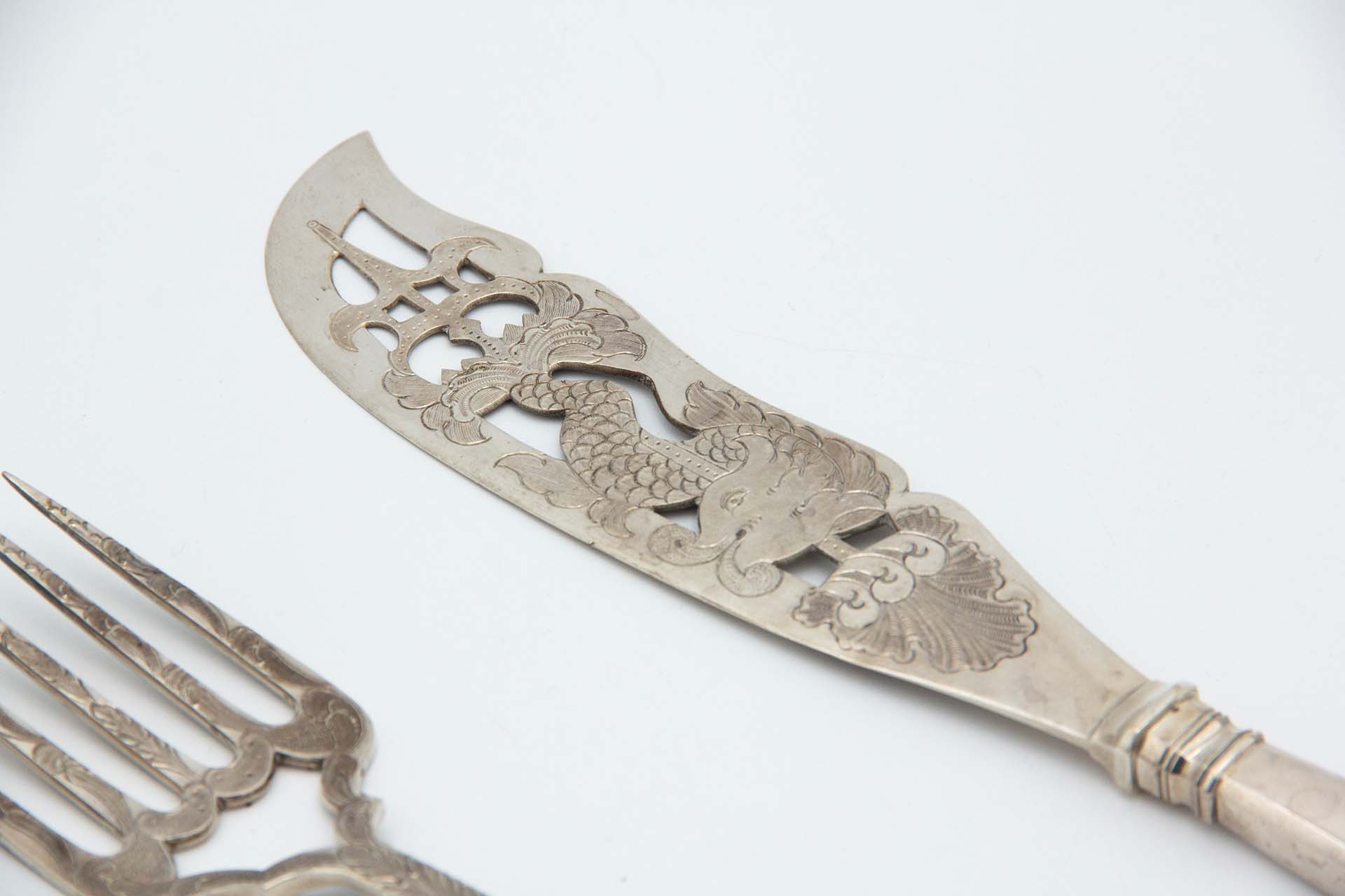 • Descrição: Faca e garfo para serviço de peixe em prata com recortes e gravados cinzelados e cabos relevados.