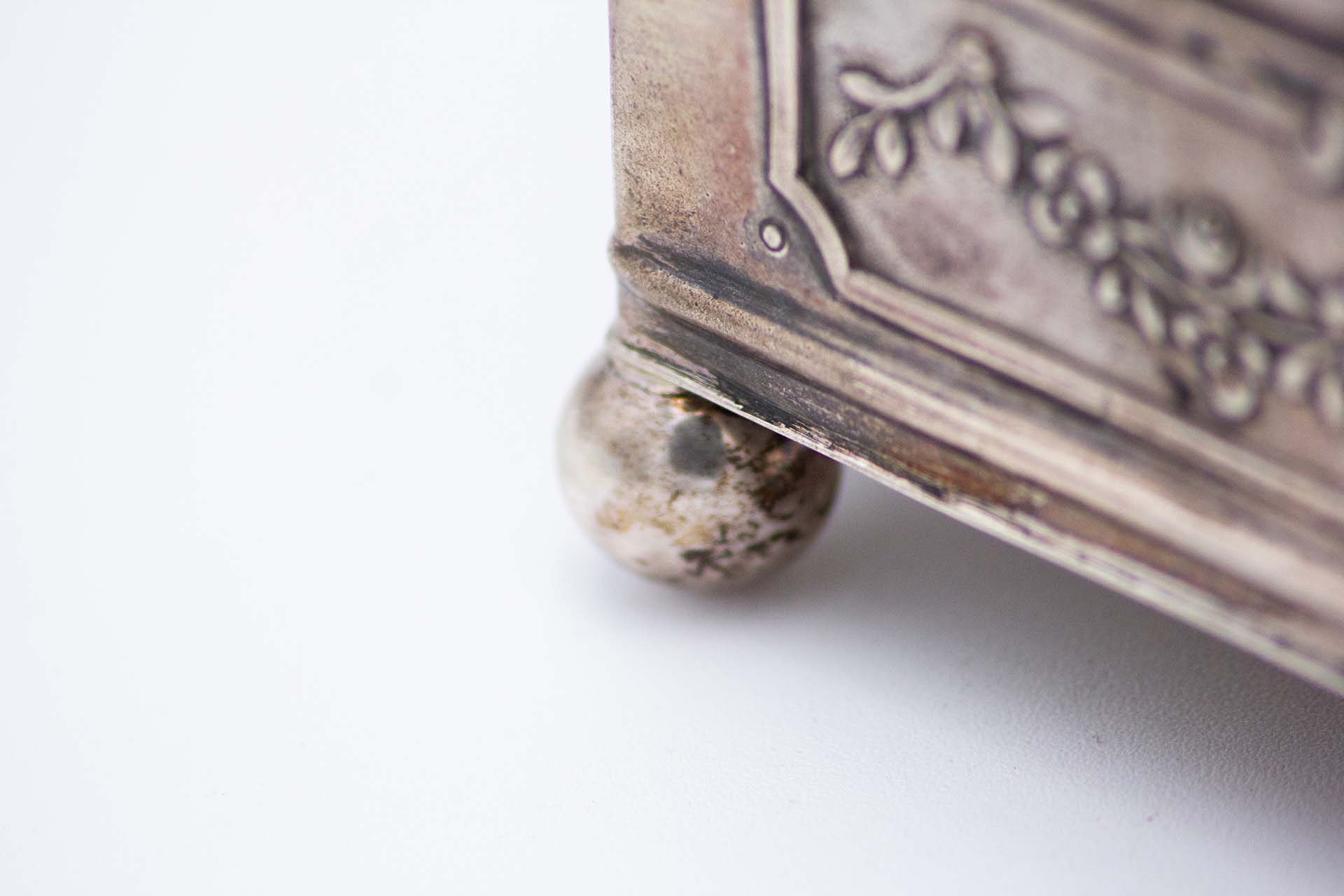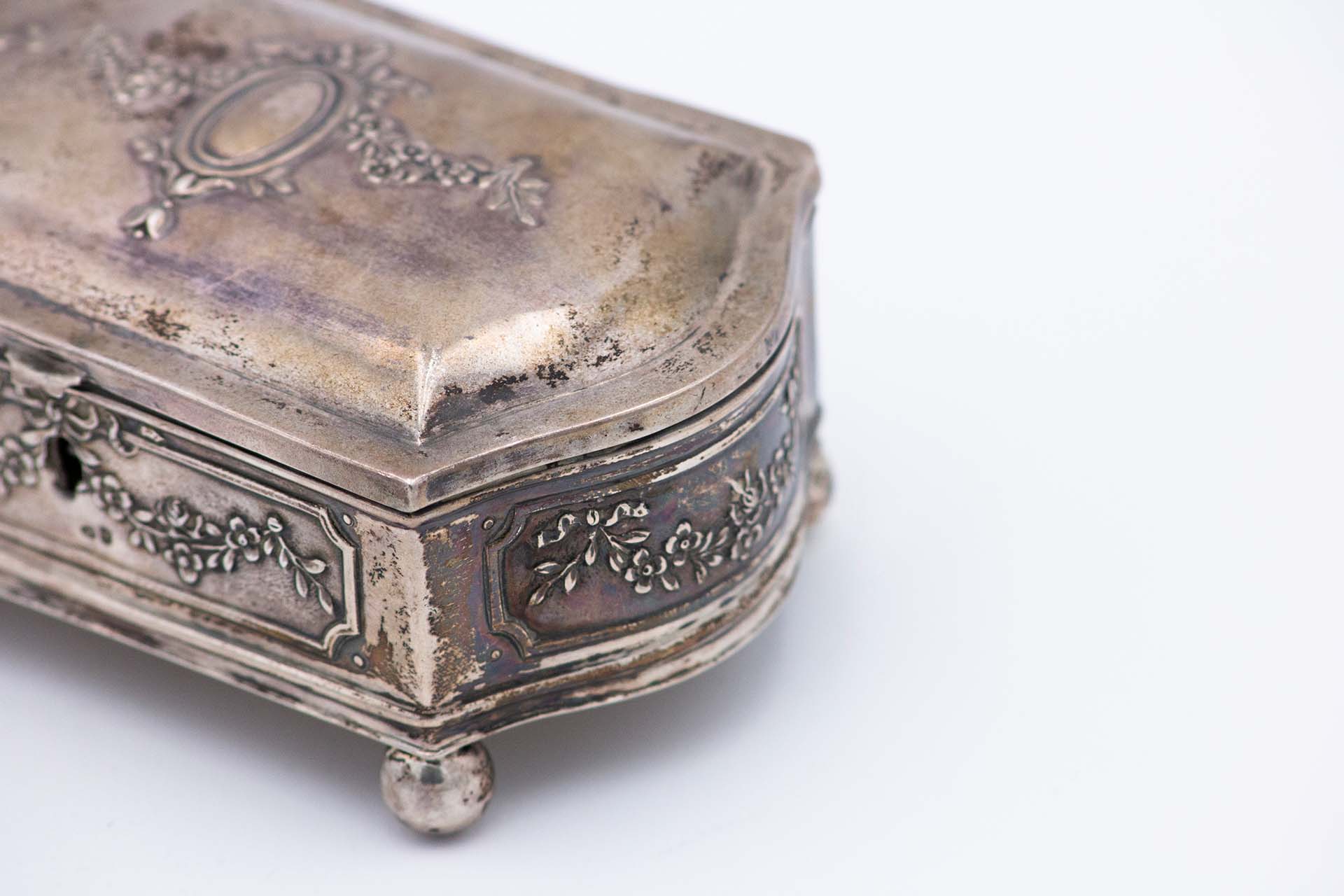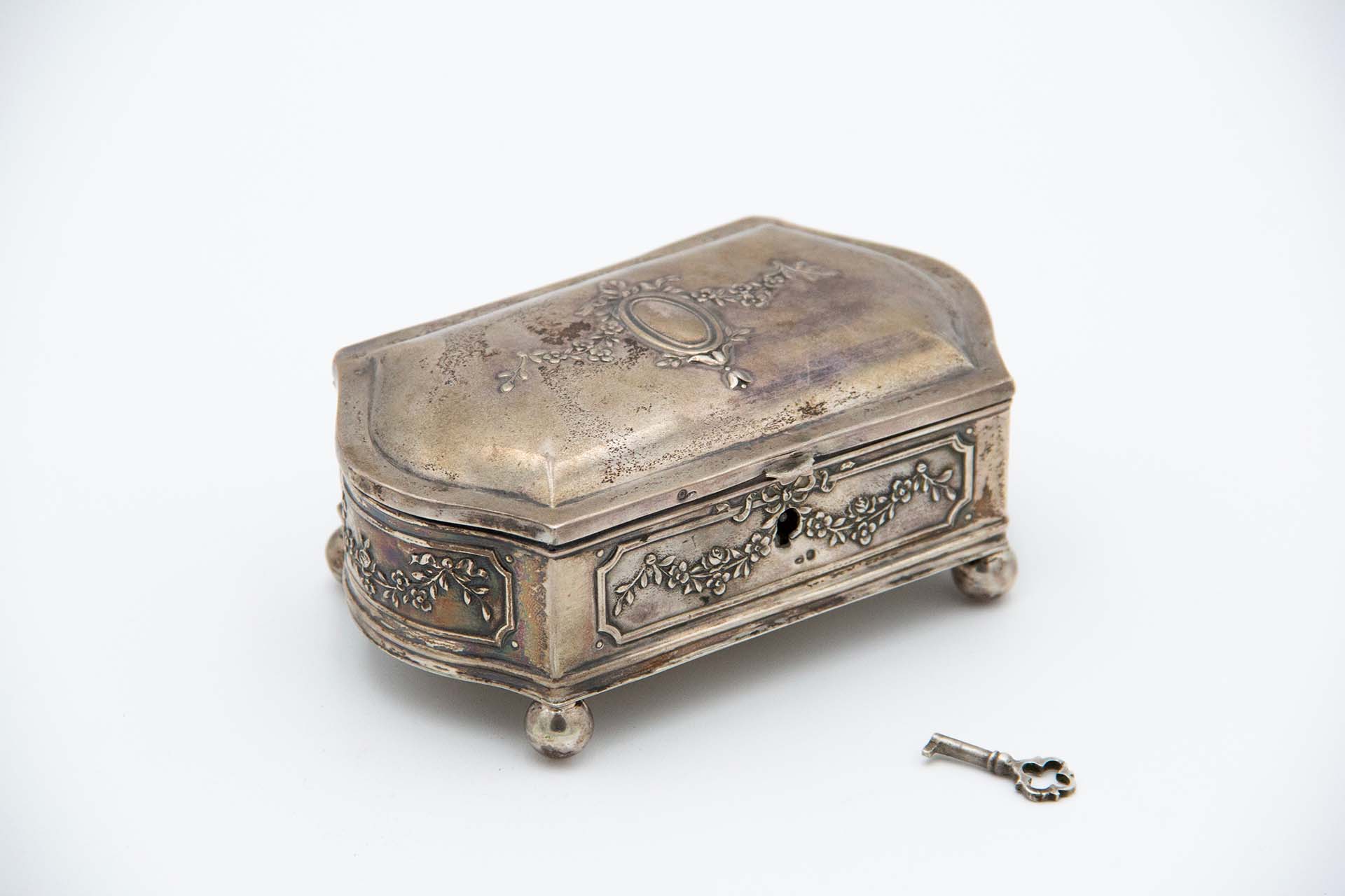 • Descrição: Guarda joias de prata relevada com quatro pés de apoio de formato esférico, tampa basculante com laços envolvendo catela para monograma.